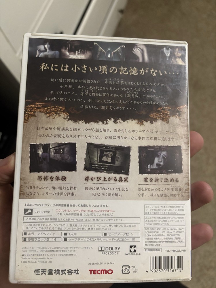 (Caution: Will not play on a standard American wii, has to be either hacked or a japanese wii or a pc emulator) Step into the world of "Fatal Frame: Mask of the Lunar Eclipse" for the Nintendo Wii, a thrilling addition to the acclaimed horror adventure series. This Japanese version, complete with its original manual, delivers an immersive experience with its intense blend of horror and adventure gameplay. Released in 2008 by Nintendo, the game is a must-have for fans and collectors alike. It offers a gripping storyline set in a richly detailed environment, ensuring hours of engaging gameplay. The complete edition ensures you have everything you need to dive straight into the action.