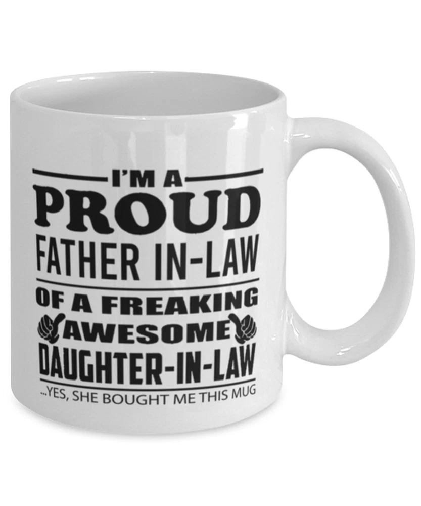 Father In Law Funny Coffee Mug Proud Father In Law Of A Freaking Awesome Product Details.. This high quality 11oz. ceramic white mug has a premium hard coat that provides crisp and vibrant color reproduction sure to last for years. Perfect for all hot & cold beverages. The highest quality printing possible is used. It will never fade no matter how many times you wash it. Material: 100% Ceramic. Print both sides. Dishwasher and Microwave Safe. High Gloss + Premium White Finish. Printed in the U.S.A. Personalized & Custom. We support personalized and custom mug to add custom, when placing an order, you can add notes to the "order note" in shipping address section. Also you can contact us directly via message. Shipping Info. Ready to ship in 1 to 2 business days, All products are made-to-order and proudly printed in the United States. Shipped by USPS and DHL, You will receive your order in 5-7 days. Replace & Refund. All products are defective during shipping broken, chipped will be replaced free of charge. You are not satisfied with the product, we will refund 100% money to you. If any other issues arise, please do not hesitate to message, we would be more than happy to assist you.
