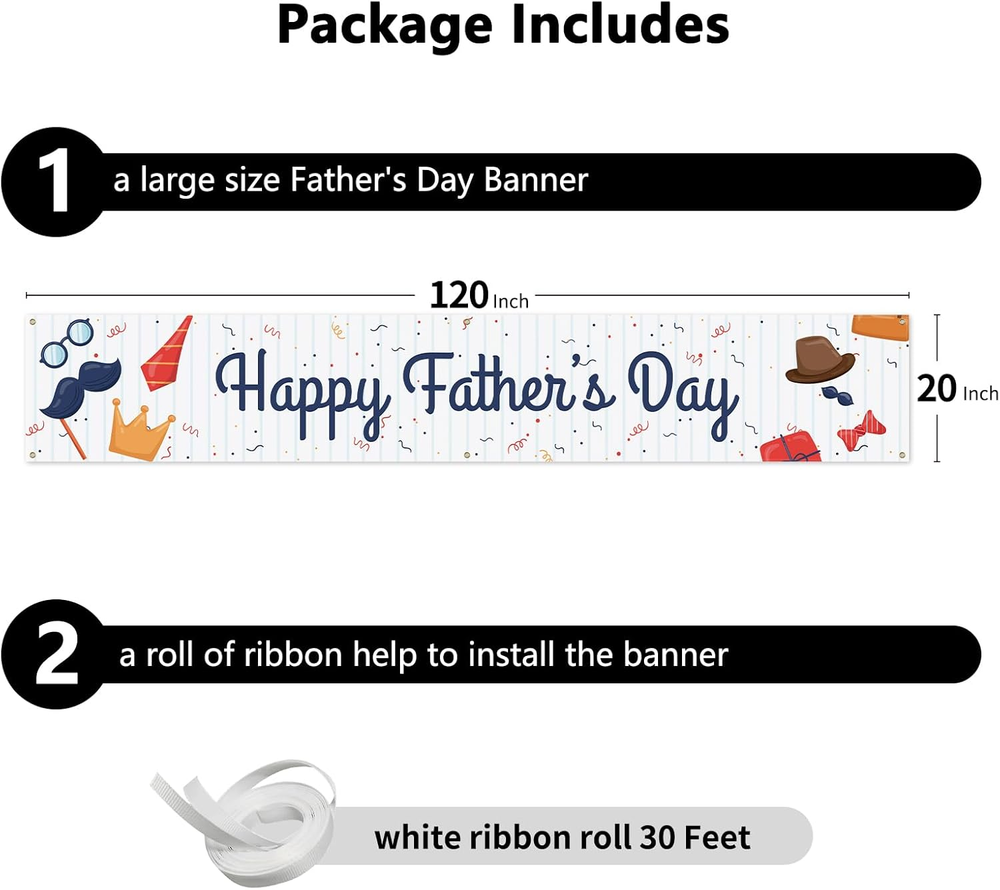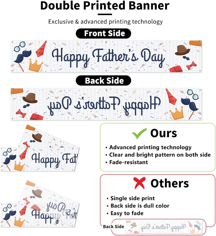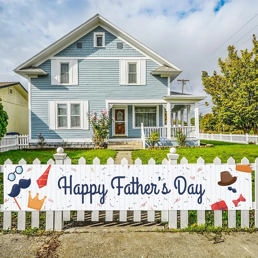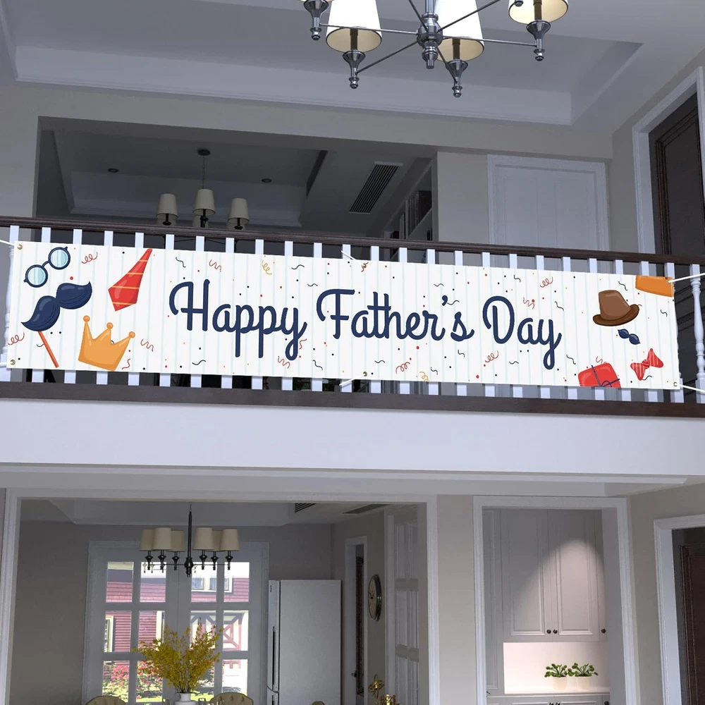 [Extra big Happy Father's banner] Large size 120" x 20"/10 x 1.67 Feet in this banner. This beautiful entertaining banner is a nice decoration for holiday. A great stuff to decor your home, garden, yard, outdoor, garage, patio, balcony, fence, office, party, gatherings and rooms. [Double sided printed technology] Using exclusive and advanced two sided printing technology that the banner can be seen bright colors on each side. Made of durable polyester cloth fabric, ensures it has very long life for using on any weathers, waterproof, and durable. [Easy to hang] It has 6 brass grommets which provide smart options for handing or supporting for people, and make sure banner is durable and strong. Coming with a roll of rope, easy to hang. The color of banner which is bright, vibrant, energetic, youthful, and lovely. Using advanced printing technology so that the pictures on banner are very clear, and no color fading. [Superb craftsmanship] Our banners have double stitching all around the edges. Making it neater and prettier. In addition, great craftsmanship is able to let the banner hang with durability. [Suitable for people and places] A great banner/flag/poster/bunting for people, friends, family, organizations, corporations, etc. And it's addition in outside, indoor, community, neighborhood, public, etc. Product description Probsin, professional manufacturer of Flags & Banners. We've made of premium quality materials with superior manufacturing technology and management. Happy Father's Day 2021! A special way to thank for your father. Show your message! Use to Installation No need to assemble when you get it Each corner has a brass grommet for hanging easily Come with a FREE roll of tie for hanging Premium Fabric Made from the high quality material and standards Brilliant bright color with nice printing technology UV fade resistant, waterproof, washable Durable Strong Brass Grommets Use COPPER as brass grommets, high quality accessories Unique installation way, make it very strong and durable under no matter what the weather is Perfect decoration for Father's Day. Also a great gift idea to thank for your dad. Party & Dinner Using this banner as party supplies that makes more joyful, warm, and distinctive. Give an unforgettable Father's Day party for your family, friends, colleagues, etc. Garden & Outdoor Can hang easily with brass grommets whether banner pole or fence. Really attract from bystanders in the street. Home & Indoor A perfect Father's Day decorations for home. Easy to hang on wall, outdoor, fence, garden, or others. Make your house sweeter. “Happy Father’s Day to the man who put the fear of Dad into all my dates.”