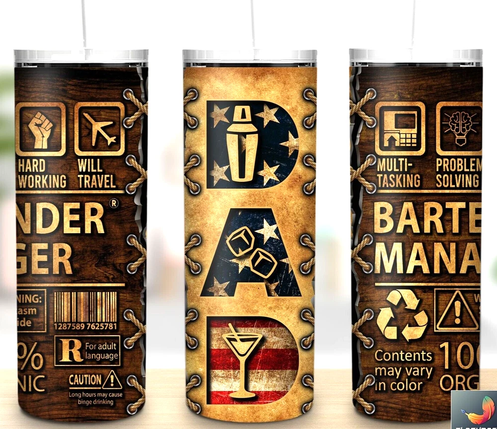 Fathers Day Bartender Multicolor 20oz Insulated Tumbler Lid Clear Straw New
