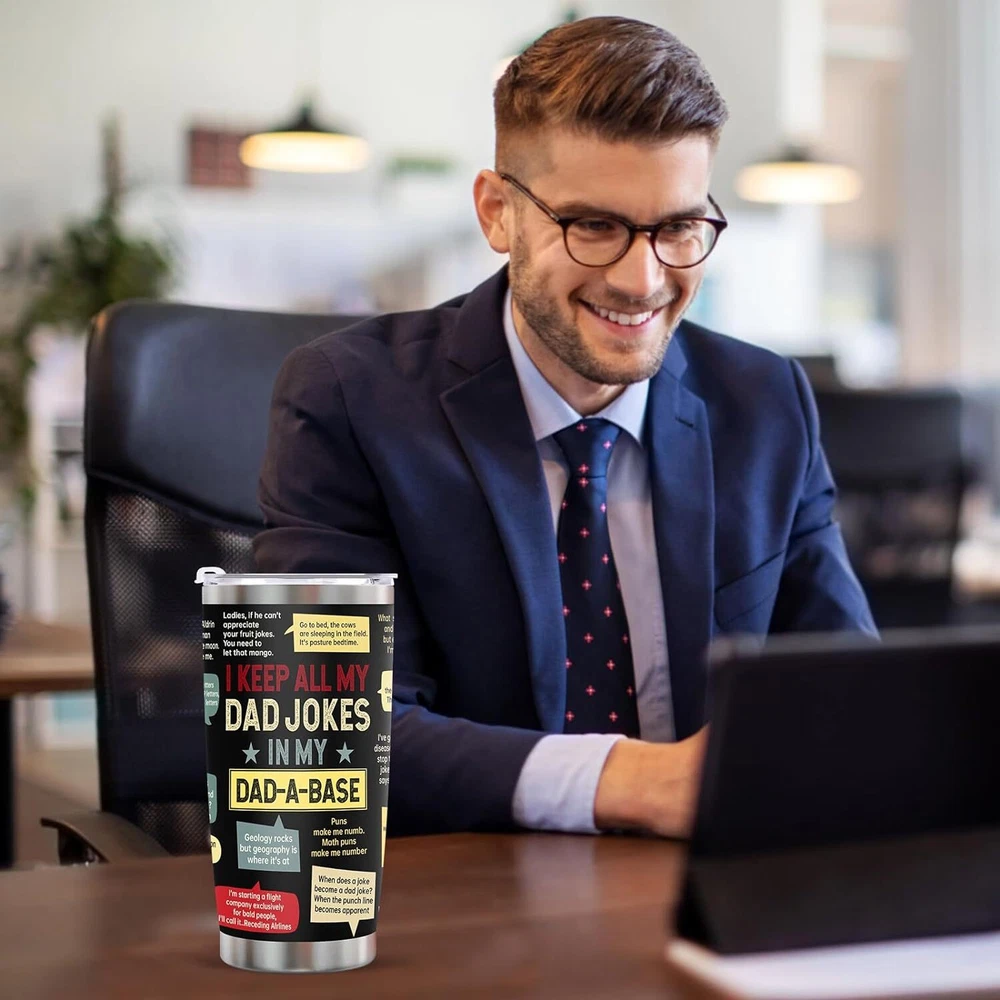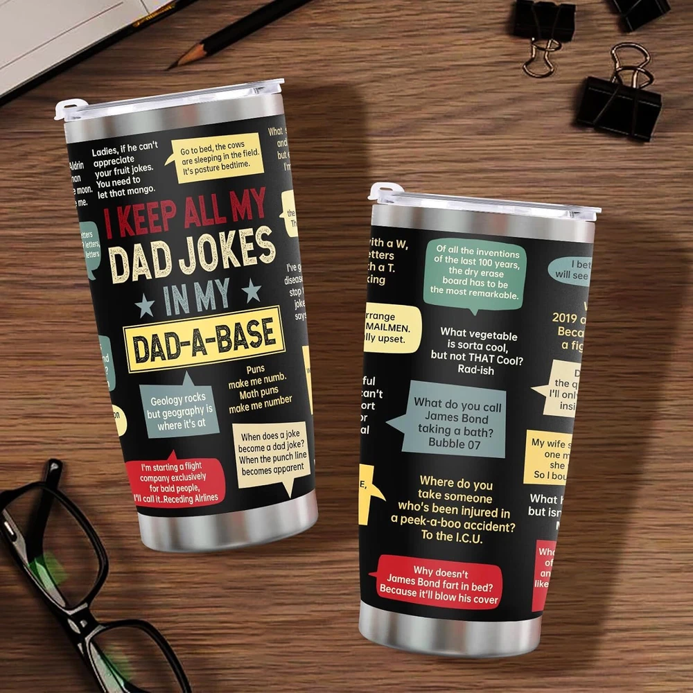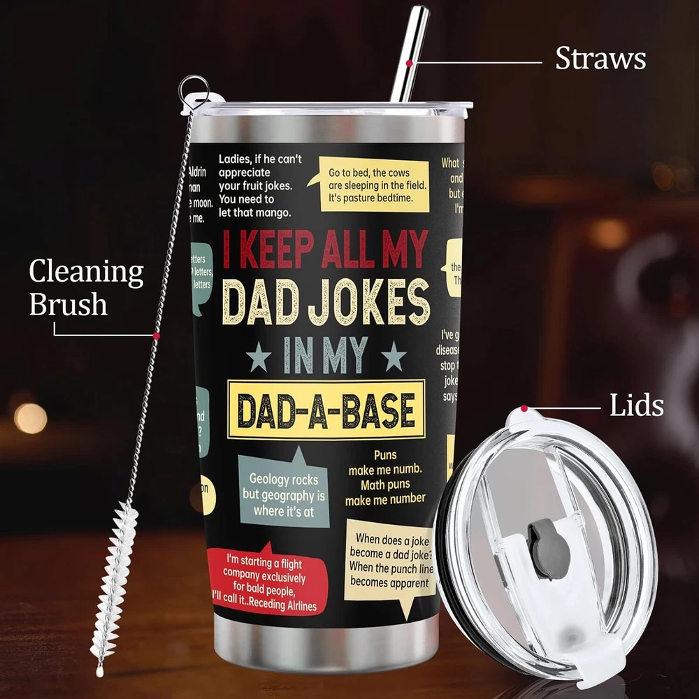 Fathers Day Dad Gifts from Daughter Son Wife, Funny for Jokes Product Details Brand: Ulrhpc Color: Dad Jokes Special Feature: Manual Style: Casual Theme: Holiday MaterialCapacity: Stainless Steel1.3 Pounds FATHERS DAY GIFTS:A great gift for father's day and Perfect for dad or grandpa, men, 40th, 50th, 60th, 70th, 80th, 90th birthdays. durable and practical, perfect gift for father's Day or birthdays.Unique Birthday Present Ideas For Father, gifts for men,gifts for dad ,gifts for husband, gifts for new dad, step-father from daughter, son, Uncle Stepdad Dad Gifts. GIFTS FOR DAD : This funny tumbler is a great gift for any occasion, fathers day gifts for dad from daughter son wife, great for birthday gifts for dad, grandpa gifts, gifts for grandpa, dad mug dad gifts for birthday, dads birthday gifts ideas, mens gift ideas, christmas gifts for dad, dad christmas gifts, dad gifts for christmas. It also makes a terrific choice for Birthday, Christmas, Thanksgiving, retirement, Valentine's Day, and Father's Day events. GIFTS FOR DAD FROM DAUGHTER, SON, KIDS – The dad tumbler is suitable for any indoor or outdoor place. Let your dad enjoy his favorite drinks no matter where he is with this stainless steel tumbler. Sturdy and leak-proof, it’s great for both outdoor and indoor use. Bring this tumbler with you next time you go to a picnic, hiking adventure, RV tour, beach outing, or fishing trip. DAD GIFTS: Suitable for Father day, Friendship, Thank you, Christmas Birthday Retirement or Any Anniversary gifts for men who have everything. The 20 oz capacity can let you keep enough water. Wine, beer, coffee, drinks, champagne, cocktails, and other alcoholic beverages are all suitable. It's suitable for both indoor and outdoor use. Lake, beach, swimming pool, office, parties, picnics, patio, BBQ, and camping should all be ideal companions. PREMIUM MATERIAL: This tumbler is made of premium 304 food-grade stainless steel.this tumbler is Durability, unbreakable, rust-resistant, and doesn't transfer the flavor of your drinks. Double vacuum insulated,The BPA-free clear lid that seals the cup tightly keeps spills under control,at just the right temperature for up to 9 hours, depending on the outside temperature.