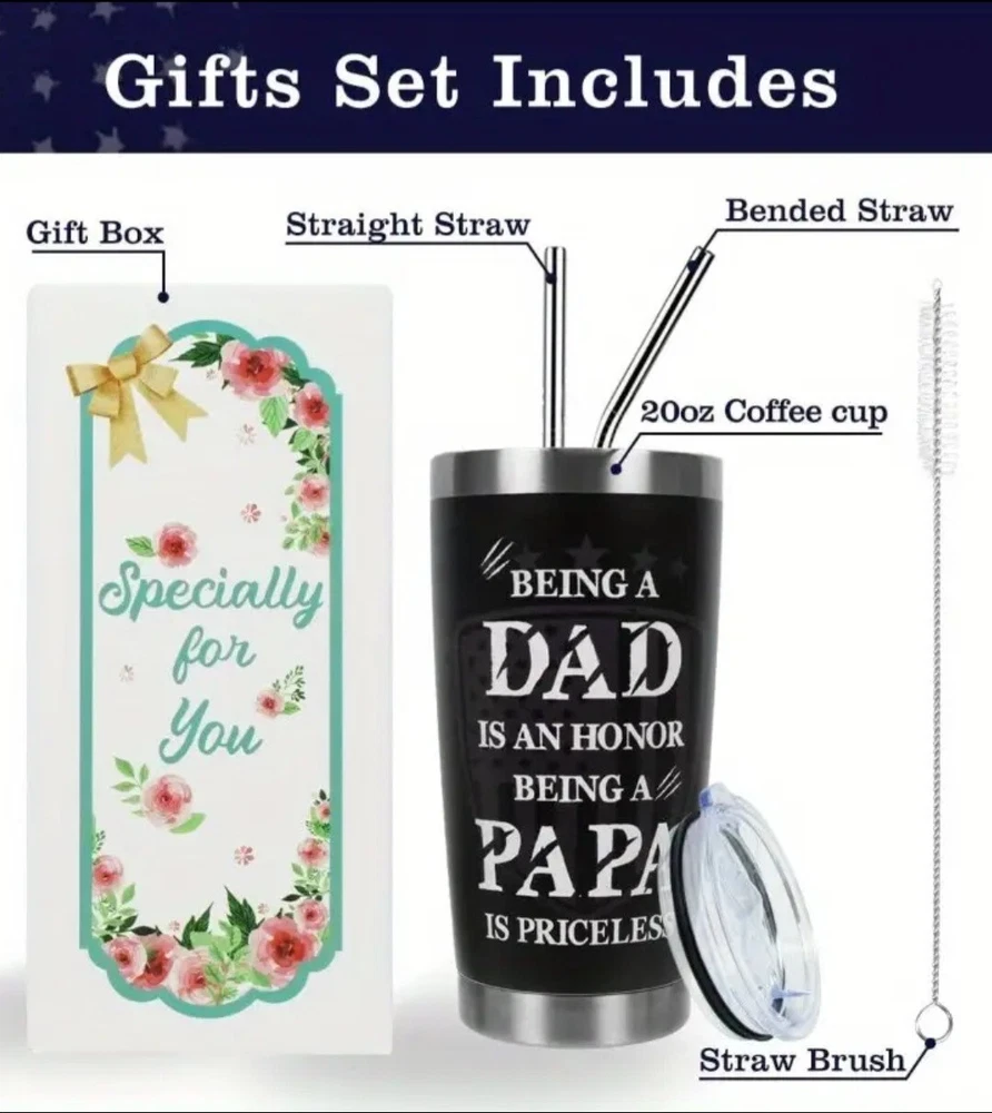 This 20 fluid ounces tumbler is a perfect gift for Father's Day, or any occasion where you want to show appreciation to a dad, stepdad or father figure. Made of 18/8 food-grade material, this tumbler is dishwasher safe and comes with a lid, bended straw, straw brush, and gift box. The tumbler features a flag print pattern and is decorated with various themes such as letters, numbers & words, Christmas, family & friends, hobbies & crafts, and more. The vacuum insulated tumbler is designed to keep your drinks cold or hot for hours. The product dimensions are 2.7"W x 6.7"H, and it is a single item that serves one person. This tumbler is suitable for adults and can be used at home, office or on the go. Surprise your dad with this tumbler and let him enjoy his favorite drinks in style.