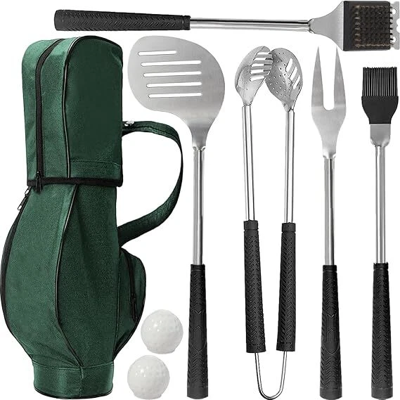Fathers Day Dad Gifts from Daughter Son Wife, Golf Grilling Gifts for Men 8pcs BBQ Grill Accessories Tools Utensils Set, Funny Father's Day Birthday Gifts for Dad Husband Grandpa Him Boyfriend Golfers Item Description About this item FATHERS DAY GIFTS FOR DAD GIFTS FROM DAUGHTER SON WIFE & KIDS, GOLF GRILL SET: 8pcs BBQ grill accessories set grilling tools gadgets kit includes golf club grill spatula, golf ball surface shaped barbecue tongs, grill brush & scraper cleaning tool, silicone basting brush, BBQ fork, 2 golf ball salt & pepper shakers, mini green golf bag for easy to store & carry these barbecue utensils, all packaged in a brown kraft gift box. Best BBQ essentials, basic classic grilling supplies & equipment pack. STAINLESS STEEL PREMIUM QUALITY, COOL UNIQUE & NOVELTY DESIGN: BBQ tools grilling tools set is made of food-grade stainless steel, BPA free, rust proof, durable, unbreakable,and dishwasher safe. Stylish and practical golf themed design, our BBQ grill tools are crafted long and strong enough with sturdy black silicone rubber hot handle holder, longer than kitchen utensils, add extra wire brush and grate cleaner scraper utility cleaning tool, enable you a comfortable and safe grilling experience. GOLF BBQ GRILL ACCESSORIES FOR OUTDOOR GRILL FOR MEN WOMEN GOLFERS: Heavy duty stainless steel outdoor grilling accessories kit with portable travel size mini golf club bag storage for camping and hiking, backyard grilling tools outdoor cooking necessities barbecue tools & accessories. Perfect BBQ grill gear outdoor grilling must haves for combo gas and charcoal smoker, grilling and smoking meat accessories & stuff. Cook or grill for years to come and never worry about rust or corrosion. GOLF GRILLING GIFTS FOR MEN WHO LIKE TO GRILL & GOLFING: Cool unusual unique BBQ gifts for men who like grilling and golf gifts for men golfers who have everything and want nothing. Great golf related presents for golf enthusiasts and loves of BBQ grill accessories. Husband gifts from wife, step dad gifts from daughter and son in law, boyfriend gifts from girlfriend. Cute golf gifts for men women adults male female, grandpa, brother, uncle, him, guy, stepdad, boss, coworkers, retirees, chefs. FUN GOLF BBQ GRILL ACCESSORIES GIFTS FOR MEN STOCKING STUFFERS FOR ANY OCCASION: Jishi Golf BBQ Grill Set is a wonderful gift ideas for Fathers Day, Boss Day, Secret Santa, New Years eve, birthdays, house warming, anniversary, retirement farewell, festive holiday. Golf Easter basket stuffers pinata fillers, Christmas golf stocking stuffers for men, golfer stocking stuffers for golf lovers, office white elephant gifts for adults funny useful prank gag gift exchange ideas prizes rewards giveaways. › See more product details Payment We accept payment only through PAYPAL Shipping We ship products worldwide through standard express courier service, it will reach within 7 to 10 days to abroad buyers, we ship the product after recieved clear payment and give full information about shipment to the buyer Return We accept product return within 7 to 21 days from delivery date but product should be in original position and not in damaged condition,the return shipping charges will be buyer responsibility