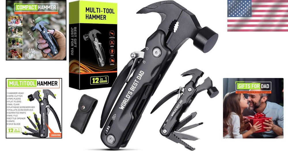 Fathers Day Dad Gifts from Daughter Wife - Gifts for Dad, Dads Gift for Fathers ‹ › ‹ › ‹ › ‹ › ‹ › ‹ › ‹ › ‹ › ‹ › Celebrate Dad with the Perfect Gift: The Ultimate 12-in-1 Multitool Surprise your dad this Father’s Day or special occasion with our engraved "WORLD'S BEST DAD" multitool. More than just a practical tool, it’s a versatile companion for outdoor enthusiasts, DIYers, and emergency situations. Compact, sturdy, and packed with 12 essential functions, it’s the ideal gift from daughter, wife, or son that combines thoughtfulness with utility. 12-in-1 Functionality — Hammer, nail claw, blades, pliers, screwdrivers, bottle opener, and more, all in one. Safety Lock Design — Each tool features a reliable lock for safe and independent use. Portable & Durable — Comes with a nylon pouch for easy carrying; made from rust-resistant stainless steel. Perfect for Outdoor & DIY — Suitable for camping, hiking, DIY projects, or emergency situations. Act now — make your dad’s day special with a gift he’ll cherish and rely on. Limited stock available! Show your appreciation with a meaningful gift that combines practicality with heartfelt sentiment. Perfect for Father’s Day, birthdays, or Christmas. Buy with confidence — Reliable support, quick shipping, and satisfaction guaranteed. Ready to surprise your dad? Order today and give him a gift he’ll love and use for to come! UPC: 711181111866 Unit Quantity: 1.0 Item Package Quantity: 1 Number Of Pieces: 1 Package Dimensions: 6.22 x 3.27 x 1.45 inches Pattern Name: Claw Hammer Engraved WORLD'S BEST DAD Power Source: hand_powered Batteries Required?: No Included Components: 12-in-1 multitool hammer Item model number: ris Hammer Claw Black(DAD) Shipping: Fast shipping USA Country of Origin: China Batteries Included?: No Set Includes: Does not apply Material: Stainless Steel Occasion: Christmas,Father's Day,Birthday Features: Safety Lock Design,Compact,Sturdy,Rust-Resistant Pattern: Claw Hammer Engraved WORLD'S BEST DAD Service For: 1 Style: Modern Shape: Straight Number of Items in Set: One-Piece Item Weight: 0.75 lb Unit Type: lb