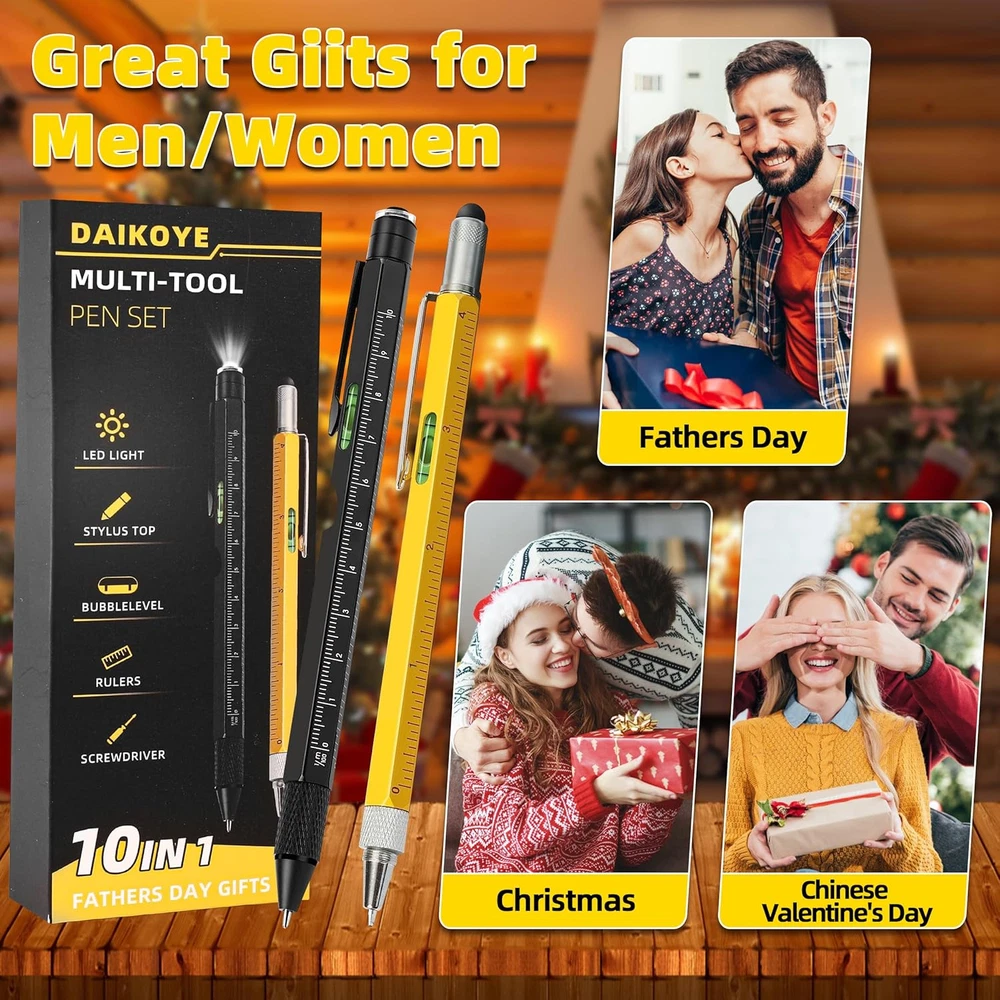 Fathers Day Gifts:DAIKOYE multi-tool pen with personalised gifts box are unique gifts for dad, men, husband, boyfriend, grandpa on Christmas, Thanksgiving Day, Anniversary, Birthday and other memorable days. 2 PCS 10-in-1 Multifunctional Pen:They have 10 combined features: Super bright Led Light, Stylus Top, Metric and Imperial Rulers, Bubble Leveler, Bottle Opener, Flathead and Phillips Screwdriver, Hex Screwdriver and Sim Card Removal Tool, and Ballpoint Pen. Durable Material:Made of super-strong aluminum, this multi-tool pen is built to last. It's an awesome tool for handypersons and DIYers, and it's great for office work, construction, electrical, machinery, and everyday tasks. Perfect as a Father's Day gift for men, him, or your husband. Perfect Package:The DAIKOYE multitool pen set comes with two LED pens, 6 extra refills, and 6 batteries (3 installed and 3 spare). This is the best gift for men. Preferred Gift:Are you still looking for a perfect holiday gift for men? This tool pen is not exactly a man's favorite, don't hesitate, you will have a happy holiday. Product Description >Fathers day gifts >Father's day gifts >Gifts for men >Christmas gifts >Stocking stuffers >Birthday gifts for men >Gifts for boyfriend >Cool gadgets