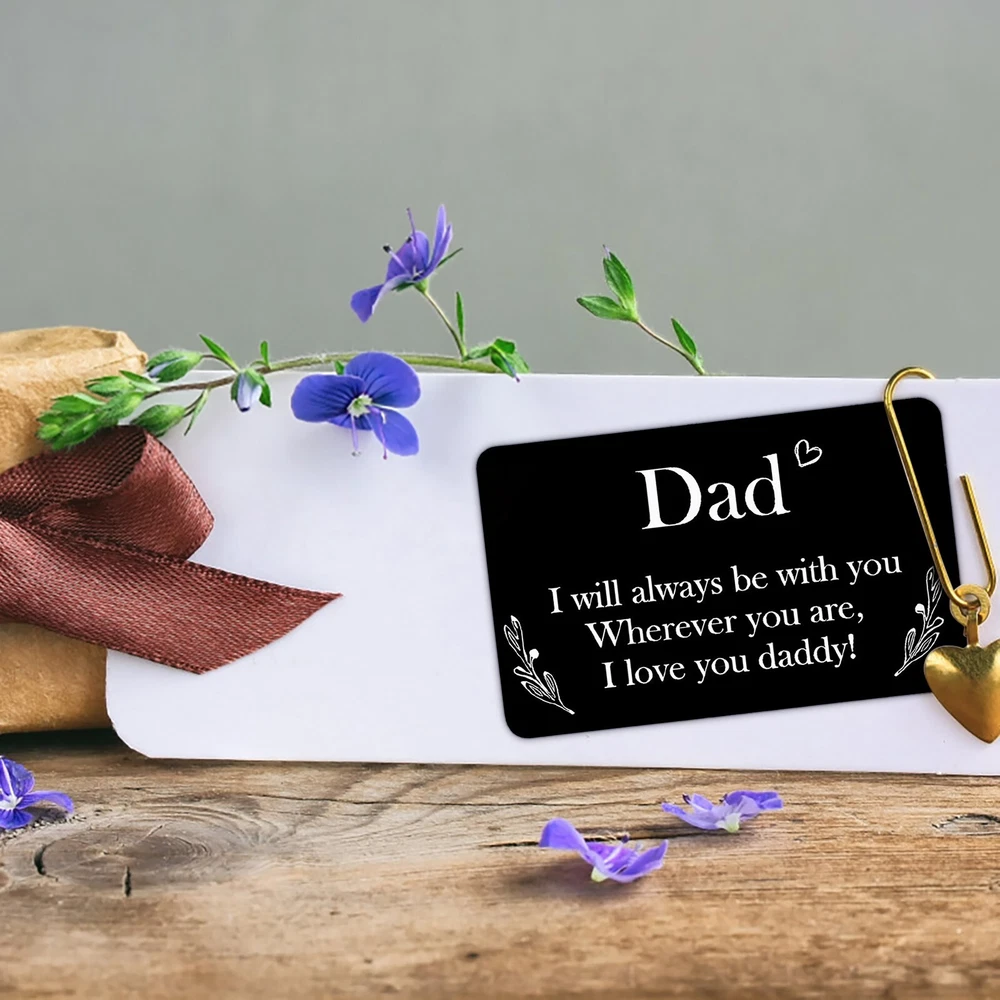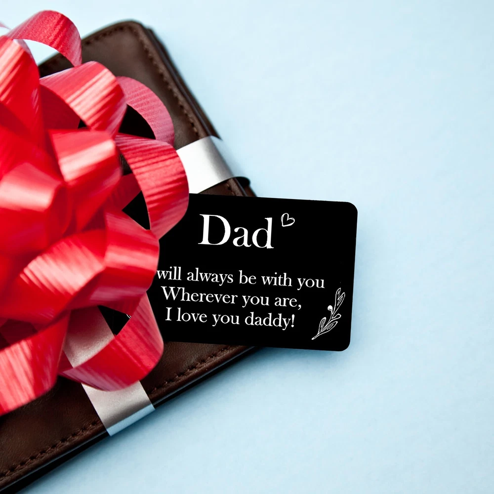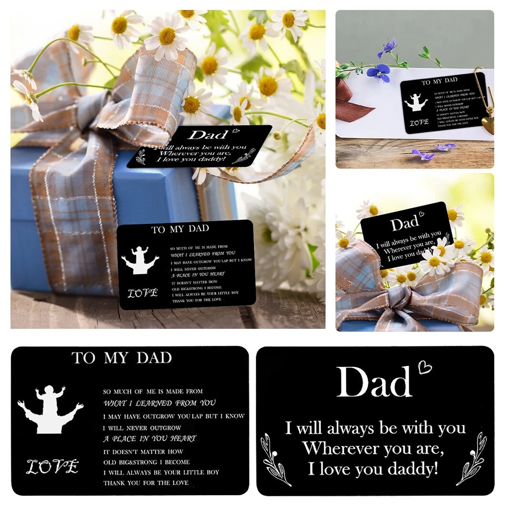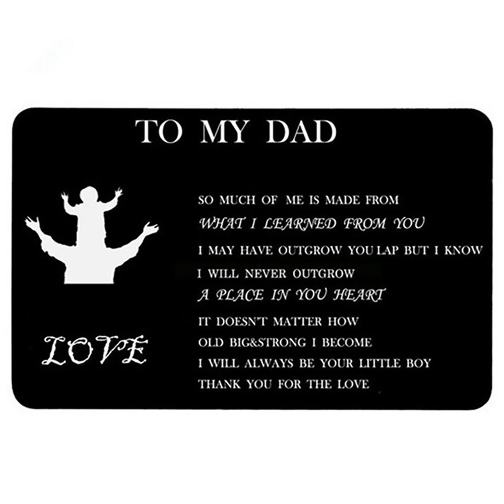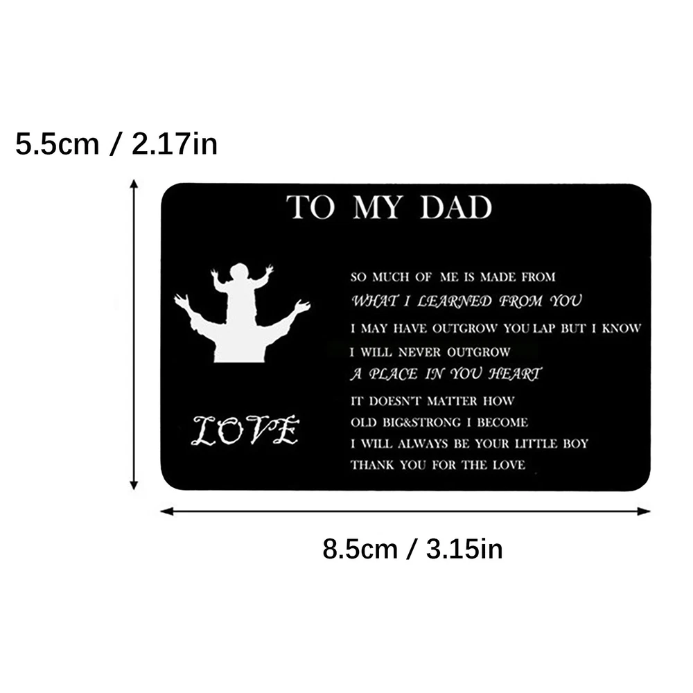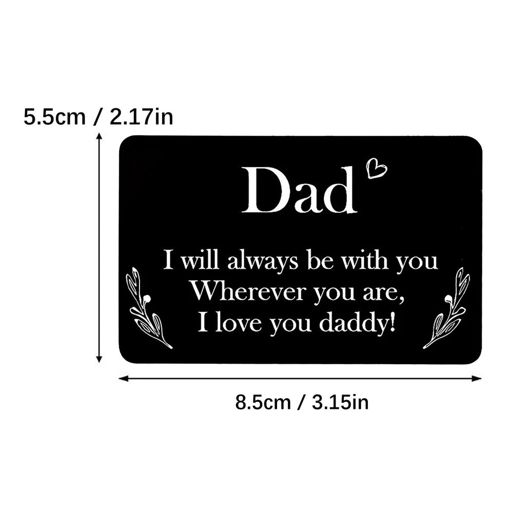 Personalized Engraved Wallet Metal Card Insert From Son Daughter Birthday Thanksgiving Christmas Father Day Customized Best Dad Ever Best Custom Message Card For Dad Daddy Features: Best Gifts For Him Whenever your loved one opens his wallet, a happy smile will appear on his face. Engraved wallet card with love message, it helps you convey your love. The information you convey will last a . Love him, give this to him! Credit Card Size 3.35 x 2.13 x 0.03 inches 85mm x 55mm x 0.7mm . It will perfectly fit in any . Premium Quality Made of high quality stainless steel which looks thin yet sturdy. Will not bend easily! Permanent engraved, will not fade or wear off. You can feel it with your finger. Affectionate Gifts Wallet insert card with your love note is a remarkable way to tell him how much you love him.Perfect customized gifts for dad. These wallet cards also make amazing gifts for birthday, Father Day, Halloween, Thanksgiving Day, Christmas and more. NOTE Come with a cute envelope for giving, ONLY THE METAL CARD. If anything goes wrong with your order, please let us know and we will try our best to solve it for you. 100% satisfaction guarantee. Product Description: Size: As shown Color: Black Material: Metal Shape: Rectangle Include: 1xcard