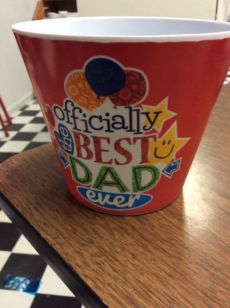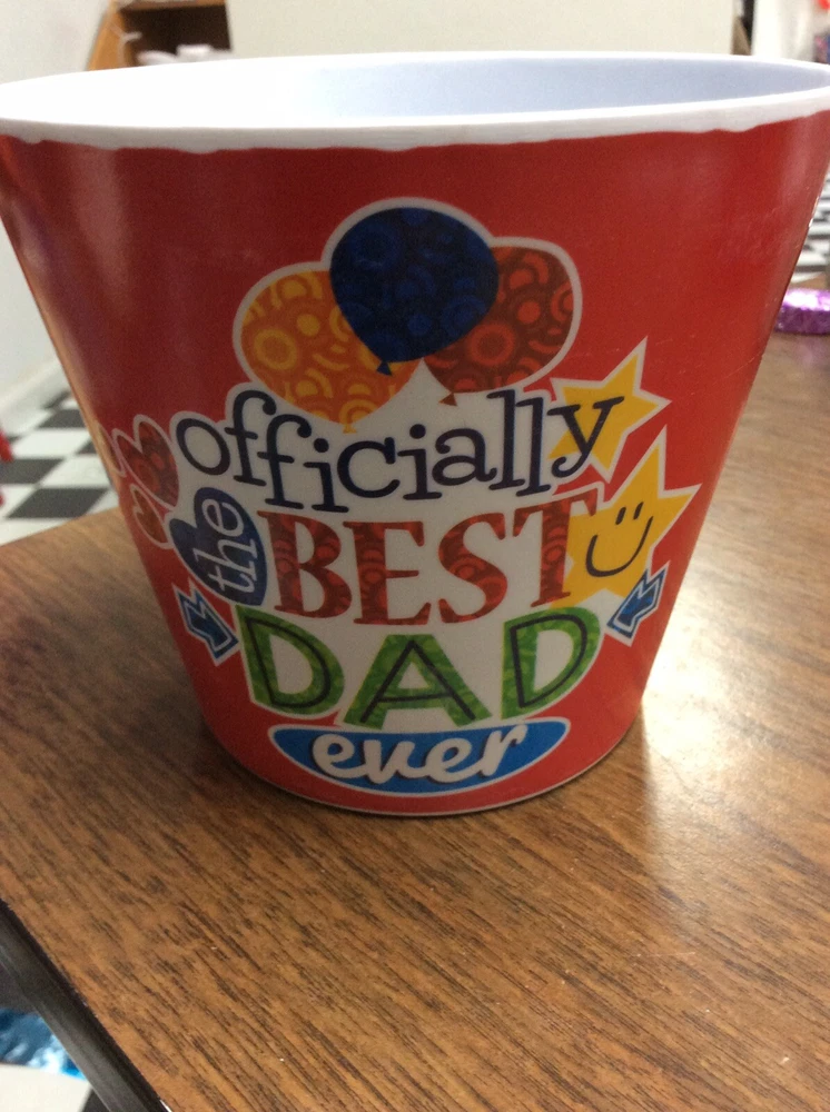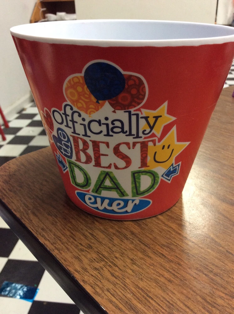 Fathers Day Flower Pot Holder.This is sold as a plant pot holder however if you can use your imagination, it can be used to hold pens and pencils on a desk, fill with goodies and candies or whatever is special to your dad. The lettering is on the front and back of the pot.. It is made of Melamine.