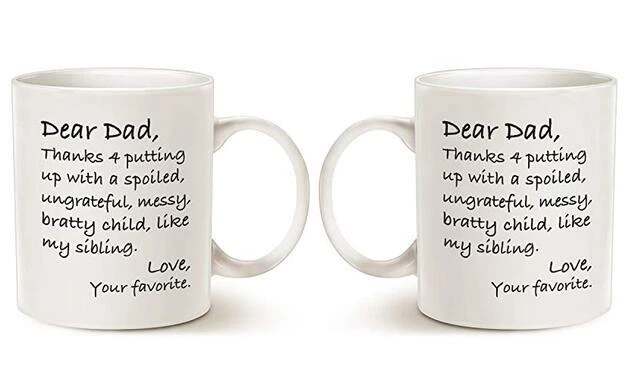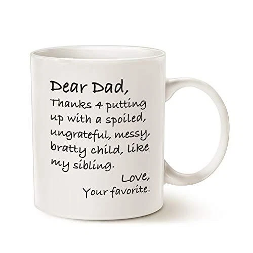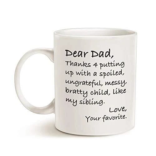 Return Policy Fast Delivery Trusted seller Fathers Day Funny Dad Coffee Mug, Dear Dad, Thanks 4 Putting up with a Spoiled... Love, Your Favorite Best Birthday Gifts for Dad Father Cup, White 11 Oz Product Description Christmas Gifts Funny Coffee Mug for Dad, Dishwasher and Microwave Safe. Printed On Both Sides. Dear Dad, Thanks 4 putting up with a spoiled, ungrateful, messy, bratty child, like my sibling. Love, Your Favorite High Quality Ceramic, Treat Yourself or Give as a Gift to Someone Special, Can Be Used for Home and Office. Exquisite Fashion, Easy-grip with Handle, Suitable for Hot and Cold Drinks. Great Holiday or Birthday Gift for Your Best Dad, Father, Daddy, Pop, Poppa, Papa. This Represents an Affordable Novelty They Will Appreciate for Years. Shipping Returns Payment Shipping Shipping is FREE to all addresses other than APO/PO boxes in the lower 48 states. All our stock ships from US-based warehouses. Shipped via USPS or UPS (depending on location and package weight) Unless stated otherwise, all orders will ship within 24-72 hours of your payment being processed. Check our feedback to see the great reviews of FAST shipping we offer. Returns Seller does not accept returns Payment We currently accept payment via eBay managed payments only. Once payment is cleared, we will dispatch your shipment within 1-3 business days. Please refer to the "Shipping" tab for more information regarding shipping speed to your destination.