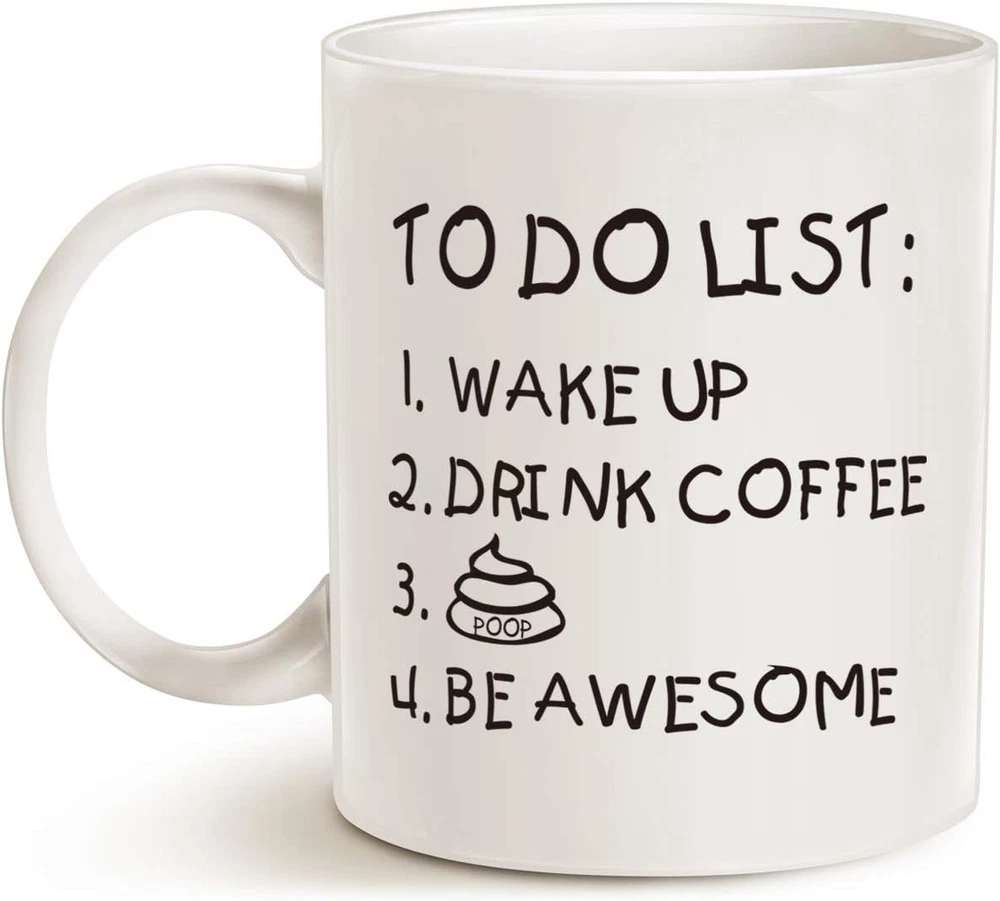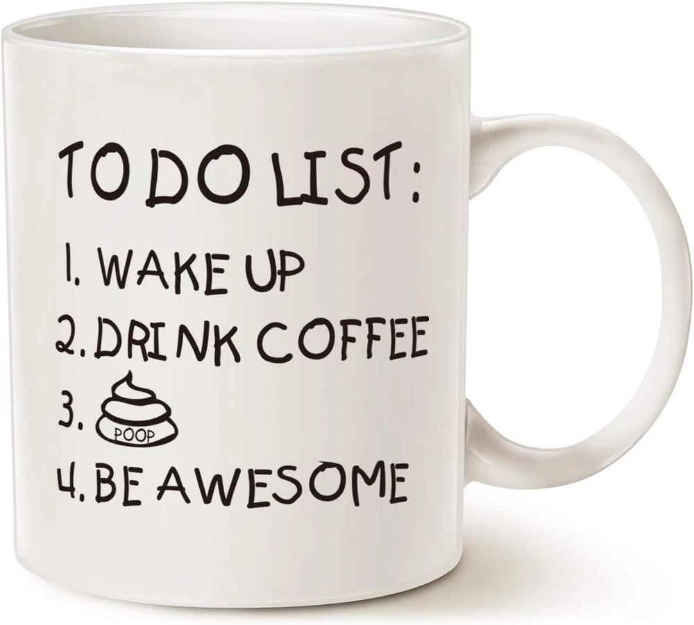 Fathers Day Funny Quote Coffee Mug for Husband, Friend Gifts, to Do List Wake up Drink Coffee P Be Awesome Cute Motivational Cup, White 11 Oz MAUAG Christmas Gifts Funny Coffee Mug for Brother Sister Boyfriend, Dishwasher and Microwave Safe. Printed On Both Sides. TO DO LIST: 1.WAKE UP 2.DRINK COFFEE 3.P 4.BE AWESOME design is the perfect gift for family member! High Quality Ceramic, Treat Yourself or Give as a Gift to Someone Special, Can Be Used for Home and Office. Exquisite Fashion, Easy-grip with Handle, Suitable for Hot and Cold Drinks. Great Holiday or Birthday Gift for Your Best Friend, Dad, Mom, Husband, Wife, Grandpa, Grandma, Uncle, Aunt, Brother, Sister, Son, Daughter, Boss, Boyfriend or Girlfriend. They Will Appreciate for Years. MAUAG Mug Inc Designs, Funny Christmas Gifts Mothers Day and Fathers Day Coffee Mug in Natural, 11Oz Capacity. Each mug is microwave & dishwasher safe. The phrase "TO DO LIST: 1.WAKE UP 2.DRINK COFFEE 3.P 4.BE AWESOME" is clearly scripted and centered on the front of the mug. The perfect size to enjoy your morning beverage and the perfect gift for your loved ones on that special day. Ideal to surprise friends or co-workers at the office on any occasion. This product adds to home. Why? Because we like you! Yours today for a very cheap price. Item model number LT to do list mug-1 Style Modern Number of Items 1 Pattern Letter Print Theme Funny Unit Count 1.0 Count Material Ceramic Capacity 11 ounces Occasion Fathers Day,Office,Holiday,Home Item Weight 11.36 ounces Age Range (Description) Adult Is Discontinued By Manufacturer No Specific Uses For Product Hot Drinks Manufacturer Mothers Day and Fathers Day Christmas Gifts Funny Coffee Mugs Reusability Reusable League ncaa Item Weight 11.4 ounces Material Feature Microwave Safe Special Feature microwave_safe, Microwave Safe Color A-12 Finish Type Glossy Package Dimensions 5.24 x 4.65 x 4.09 inches Shape Round Recommended Uses For Product Home Included Components Handle Product Care Instructions Machine Wash, Microwave Safe, Hand Wash Only Size 1 Count (Pack of 1) Shipping Fast shipping is very important for us. Our standard US shipping service is FREE. Your order will be shipped within 2-3 business days upon full payment received. Your order will be delivered within 2-3 business days after the handling time. We only ship to the confirmed PayPal address. We reserve the right to cancel any order for any reason at any time. We are not responsible for undeliverable addresses. Returns and payment We offer a 30 days return policy from checkout winning date. We allow only PayPal as payment method FeedBack Your feedback very important to us, after you get your package and you are satisfied with our service please leave us positive feedback If you have any problem with your order / any questions please before leave any type of feedback For any questions, using eBay contact system Please visit our eBay store to check out other items for sale! Thank you for shopping at our store.