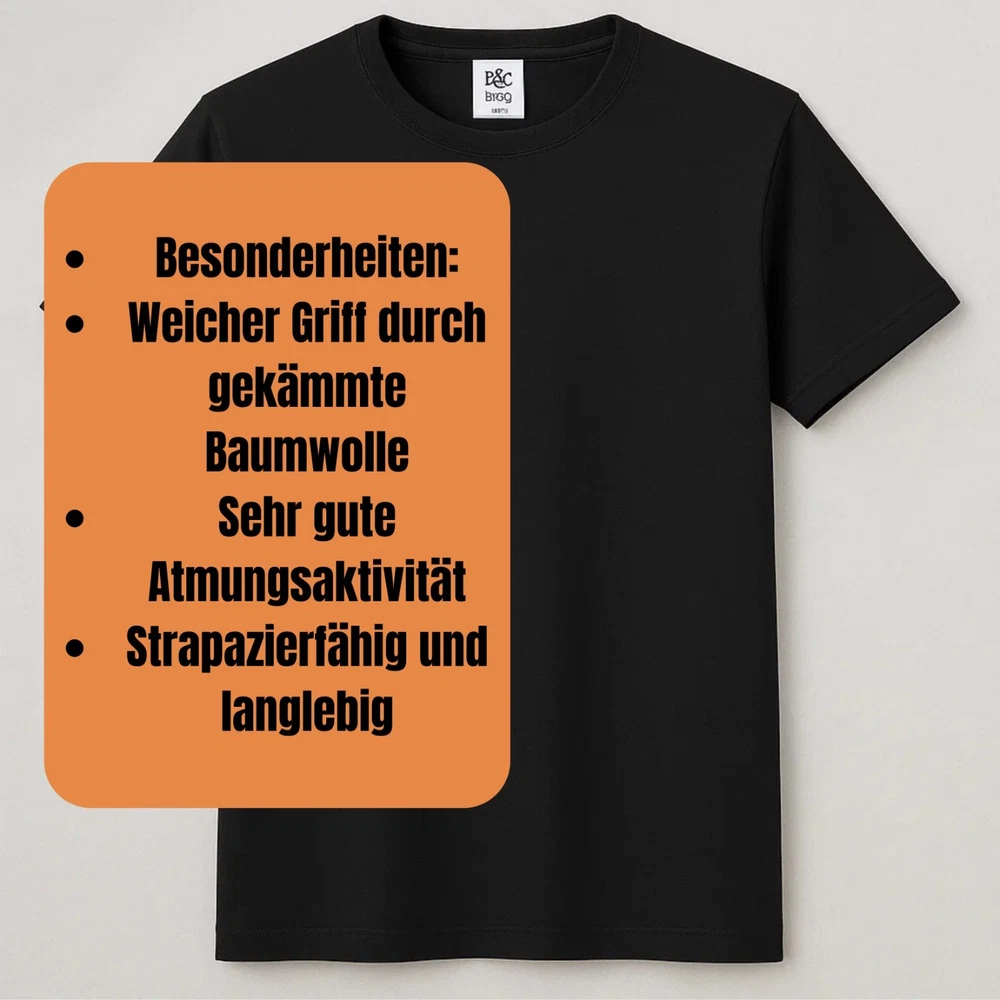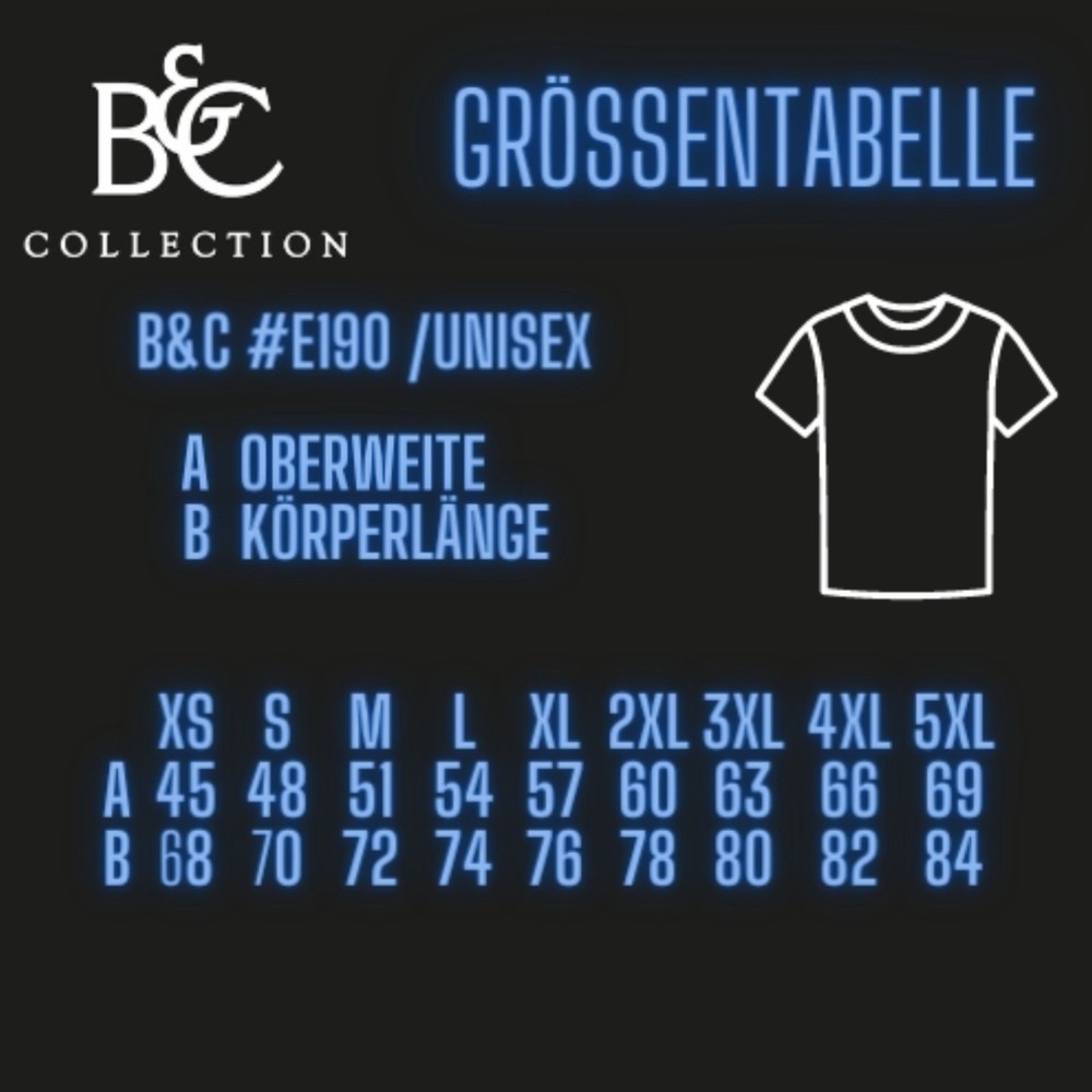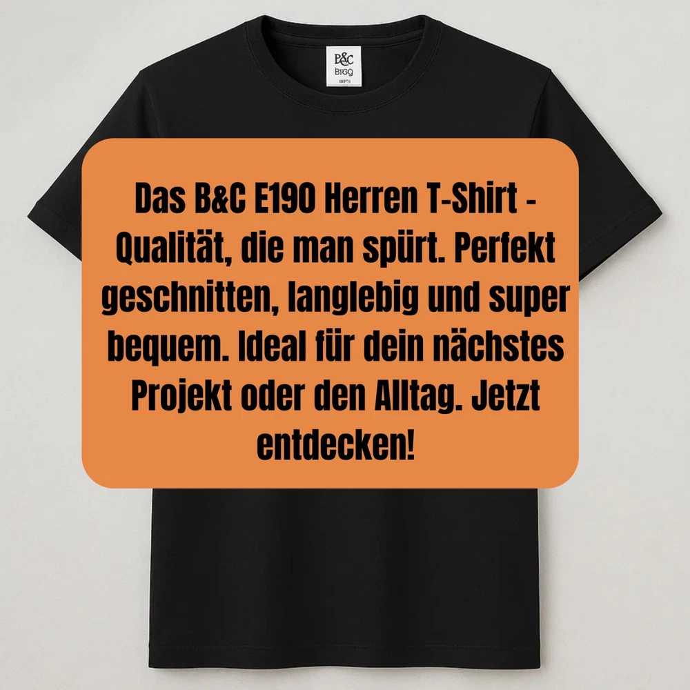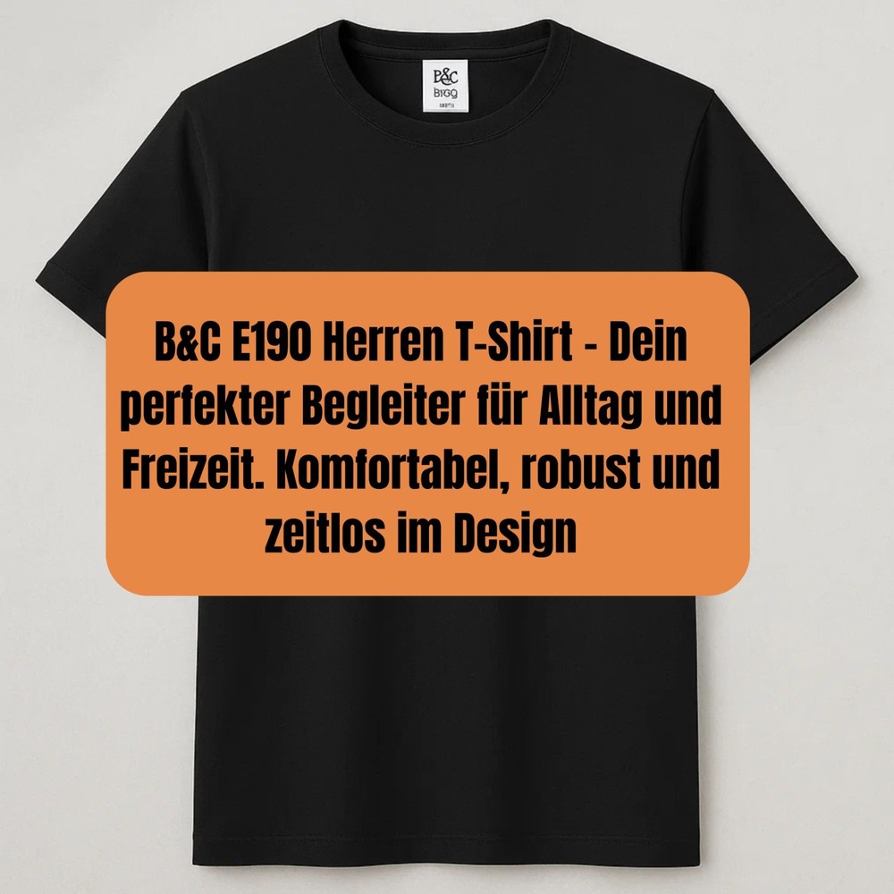 B&C E190 Herren T-Shirt Komfort und Qualität für jeden Tag Erleben Sie das B&C E190 Herren T-Shirt, ein hochwertiges Basic, das durch erstklassige Materialien und präzise Verarbeitung besticht. Dieses Shirt besteht aus 100 % ringgesponnener, gekämmter Baumwolle, die für ein besonders weiches Hautgefühl sorgt. Melierte Farbvarianten enthalten einen kleinen Polyesteranteil von ca. 5 %, der die Strapazierfähigkeit erhöht. Der klassische Regular Fit Schnitt garantiert eine bequeme Passform, die sowohl im Alltag als auch beim Sport oder als Werbeträger überzeugt. Mit einem Materialgewicht von ca. 185 g/m² ist das Shirt robust und atmungsaktiv zugleich und behält seine Form auch nach häufigem Waschen. Der Rundhalsausschnitt mit elastischem Rippstrick sorgt für Formstabilität und einen modernen Look. Die doppelten Nähte an Ärmeln und Saum erhöhen die Langlebigkeit des Shirts. Durch seine Vielseitigkeit eignet sich das B&C E190 hervorragend für individuelle Bedruckungen, sei es für Firmenwerbung, Events oder private Gestaltung. Produktdetails Material: 100 % ringgesponnene, gekämmte Baumwolle (bei melierten Farben ca. 95 % Baumwolle / 5 % Polyester) Materialgewicht: ca. 185 g/m² optimaler Mix aus Stabilität und Komfort Schnitt: Klassischer Regular Fit für eine lässige, bequeme Passform Größen: XS bis 5XL für jede Körpergröße und Statur die passende Wahl Farben: Breite Palette von klassischen bis trendigen Farben Kragen: Rundhalsausschnitt mit elastischem Rippstrick für extra Formbeständigkeit Nähte: Doppelte Nähte an Ärmeln und Saum für erhöhte Strapazierfähigkeit Pflegehinweise: Maschinenwäsche bei 40 °C, nicht bleichen, schonender Trocknerbetrieb möglich, bügeln bei mittlerer Temperatur Vorteile auf einen Blick Hochwertige Materialqualität für langanhaltenden Tragekomfort Langlebige Verarbeitung und Formstabilität auch nach vielen Waschgängen Vielseitiger Schnitt ideal für Freizeit, Sport und Arbeit Perfekt geeignet für individuelle Textildrucke und Veredelungen Pflegeleicht und alltagstauglich Bestellen Sie jetzt das B&C E190 Herren T-Shirt und sichern Sie sich ein langlebiges, bequemes und stylisches Basic, das in keinem Kleiderschrank fehlen darf.