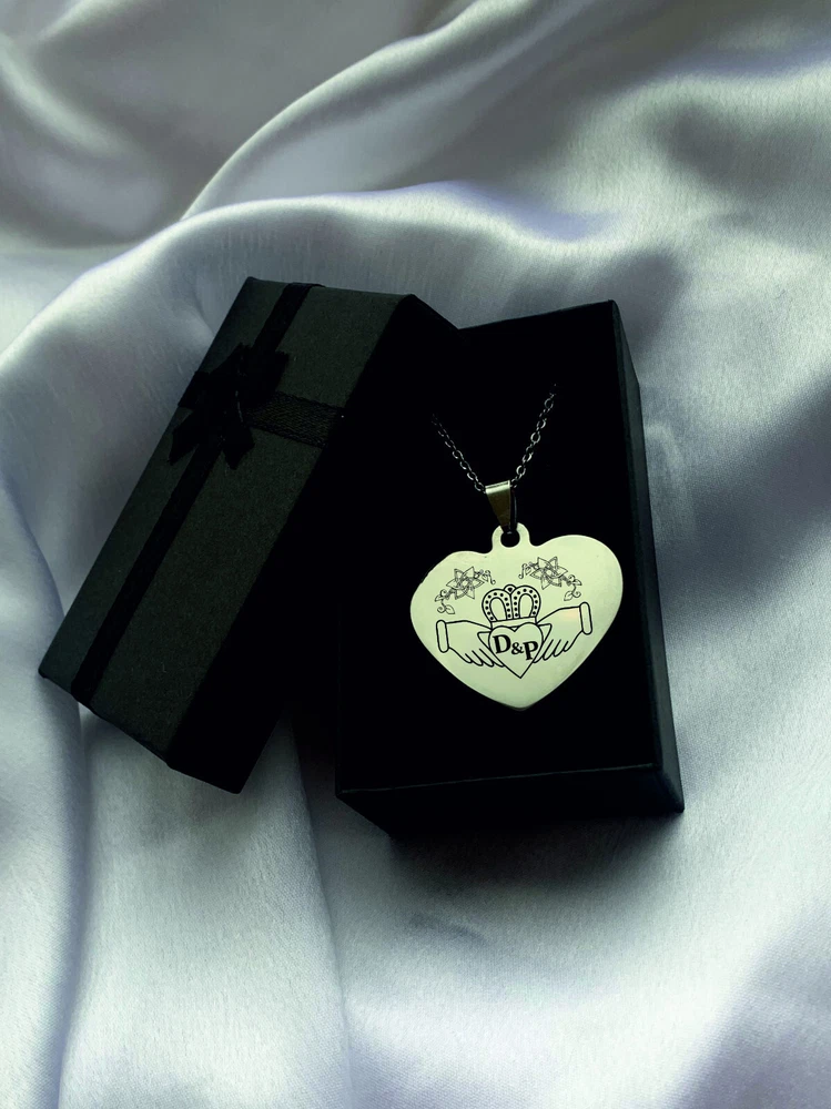Claddah Design Heart Gift Personalised with your choice of name/s - Reverse side can have any greeting or message you like upto 6 lines - Front side can have any initials Type (Heart Pendant) with chain (claddah theme) 35mm x 35mm 18" silver plated chain Material (high quality polished stainless steel) Comes with chain Engraved in stunning 4k quality photo Will last a lifetime Any text engraved FREE TEXT ON REVERSE SIDE (UPTO 6 LINES) WORTH £5 What makes our engravings different? We use state of the art 4k lasers (fibre) What you see is what you get, look at our sample photos, we dont use computer generated overlays, these are real engravings. We have over 30 years experience in design, engraving and print production with professionally qualified staff, if you have a problem we can fix it. 24 hr production from receipt of order Tracked and traced orders (as standard) We produce artwork for any occasion. How do I order? Buy your item Leave any text required in the personalised box Message any photos required (please use high resolution images) We will keep you informed about your order every step of the way 4 PLEASE CHECK YOUR SPELLING!, WE CANNOT BE HELD LIABLE FOR ANY INFORMATION SUPPLIED THAT IS INCORRECT. TEL 07762 311242 for details We also produce:- Quality Pet Tags Shop signs vehicle signs & stickers Banners and display boards Roll up/ Pop up banner stands Magnetic signs and much more...........