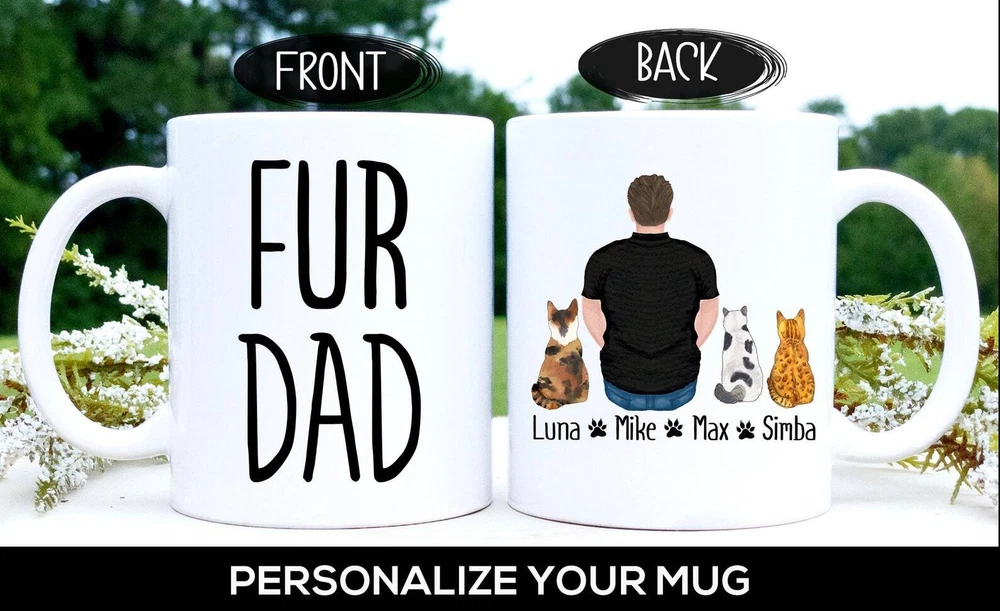 Fathers Day Gift From Dog Or Cat Personalized Fur Dad Mug Gift For Men Custom Pet Mug Gift For Son Brother Husband Christmas Gift Product Details.. This high quality 11oz. ceramic white mug has a premium hard coat that provides crisp and vibrant color reproduction sure to last for years. Perfect for all hot & cold beverages. The highest quality printing possible is used. It will never fade no matter how many times you wash it. Material: 100% Ceramic. Print both sides. Dishwasher and Microwave Safe. High Gloss + Premium White Finish. Printed in the U.S.A. Personalized & Custom. We support personalized and custom mug to add custom, when placing an order, you can add notes to the "order note" in shipping address section. Also you can contact us directly via message. Shipping Info. Ready to ship in 1 to 2 business days, All products are made-to-order and proudly printed in the United States. Shipped by USPS and DHL, You will receive your order in 5-7 days. Replace & Refund. All products are defective during shipping broken, chipped will be replaced free of charge. You are not satisfied with the product, we will refund 100% money to you. If any other issues arise, please do not hesitate to message, we would be more than happy to assist you.