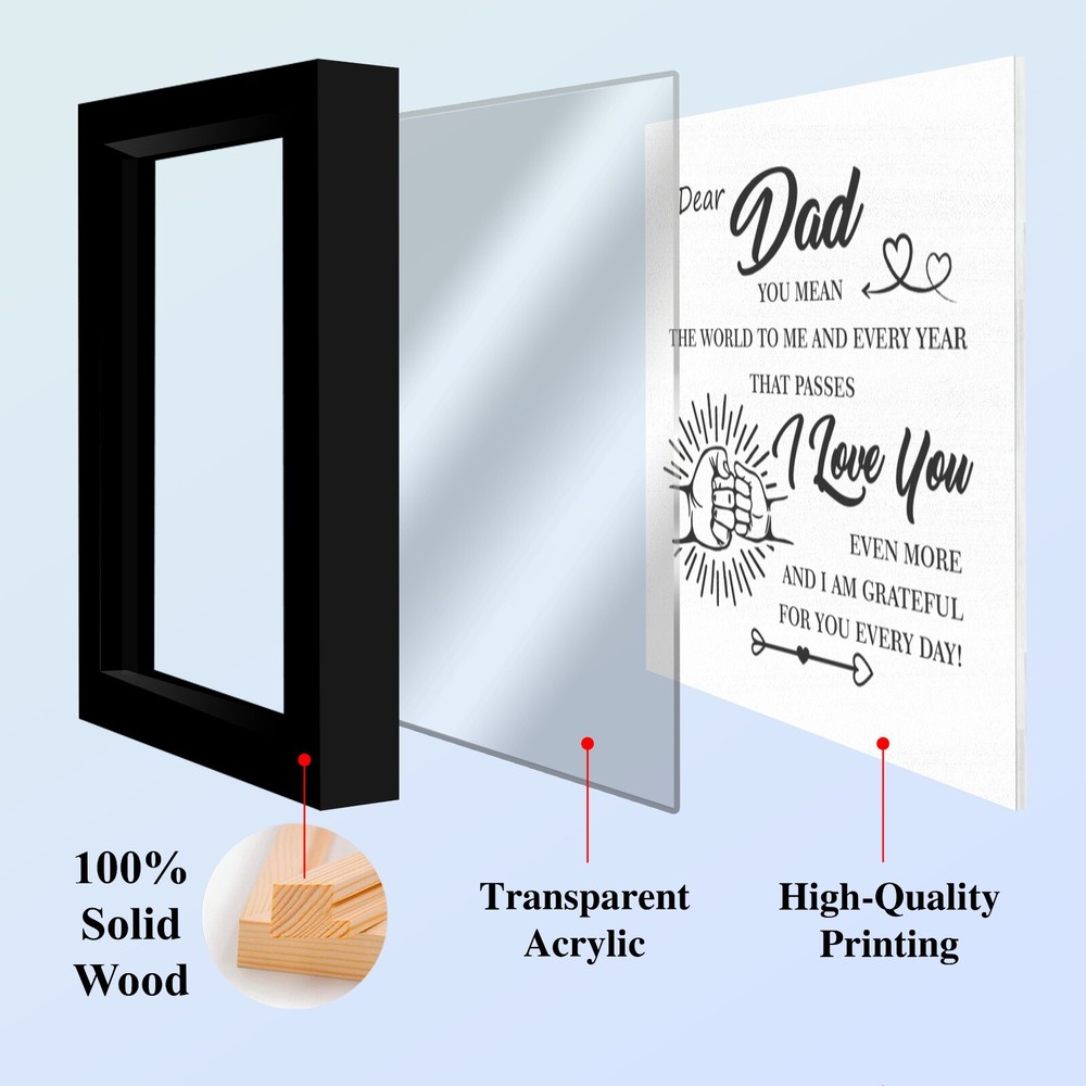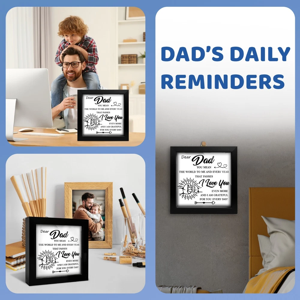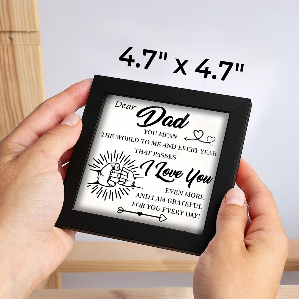 🖼️ Emotional Father's Day You Mean the World to Me Frame Dad Appreciation Decor 💖 A Symbol of Love & Appreciation This listing features a beautifully crafted Framed Wall Art Piece that celebrates the unbreakable bond between a father and his children. Includes a metal hanger hook and a gift box—ready to present with love and gratitude. 📏 Material & Size Made from high-quality solid wood for both elegance and durability. Dimensions: 4.7" x 4.7" x 1". The front is covered with clear acrylic to protect the print and deliver a sleek, polished appearance—turning this into a lasting keepsake. 🎨 Minimalist & Heartfelt Design Featuring a clean layout, a fist bump graphic, and a touching message, this Father’s Day frame from son or daughter speaks volumes without saying too much. A thoughtful appreciation gift for any dad, including new dads. 🏠 Display It Anywhere This frame is both standable and wall-mountable, offering versatile display options. Whether on a shelf, desk, or wall, it brings a sentimental touch to any room—home or office. 🎁 Perfect Gift for Dad A meaningful gift idea for Father’s Day, birthdays, or any moment that deserves recognition. Perfect for Dad, Stepdad, Father-in-Law, Husband, or a close friend—from sons, daughters, or kids.
