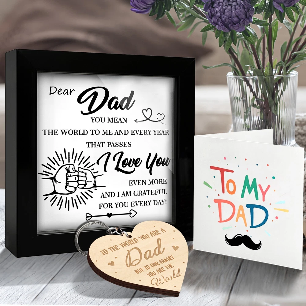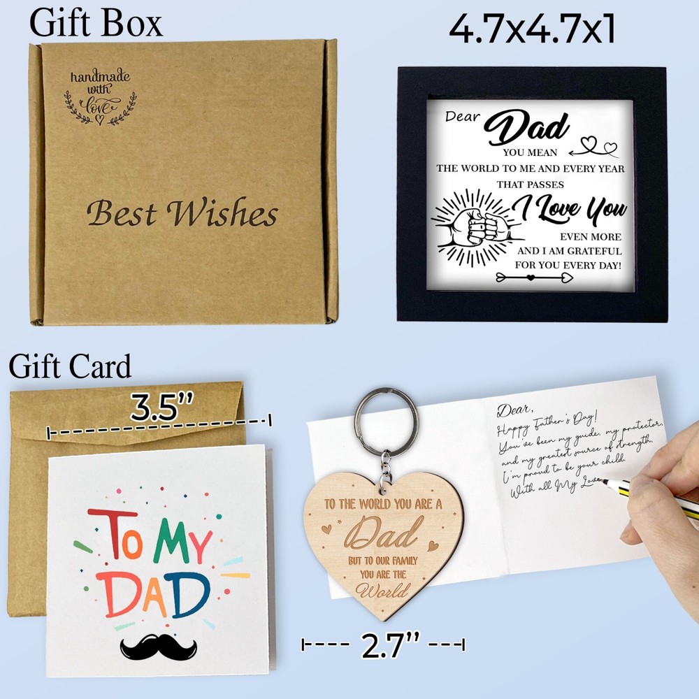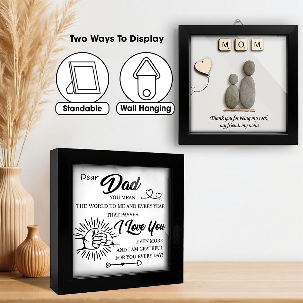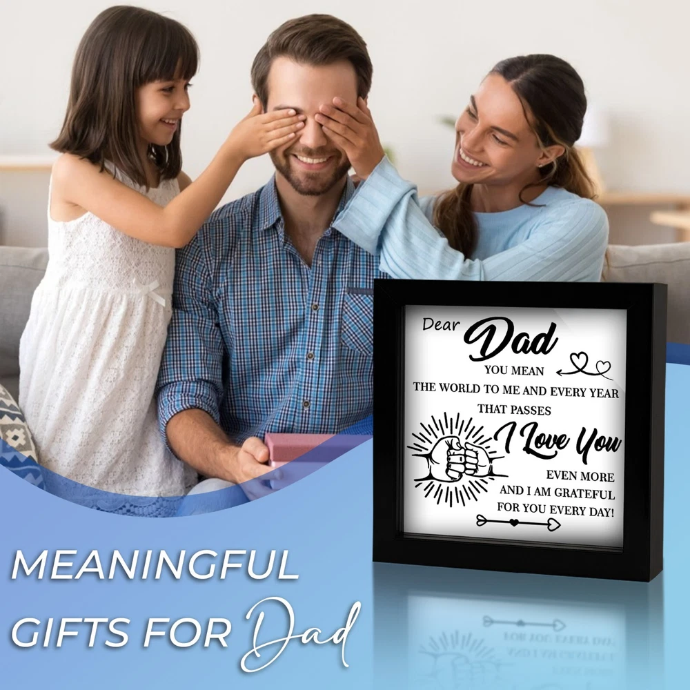 🖼️ Emotional Father's Day You Mean the World to Me Frame Dad Appreciation Decor 💖 A Symbol of Love & Appreciation This listing features a beautifully crafted Framed Wall Art Piece that celebrates the unbreakable bond between a father and his children. Includes a metal hanger hook and a gift box—ready to present with love and gratitude. 📏 Material & Size Made from high-quality solid wood for both elegance and durability. Dimensions: 4.7" x 4.7" x 1". The front is covered with clear acrylic to protect the print and deliver a sleek, polished appearance—turning this into a lasting keepsake. 🎨 Minimalist & Heartfelt Design Featuring a clean layout, a fist bump graphic, and a touching message, this Father’s Day frame from son or daughter speaks volumes without saying too much. A thoughtful appreciation gift for any dad, including new dads. 🏠 Display It Anywhere This frame is both standable and wall-mountable, offering versatile display options. Whether on a shelf, desk, or wall, it brings a sentimental touch to any room—home or office. 🎁 Perfect Gift for Dad A meaningful gift idea for Father’s Day, birthdays, or any moment that deserves recognition. Perfect for Dad, Stepdad, Father-in-Law, Husband, or a close friend—from sons, daughters, or kids.
