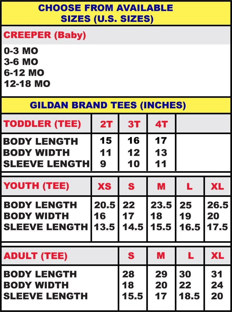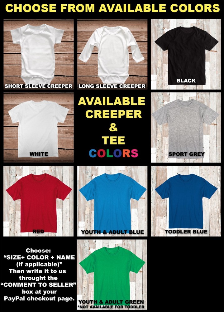 Custom Tee Shirt From www.ebay.com/usr/prime_living Choose From Available Sizes: Creepers (Only In White): 0-3 MO 3-6 MO 6-12 MO 12-18 MO Toddler (Tees): 2T, 3T, 4T Youth (Tees): S, M, L, XL Adult (Tees) S, M, L, XL Choose From Available Tee C o l o r s : White Black Sport Grey Red Blue Irish Green (upon request - for youth and adult tees only) ♥ Please note the Irish Green Tee is only available for youth and adults. ♥ Toddler Blue Tee is different than Youth and Adult Blue Tee. Product Details (Cotton): Looking for a cool tee for yourself, friend, or loved one? Prime_Living t-shirts can help you personalize any awesome design! Choose from a variety of colors, sizes, clever and funny sayings or artwork BEFORE placing your order, please view the last product images to determine the exact measurements, colors, and styles of our onesies and tees. Most personalized items are final sale due to customization.