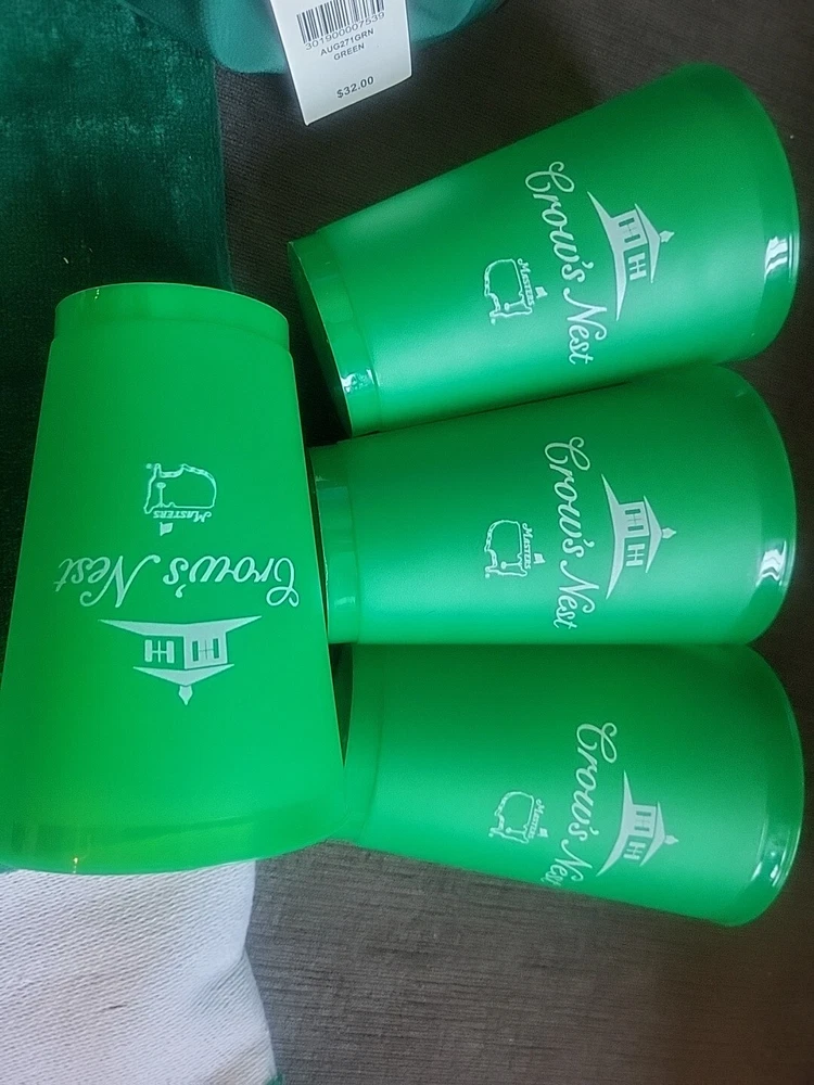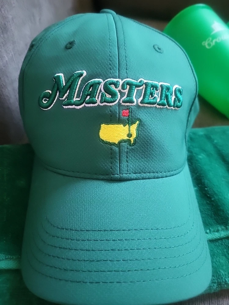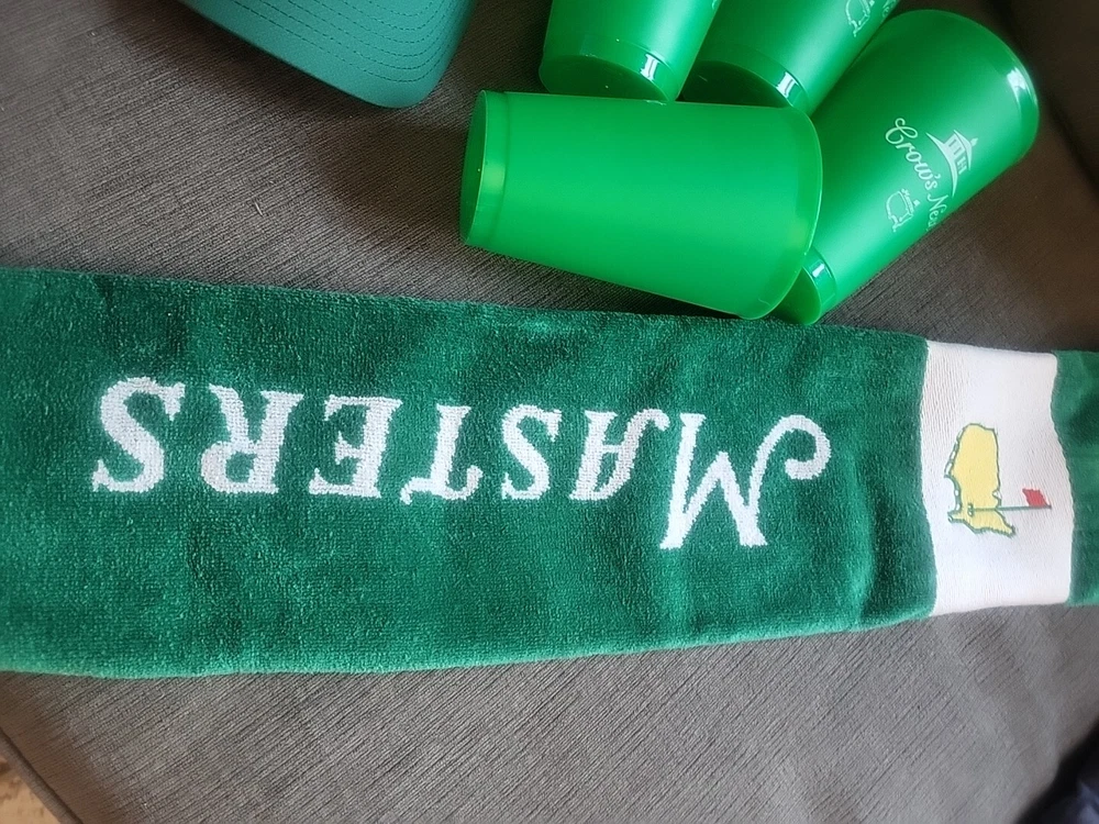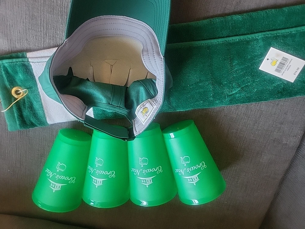 Get ready for Father's Day with this exciting golf package from the Masters tournament. The set includes a green nylon and hat, four cups, and a matching towel, all with an embroidered Masters logo. Perfect for any golf enthusiast, this set is a must-have for any Father's Day gift. Whether you're hitting the links or just need some stylish accessories for your golf bag, this Masters golf hat and towel set is the perfect choice. Brand new and in pristine condition.