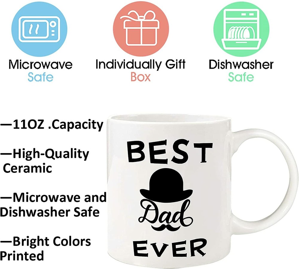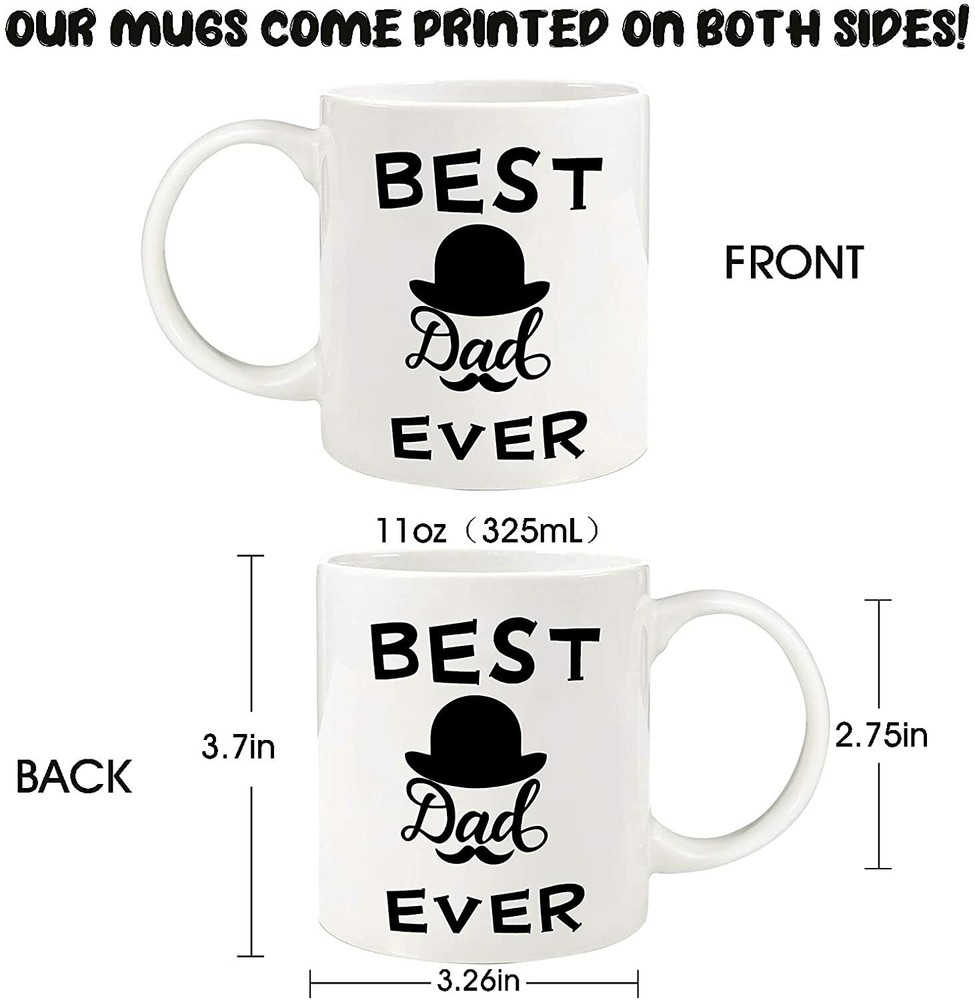 Fathers Day Mug Gifts for Dad Grandpa,Dad Gifts from Daughter Son, Funny Ceramic Coffee Mug with Sayings:Best Dad Ever, Father's Day Christmas Birthday Gifts for Men&Him Father in Law Stepfather Description 🎁【Perfect Best Dad Gift Idea】If you looking for best gifts for a dad who have everything, this coffee mug gift is a great idea.If he is a coffee or a tea lover, He will reach for a coffee mug every single day, so upgrading his vessel of choice is a great present idea for Fathers Day, Birthday, Christmas or any days of the year . You can also dress the coffee mug up by placing additional gifts inside when you sending it out. 🎁【Premium Quality Ceramic Mug 】 This Funny Coffee Mug is made with a premium quality ceramic, chip resistance and sturdy . It is printed with high quality ink with unique design on both sides which will not fade even wash by dishwasher for many years. Dishwasher and microwave safe. 🎁【Exclusive Two Sides Design 】 Both sides are printed with funny saying : Best Dad Ever.The unique design make it a novelty, cool, unique, awesome humorous and useful gifts for dad who are coffee lovers or tea drinkers. 🎁【Elegant Gift Box Packaging】We use exquisite gift box packaging, the packaging style is simple but elegant, ready to give or mail it out directly . As a fun gift for dad or grandpa, it is a perfect gift ideas from their daughter, son, kids wife for any dads who has a sense of humor . 🎁【Suitable for Several Occasions】 This coffee mug gift is a great specific pick for dads , grandpa, father in law, step dad as a Fathers day gift, Christmas gift, birthday gift, retirement gift, holiday gift, secret santa gift. If He is the type who prefers to make their own brew at home or work, then give them this best dad coffee mugs to make his favorite activity of the day (drinking coffee, of course) even better. Are you still looking for a gifts for dad on Father's day, Christmas or Birthday? Our mug can meet all the needs of gift giving or your own exquisite life.You can give this mug gift to dad without having to buy an extra gift box.Send this mug to your dad. It absolutely will become the best gift what they receive.You can pour any drink you like in this mug, such as coffee, bordeaux, pinot noir or any other wine, excellent for champagne, cocktails, juices, drinks, sodas, beer and other beverages! Festival that is suitable to gift dad : Father's Day Gifts Birthday Gifts Thanksgiving Day Gifts Christma's Day Gifts New Year’s Day Gifts Anniversaries Gifts Valentine's Day Gifts Any Special Day Design: “Best Dad Ever” 11 ounce capacity Design is on both sides of the cup Printed on high quality ceramic Dishwasher and microwave safe Great for hot or cold drinks Comfortable, rounded handle Individually packaged in a nice gift box with colored tissue paper and ready to be gifted Big Capacity(11 oz) This coffee mug holds up to 11 ounces, so you can fill it up and get to work on your next big project. A good choice for heavy caffeine consumers! Comfortable To Use Pop them in the microwave if your coffee cools off. Appropriate sized handle which makes it easy to hold, thick lip for a better touch when you are drinking. Easy To Clean Clean them up easily in the dishwasher without worrying about the finish wearing. The wide mouth makes it easy when you handwash it. Smooth finish inside and out which does not coffee stain. Father's Day Gifts for Dad Birthday Gifts for Daddy Thanksgiving Day Gifts for Papa This funny coffee mug is a simple yet elegant way to put a smile on the face of your dad - interesting, well designed and constructed mug that can be useful gift for multiple different occasions and can be presented as a gag gift for your dad. This will be a unique gift that can't be found anywhere else and will provide a great way to show your dad and to bring some humor into the life of your family. Shipping We only ship items to your eBay registered address for fast and accurate shipment. Thanks We will ship most orders within 1 business day some items ship same day if ordered early enough Delivery >All shipments are shipped via USPS First Class (2-6 business day) from United States. Return Policy All items qualify for returns within 30 days of receipt. Feedback 1.We strive for 5 star positive feedback. We try our best to offer the best service for our buyers. 2.Please message us via eBay before leaving negative feedback.Let's solve the problems together! 3.Please give us a chance to resolve any issues before posting a feedback. 4.Please contact us with any questions or concerns. Thank you for your watch. We look forward to serving you.