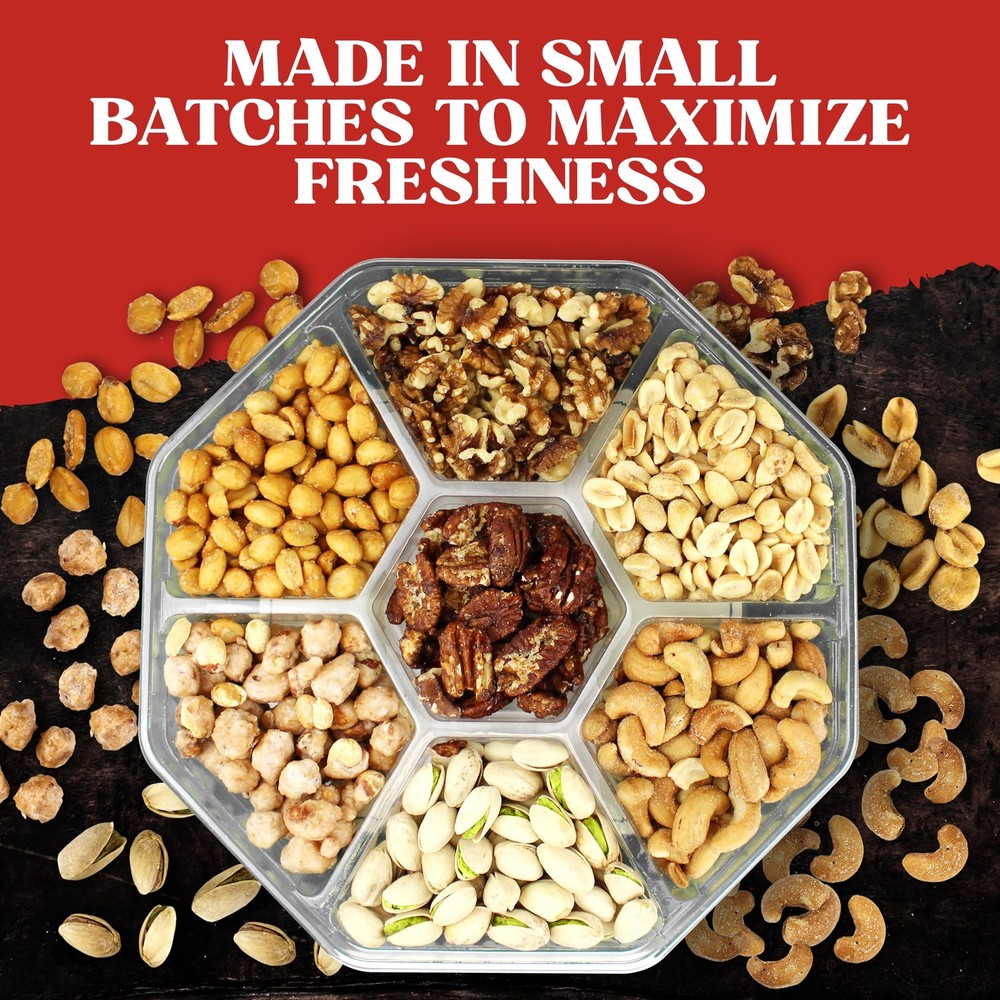 Fathers Day Nuts Gift Basket - Have you been trying to think of a great gift that you can give to a loved one, coworker, or someone else in your life? Wouldn’t it be great to order a gift online and have it get delivered right to this person’s doorstep? If you answered YES to either question, then you’re going to love what we have to offer here at ! The first time you sink your teeth into the nuts in this spread, you’ll instantly be able to tell that we do things differently at . Nothing out of a can here! We only use nuts that are hand-picked at the right time to maximize freshness and flavor. When this gourmet gift box arrives to you (or a lucky friend or family member) they’ll be ultra-fresh. Each platter will contain a mouth-watering mix of peanuts, cashews, pistachios, walnuts, and so much more. We’re warning you, it’s very difficult to each just one! Trust us, we’ve tried! We don’t just select the freshest, most delicious nuts; we create stunning platters. Our presentation is second to none. We take the time to meticulously present them in a high-end gift platter that is sure to impress. Remember, we eat with our eyes first. This nut gift basket is great for Thank You, Anniversaries, Birthdays, Christmas, Get Well Soon, Sympathy, and many other special occasions. Product Features & Benefits: Unique variety packs of gourmet nuts Contains only the freshest, tastiest nuts Come beautifully presented in a gift platter Perfect gift idea for many special occasions Shipped securely & ultra-fast through Amazon Prime You’d be nuts not to click the “Add to Cart” button above to send platter to someone in your life! NUTS PACKED WITH FRESH, FLAVORFUL, NUTRITIOUS NUTS: This dried nut care package is going to be a massive hit. This 7 section platter contains a variety of mouthwatering nuts; all beautifully presented in a high-end gift box. christmas gift basket. gift basket assorted nuts gift baskets exotic grandmas hostess nutz students movie night lightly salted dorm essentials grandparents employee appreciation mom daughter housewarming fatherday graduation wife grandparent bereavement