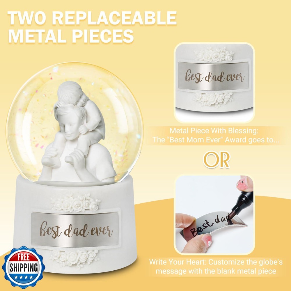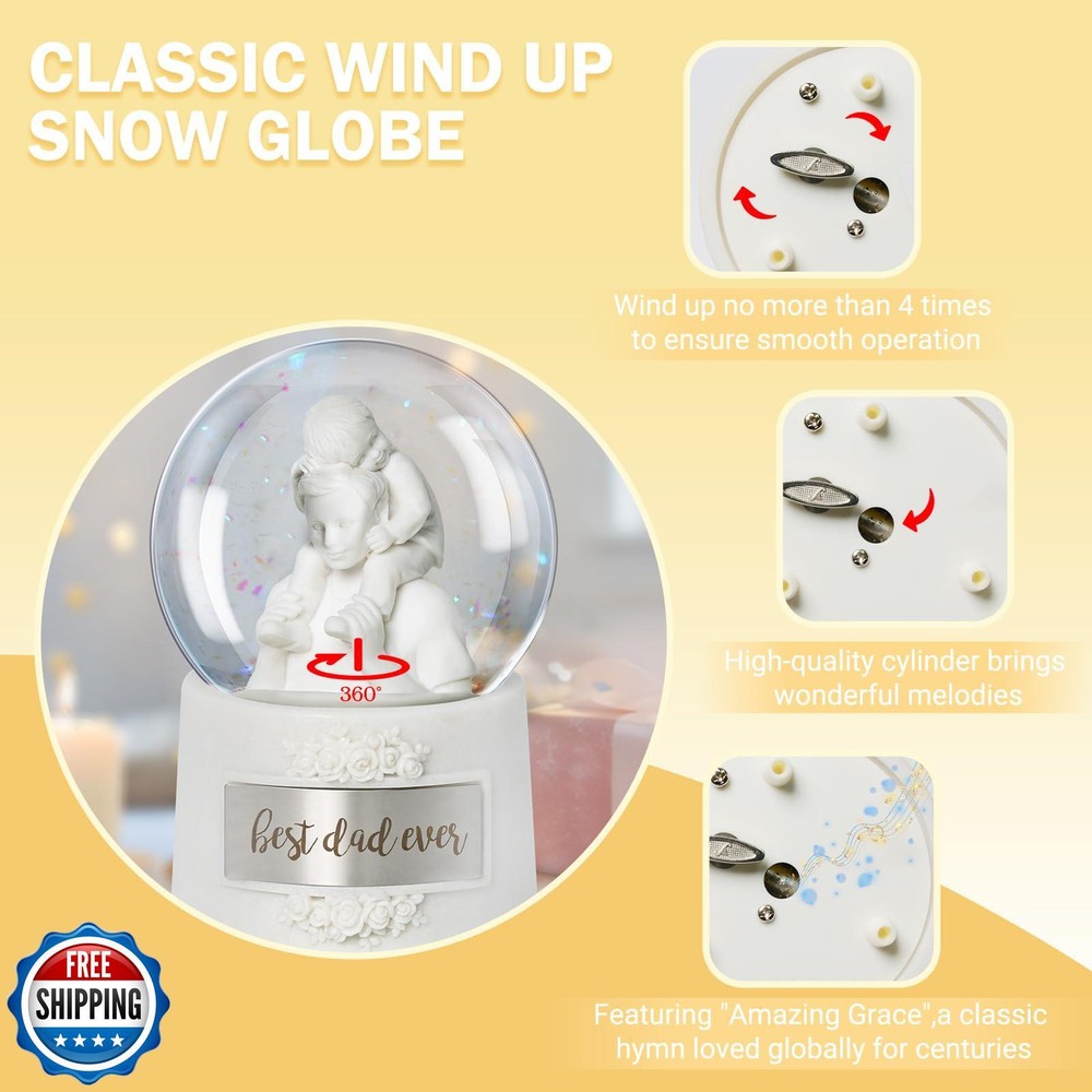 Fathers Day Snow Globe, 5.9" Wind Up Music Box for Father's Day Decorations Birthday Gifts for Dad Father Men Adults Kids Features 【HARMONIC TREASURE】Crafted with pearl-white resin, this 5.9"*3.7" Fathers Day Snow Globe showcases timeless design. The hand-wound music box features a rotating diorama of a father carrying his child on shoulders, captured through precision craftsmanship. Pearl-white base radiates versatile elegance, ideal as Fathers Day Decorations or memorable Birthday Gifts for Dad. 【CLASSIC WIND-UP DESIGN】Experience nostalgic charm with our battery-free snow globe. Rotate the winder 2-3 times clockwise (never exceeding 3 full turns) to activate both swirling snowflakes and a soothing melody. These dual-motion snow globes maintains time-honored craftsmanship while delivering consistent performance for lasting enjoyment. 【BONDING TABLEAU】Sculpted details celebrate fatherhood - from the crisp white tee's realistic folds to secure shoulder hold. The pearl-white composition creates sophisticated decor, equally suited as office desk accents, bookshelf displays, or gaming room centerpieces. A refreshing choice among Fathers Day Gifts collections. 【GIFT-READY DURABILITY】This handcrafted music box features dual engraved plates - one permanently cast with 'Best Dad Ever' in bold lettering, plus a companion blank plate for personalized inscriptions. Note: Gently bend the metal piece to match the curvature of the snow globe before attaching it. 【CRAFTSMANSHIP ASSURANCE】Backed by 12-year specialty expertise, each Father Day Snow Globe undergoes triple-stage quality checks for smooth rotation and balanced audio clarity. Our dedicated support team provides prompt assistance for any inquiries, maintaining confidence in this lasting Birthday Gifts for father and holiday tradition. Shipping Free & Fast Shipping: We offer free shipping to most of the USA with a normal delivery time of 3-7 days. However, due to the current situation, additional delivery time (up to 3 weeks) may be required for some items. Alternative Carriers: We may use alternative carriers (e.g., USPS, FedEx, UPS) to ensure your package arrives safely and on time. Due to the use of multiple carriers, we are unable to provide a tracking number automatically. Handling Time: Orders are processed and shipped within 1-2 business days of receiving cleared payment. Shipping Restrictions: Shipping to Alaska, Hawaii, Puerto Rico, Guam, and other US territories may incur shipping charges or delivery restrictions. Please contact us before ordering, or your order can be refunded/cancelled. State Restrictions: Certain items may not be shipped to California due to state regulations. Contact for Tracking Updates: If you require tracking updates or have any concerns about the delivery of your order, please feel free to contact us, and we will be happy to assist you. Return Policy 30-Day Hassle-Free Returns: If you are not completely satisfied with your purchase, you can return the item for free within 30 days of receiving it for a full refund or exchange. Easy Return Process: Contact us, and we will provide you with a prepaid return shipping label and detailed instructions. No Restocking Fee: There are no restocking fees for returns. However, the buyer is responsible for return shipping costs if the return is not due to a seller"s error. Refund Processing: Refunds will be processed within 1 business day of receiving the returned item in its original condition. Feedback Your feedback is extremely important to us. We strive to provide the best products and customer service possible. If you are satisfied with your purchase, please take a moment to leave us a positive review. If you have any concerns or issues with your order, please contact us before leaving negative feedback. We are committed to resolving any problems and ensuring your satisfaction. Contact Us If you have any questions or concerns, please feel free to reach out to our customer support team. You can contact us through the eBay messaging system. We are available Monday to Friday, 9:00 am to 5:00 pm EST, and we will do our best to respond to your inquiry within 24 hours. Thank you for supporting our small family business!