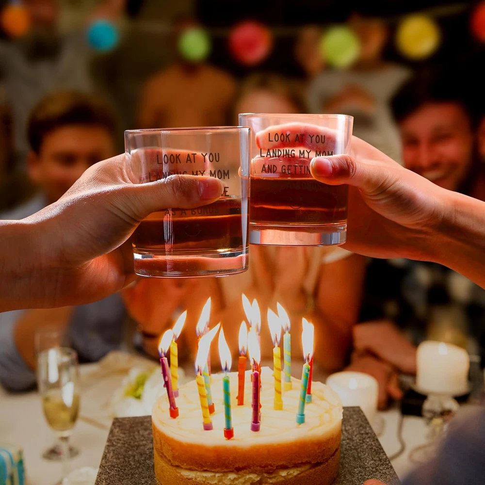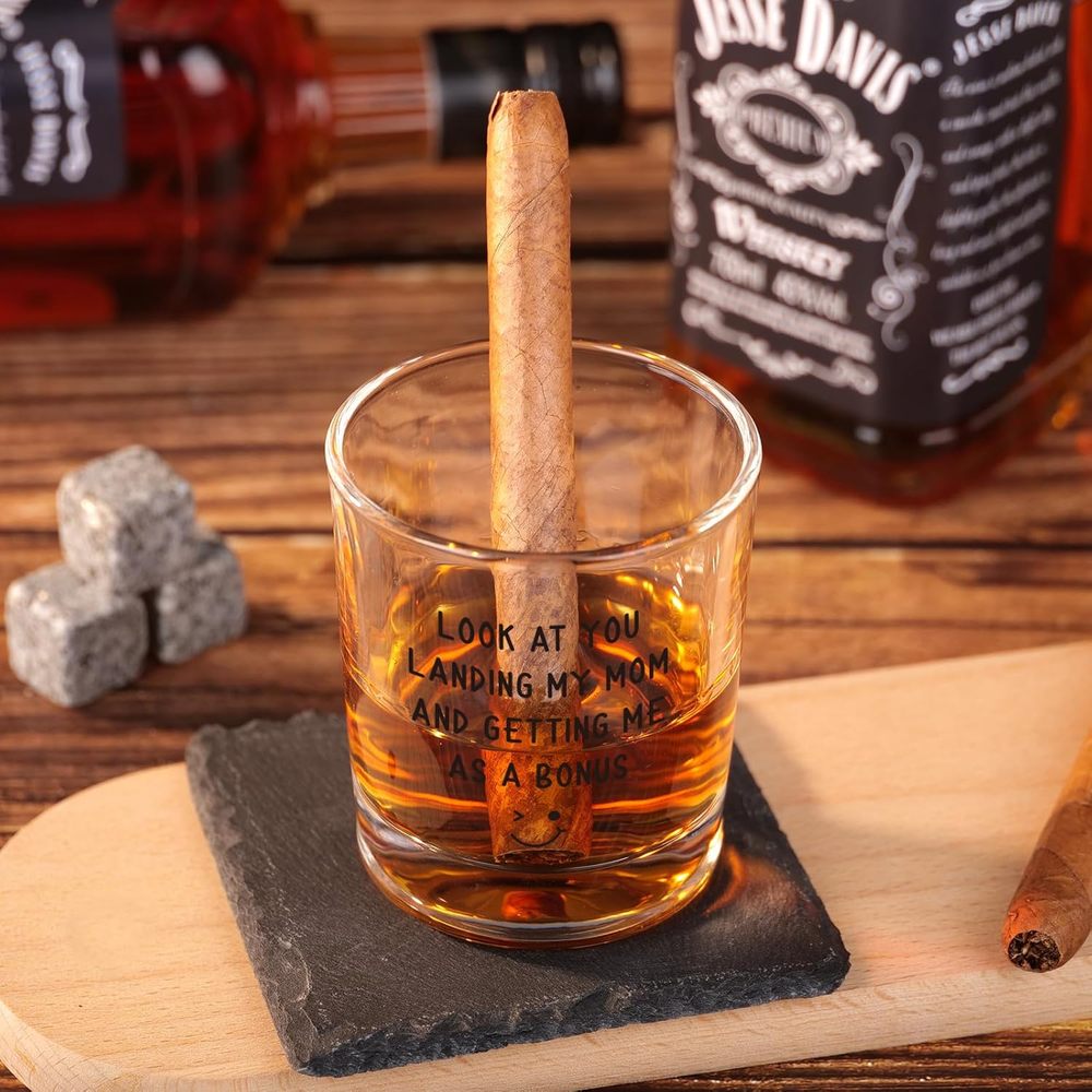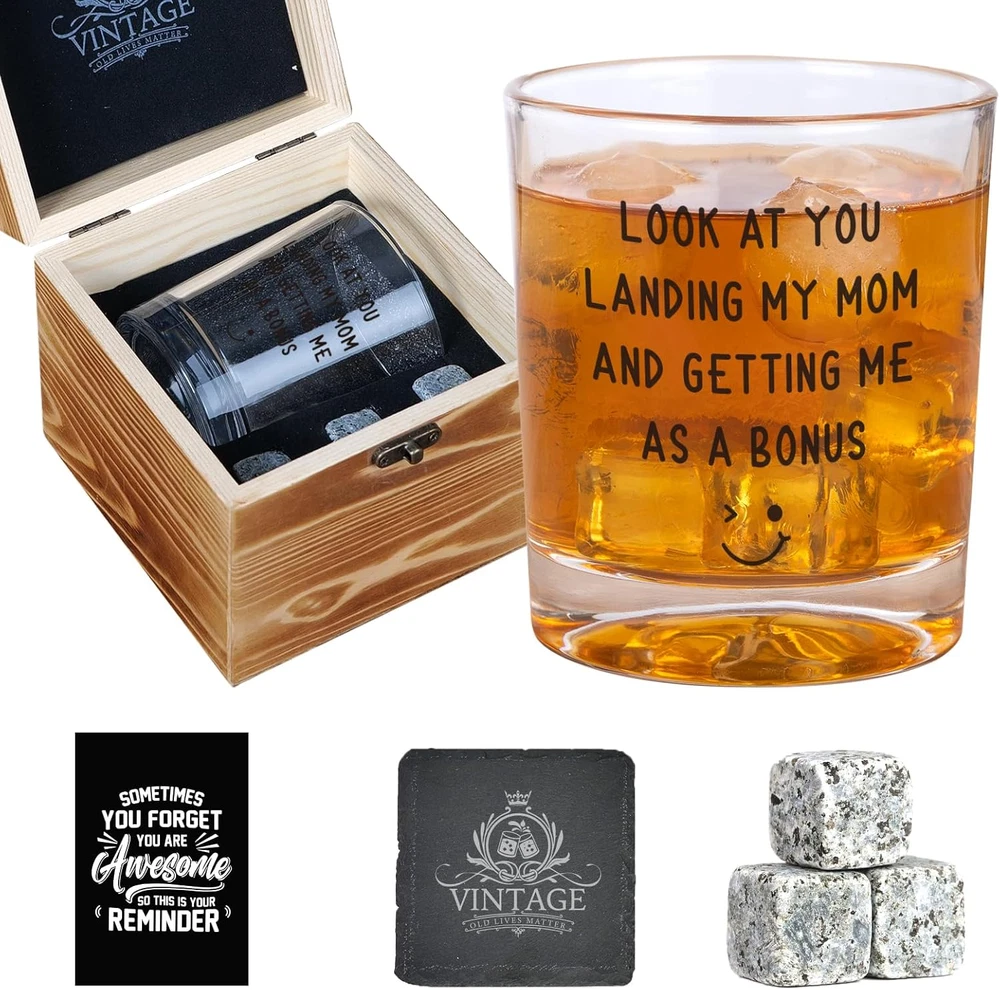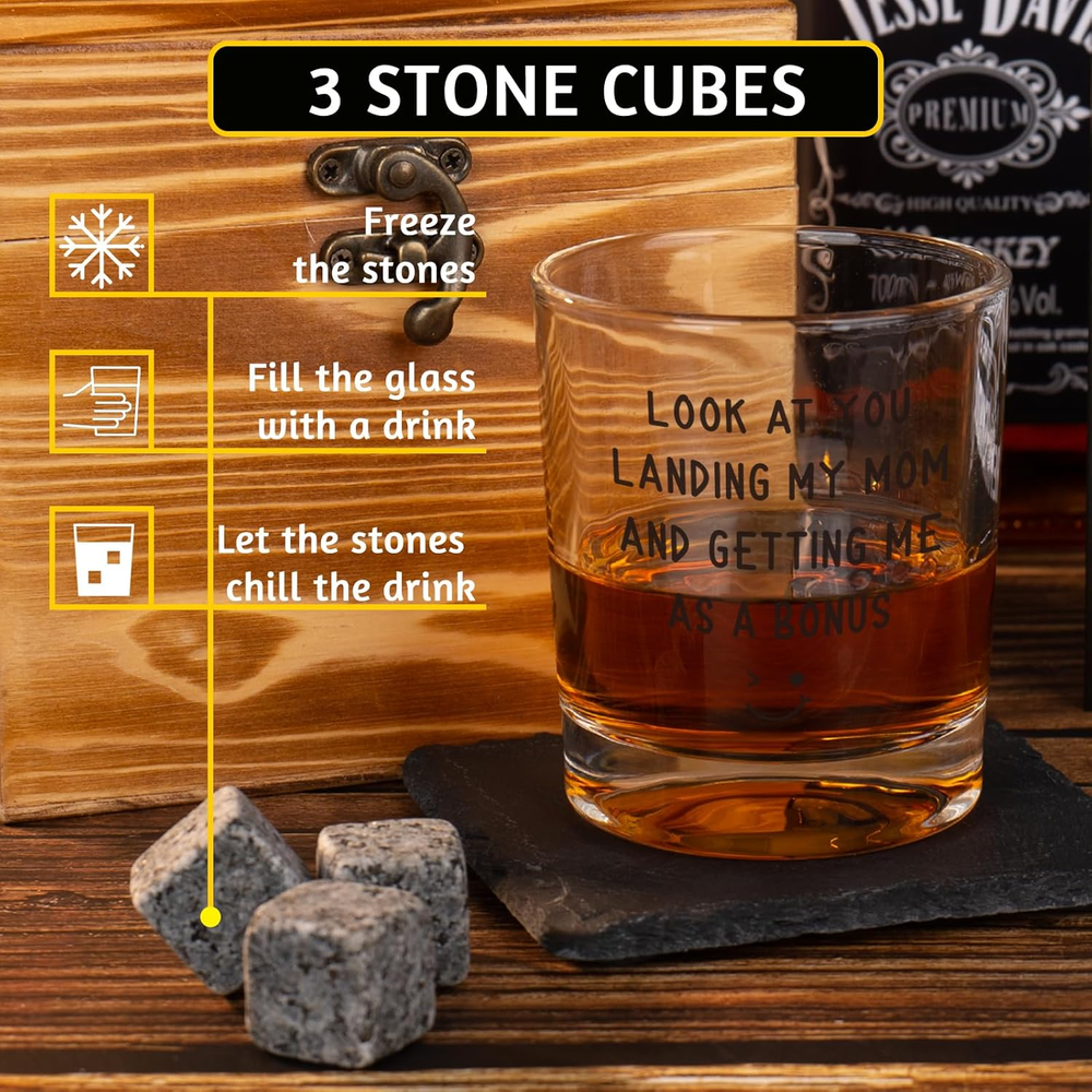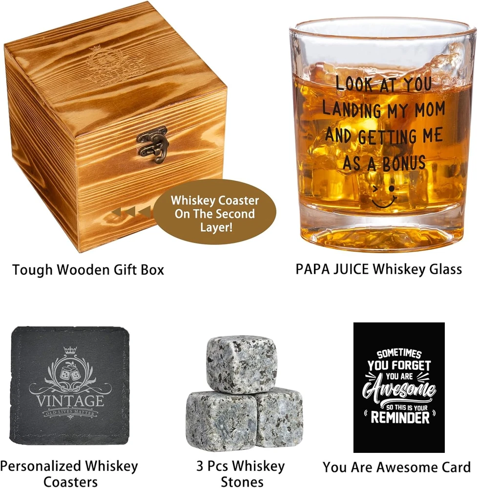 【Father Day Gifts From Step Daughter】Looking for a humorous, heartfelt Father's Day gift from a stepdaughter?Our whiskey set is perfect for stepdads who love quality whiskey.This set includes a handmade wooden box, a 7-oz whiskey glass with the playful message"LOOK AT YOU LANDING MY MOM AND GETTING ME AS A BONUS," a slate coaster, 3 whiskey stones, and a heartfelt card.When your stepdad opens this Father's Day gift,he'll laugh and feel appreciated. The card reminds him how much he means to you. 【Enhanced Whiskey Tasting Experience】Enjoy premium whiskey with chilled stones that preserve its rich flavor without dilution. These exceptional stones are ideal for step dads who are whiskey enthusiasts. They ensure every sip is a delight, whether you're serving whiskey, scotch, bourbon, or cocktails. This fathers day gifts from step daughter set includes 3 whiskey stones to enhance the tasting experience. The included card adds an extra layer of personalization to the gift. 【Unique Whiskey Coasters】Ithmahco's slate coasters are crafted from high-quality natural slate. Each piece is carefully selected and polished to ensure quality and beauty. The unique texture and color of every coaster make them a distinctive work of art. They complement the special whiskey glass perfectly. The fathers day gifts from step daughter also include a card, making it a complete and thoughtful gift for step dad. 【Step Dad Gifts Preparation】Don't wait! Order now! Ithmahco's handmade wooden gift box is elegantly designed. Avoid the embarrassment of a poorly packaged gift. Our fathers day gifts from step daughter are ready to be given as is. The included card adds a personal message to the gift. No need to worry about wrapping – just send it as is for a perfect presentation. This gift set celebrates the bond between stepdads and stepdaughters, making it ideal for stepdad gifts from daughters. 【Cool Gift For Stepdad】Ithmahco's whiskey glass is more than just a thoughtful gift; it's a testament to the love and respect you hold for your stepdad, honoring his role in your life and the incredible impact he has made. Imagine your stepdad sitting back and enjoying his favorite whiskey in this personalized glass. Every sip he takes will be a reminder of the profound connection you both hold dear. It symbolizes the enduring support and love you share. It's perfect as bonus dad gifts. Product Description Father Day Gifts From Step Daughter Looking for a humorous, heartfelt Father's Day gift from a stepdaughter?Our whiskey set is perfect for stepdads who love quality whiskey. Step Dad Gifts Preparation Enhanced Whiskey Tasting Experience WHAT STOPS YOU ? Cheer for the Best Step Dad ever. The unique texture and color of every coaster make them a distinctive work of art. They complement the special whiskey glass perfectly. The fathers day gifts from step daughter also include a card, making it a complete and thoughtful gift for step dad. Happy Father's Day More Choice for Whiskey Glass Sets Add to Cart Add to Cart Add to Cart Add to Cart Add to Cart Customer Reviews 4.8 out of 5 stars 246 4.8 out of 5 stars 246 4.8 out of 5 stars 246 4.8 out of 5 stars 246 4.8 out of 5 stars 246 4.8 out of 5 stars 246 Price $19.99 $ 19 . 99 $22.99 $ 22 . 99 — $25.99 $ 25 . 99 $24.99 $ 24 . 99 $22.99 $ 22 . 99 Theme New Dad uncle cup brother DAD DADDY GRANDPA Occasion Father's Day Father's Day Father's Day Father's Day Father's Day Father's Day Whisky Stones ✔ ✔ ✔ ✔ ✔ ✔ Whisky Coaster ✔ ✔ ✔ ✔ ✔ ✔ Wooden Gift Box ✔ ✔ ✔ ✔ ✔ ✔ Update Whisky Taste Experience ✔ ✔ ✔ ✔ ✔ ✔ Giftable ✔ ✔ ✔ ✔ ✔ ✔