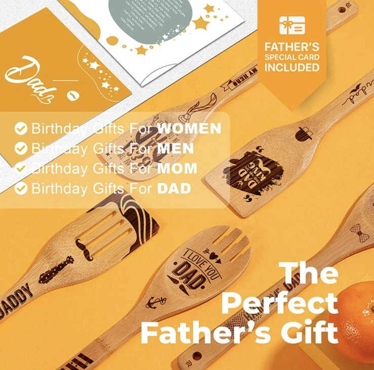 Fathers Day Wooden Bamboo Cooking Spoon Set Dad Kitchen Gift 6 Customized Pieces.