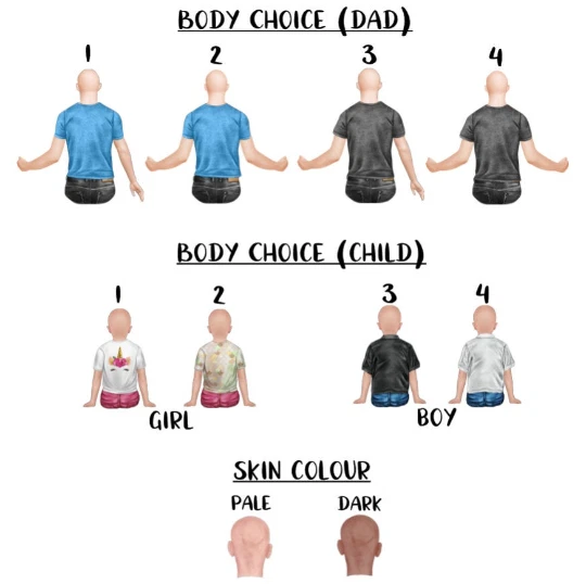 Material 300 GSM Card Dimensions A4 Description Fathers Day A4 Print - Young Child How to order Please input all the following information into the 'message to seller' box. Dads Name: Child/Childrens Name: Body Choice (Dad): Body Choice (Child) (Boy or Girl): Skin Colour: Dad Hair No: Child Hair No: Quote: PLEASE NOTE You will be sent a proof before it is printed to ensure you are happy with it. These are usually sent out 24-48hrs after purchase, so please check your emails and messages. The quicker you sign off the proof, the sooner you will receive your print, we will not send unless it has been signed off. Colours on proofs may vary slightly due to computer resolutions All prints can be customised Any questions, please do not hesitate to ask.
