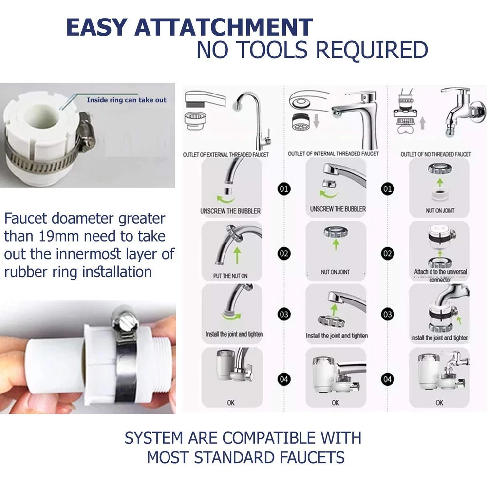 Faucet Tap Water Purifier promises cleanliness and purity in tap water at home. The faucet water filter adopts an advanced coconut shell-activated carbon block with a filtering precision of 0.1 microns. Our product reduces chlorine, fluorine, lead, unpleasant taste, sediment, turbidity, and other harmful pollutants in the tap water, but retains beneficial minerals. The Faucet Tap Water Purifier provides cleaner & safer water for daily use and takes care of you and your family. WBM Faucet Water Filter System Better-tasting water, one clicks installation. Advance Faucet Filtration System offers the great design, durability, and convenience you are looking for. Specification: • Height: 4.7 inches • Width: 5.90 inches • Depth: 2.24 inches • Weight: 1.05 lbs. What is in the Box One WBM tap faucet filtration system, Multifunctional connectors and one filter. REDUCES LEAD & FLUORIDE: water filtration system filters contaminants such as lead, fluoride, chlorine, benzene and asbestos, while retaining the natural minerals & characteristics – leaves you with clean fresh drinking water FIVE STAGE FILTRATION: Activated carbon filter reduces contaminants, eliminates taste and odor, post-filtration layer removes sand, rust, suspended solids and other little particles – provides a higher degree of protection and safety 3000L FILTRATION CAPACITY: Our water filter system can be used for 3 to 6 months depending on the local water quality. You do not have to worry about buying bottles of filtered water, save your money, reduce the use of plastic and enjoy clean water anytime for any purpose EASY TO INSTALL & USE: water purifier easily fixes to your standard faucet making tap water cleaner and great-tasting. Filtration system is easy to install; no tools are required COMPATIBLE WITH STANDARD FAUCETS: Sink water filter fits most faucets, does not fit irregular, hand-held, or pull-out faucets; ergonomic sleek design gives an elegant look