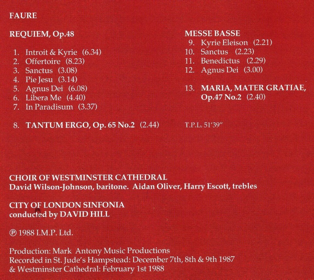 Title Fauré - Requiem Artists Choir of Westminster Cathedral David Wilson-Johnson, baritone Aidan Oliver, treble Harry Escott, treble City of London Sinfonia David Hill, conductor Label IMP Classics [PCD 2015] EAN/UPC 5010946201527 Track listing Gabriel Fauré Requiem , Op.18 Tantum ergo , Op.65 No.2 Messe Basse Maria, Mater gratiae , Op.47 No.2 See image(s) for detailed track listing. If you need any further details, please ask. Cases Most cases will show signs of shelf wear. Condition CD - In near mint condition. Booklet - In near mint condition. Back Insert - In near mint condition. Postage & Payment If you want me to post the CD without the plastic case, please let me know. I will post the CD along with the booklet and other paper parts in secure packaging. For all buyers who purchase more than one item at the same time please pay for them together or request the total amount payable. For buyers who purchase 2 or more items with postage charges, please request the total amount payable as there will often be a saving from the combined postage which might be further reduced if you do not need the plastic cases. Questions If you have any questions, please do not hesitate to ask. Returns I try to be fair and accurate in all my descriptions. Please read the listing details carefully before purchasing. If there is a problem, we can work together to resolve it. Negative feedback does not go away and should only be left as a last resort! I strive for positive feedback and will make every attempt possible to resolve the issue if we made a mistake. (It happens) Please do not assume a mistake is intentional. If you are not completely satisfied with your purchase, please advise me accordingly so that we can arrange for the item to be returned in its original condition within 30 days of receipt. Returned items should be in their original packaging with any enclosed documentation. Please note, goods will only be accepted for return if they are dispatched within 30 days of delivery, unless you have notified me otherwise. November 24