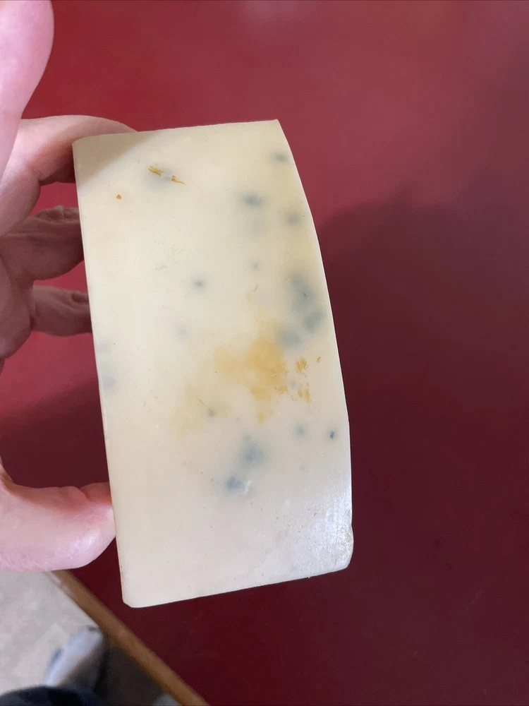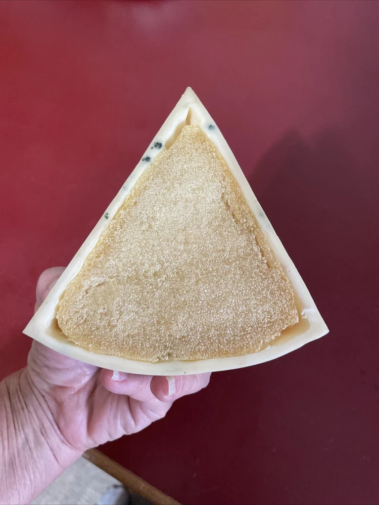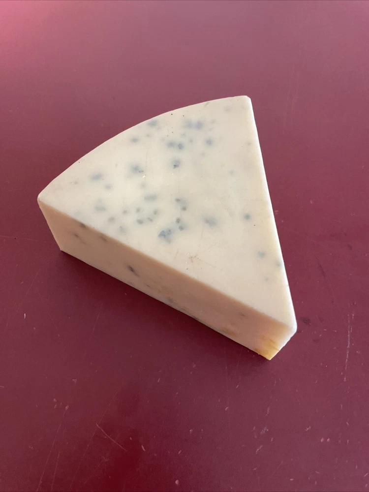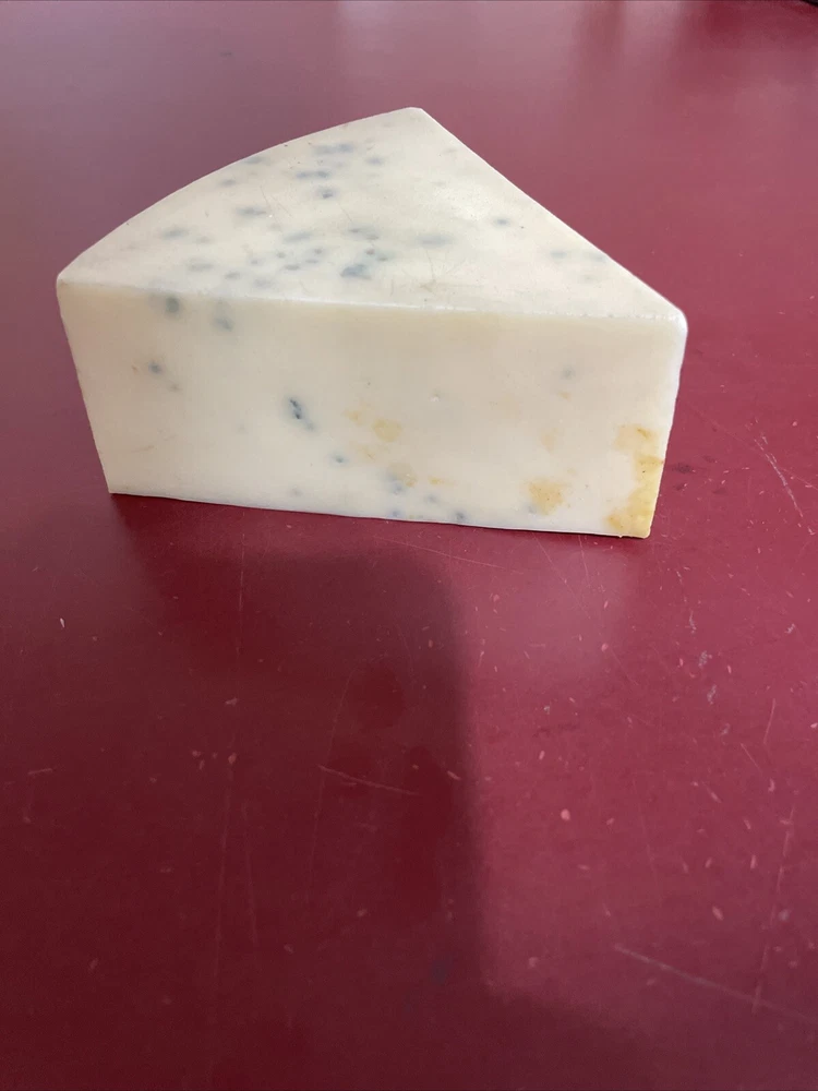 Faux Food Blue cheese Wedge Deli Display Stage Movie PROP Iwasaki This is about 4 3/4" and weighs 8 oz I believe this is made by Iwasaki Images of America - it retails on their site for $52.84 Missing is covering on the bottom. Please look at photos carefully