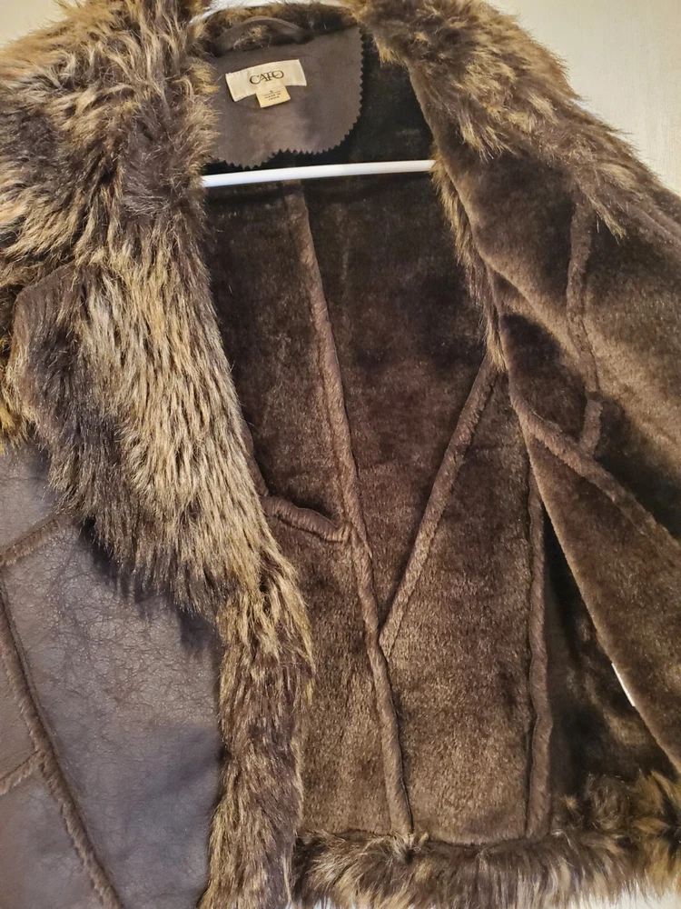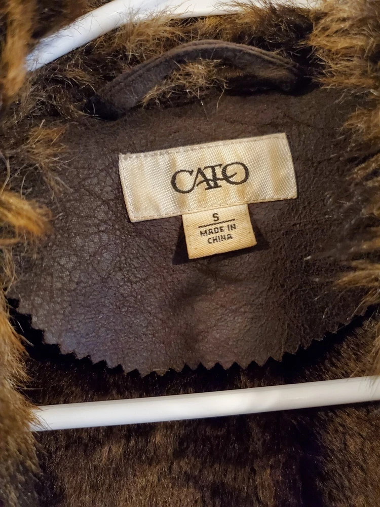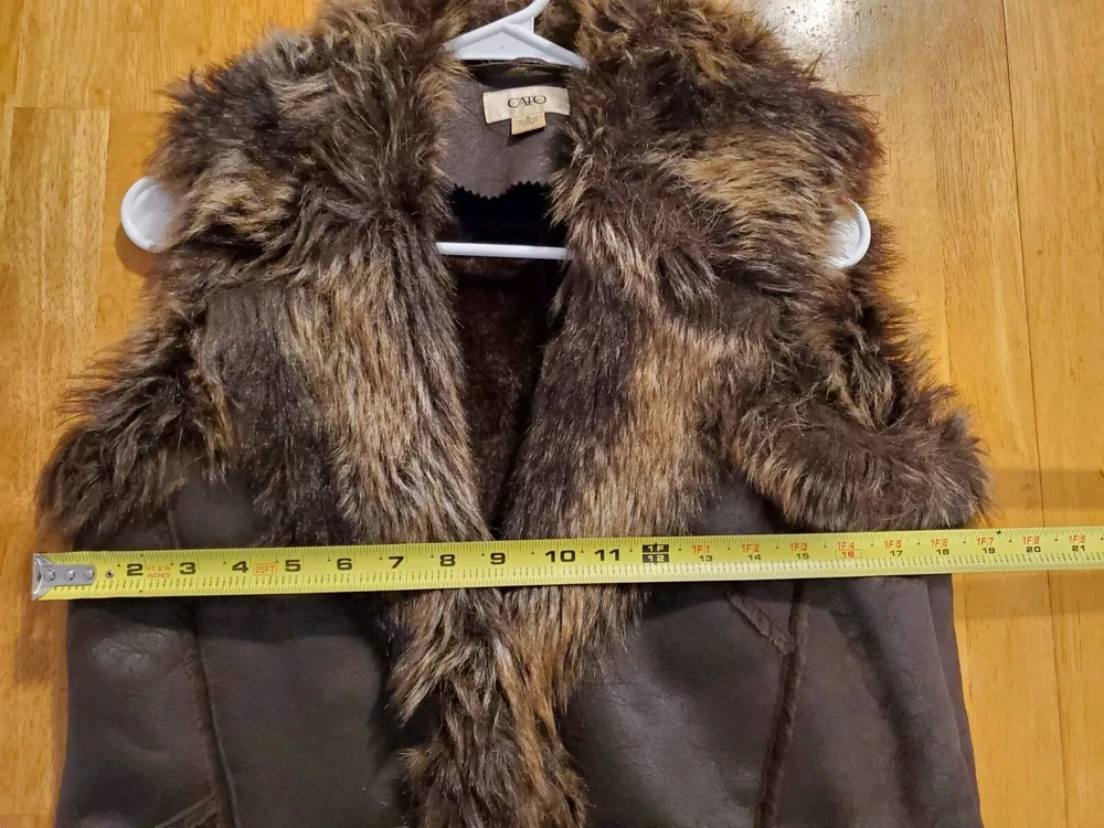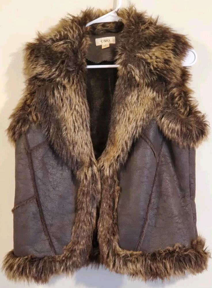Size: S Fit: Regular Jacket/Coat Length: Short Type: Vest Brand: Cato Accents: Fur Trim Garment Care: Machine Washable Outer Shell Material: Faux Leather Color: Brown Size Type: Regular Department: Women Style: Vest Lining Material: Polyester Occasion: Costume Features: Collared Sleeve Length: Sleeveless Closure: Snap Season: Fall Theme: Steampunk, Tribal