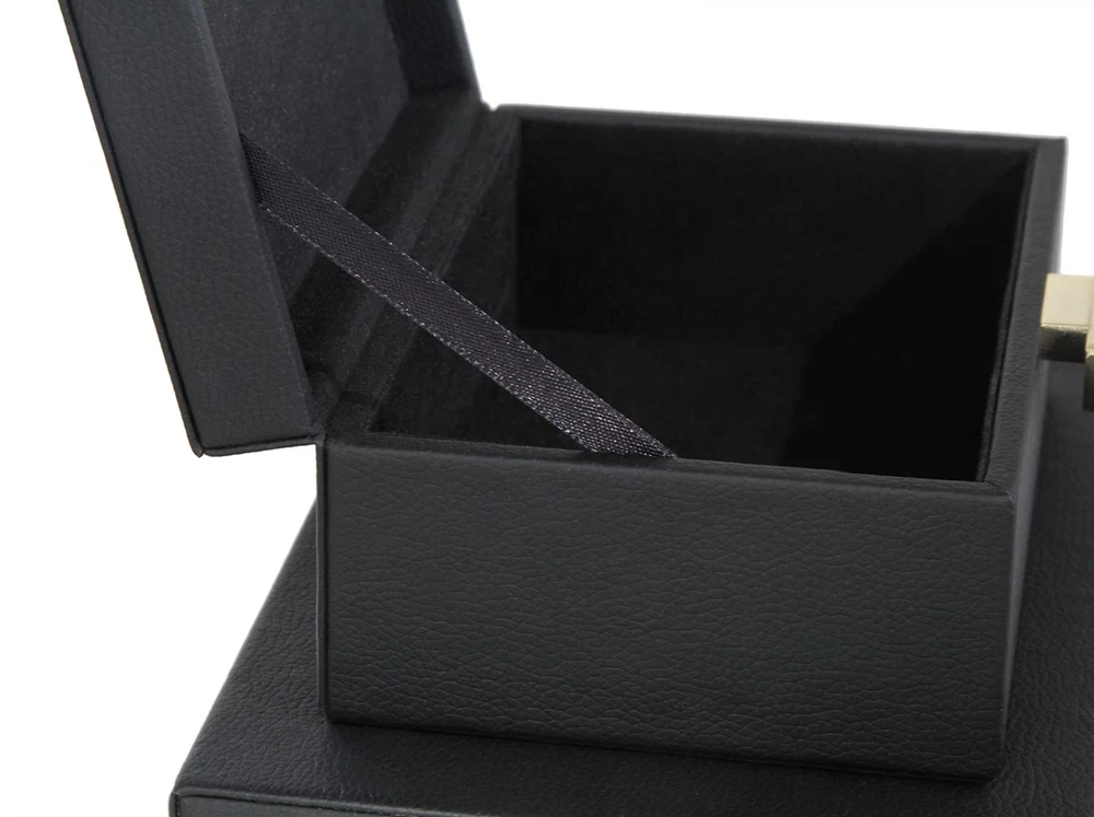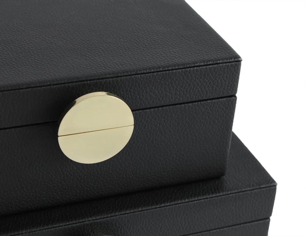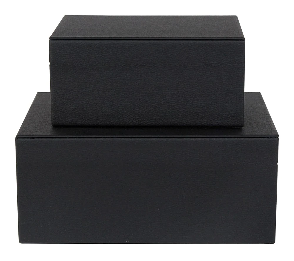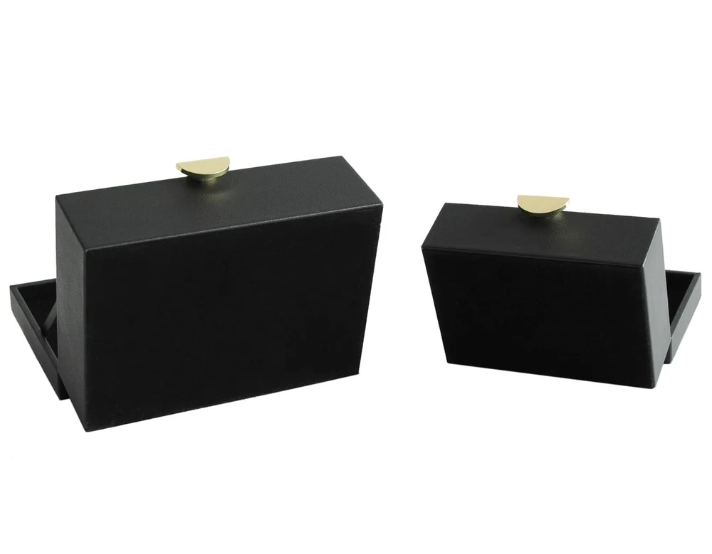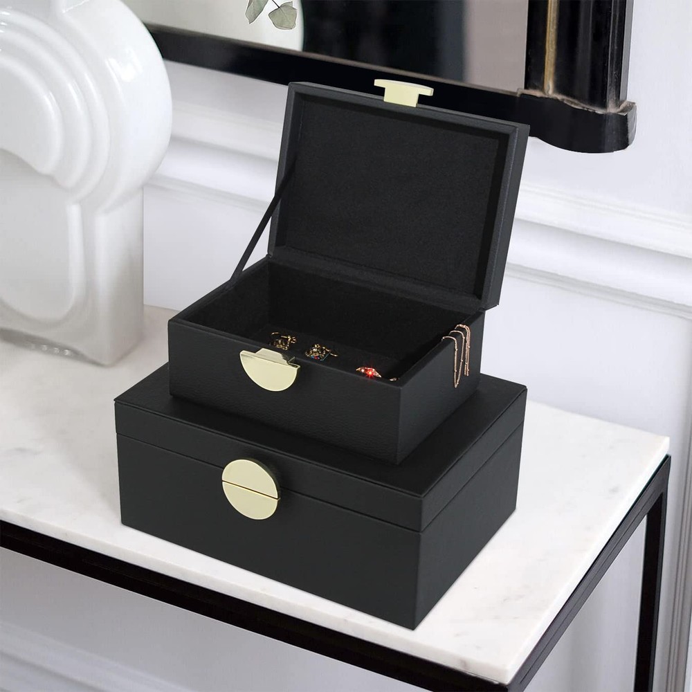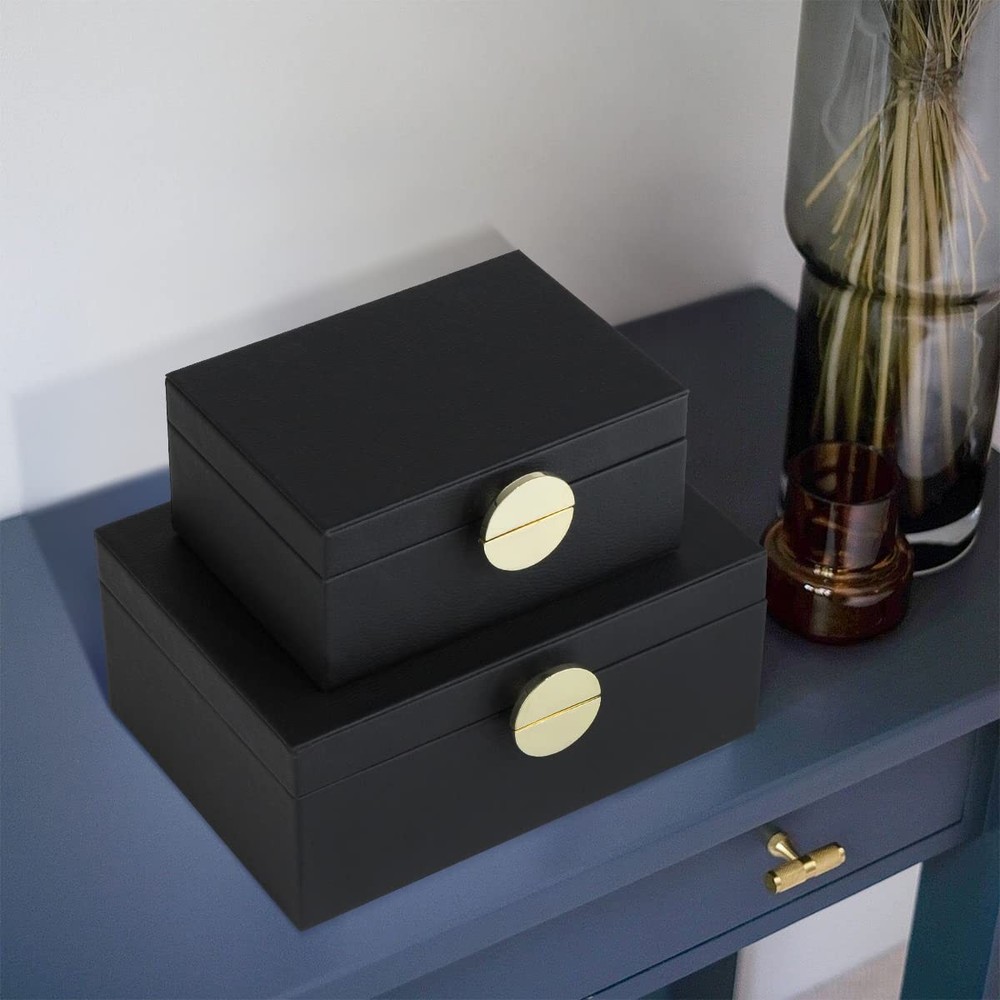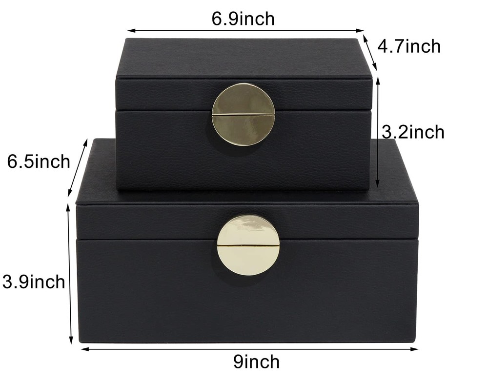 Beautiful boxes are handcrafted very well,wood construction covered with high quality black faux leather,lined with soft velvet,keep your favorite items away from scratches and dust. Hand-made jewelry storage boxes organizer are great for clearing space on the dresser. Store your necklaces, rings, bracelets, watches, sunglasses and other valuables in a safe place. Elegant way to store needed items, hide clutter anywhere in the home, using these boxes on your entrance table to store gloves wallet keys and remotes! Set of 2 pcs storage boxes, perfect for storing medications photos keepsakes and other objects, you can use them separately. Also a sophisticated touch of elegance to your room. Useful boxes for decorative purposes and do an excellent job, functional and decorative, very glamorous decor. Set of 2 nested Boxes size: L: 9 x 6.5 x 3.9inches S: 6.9 x 4.7 x 3.2 inches.