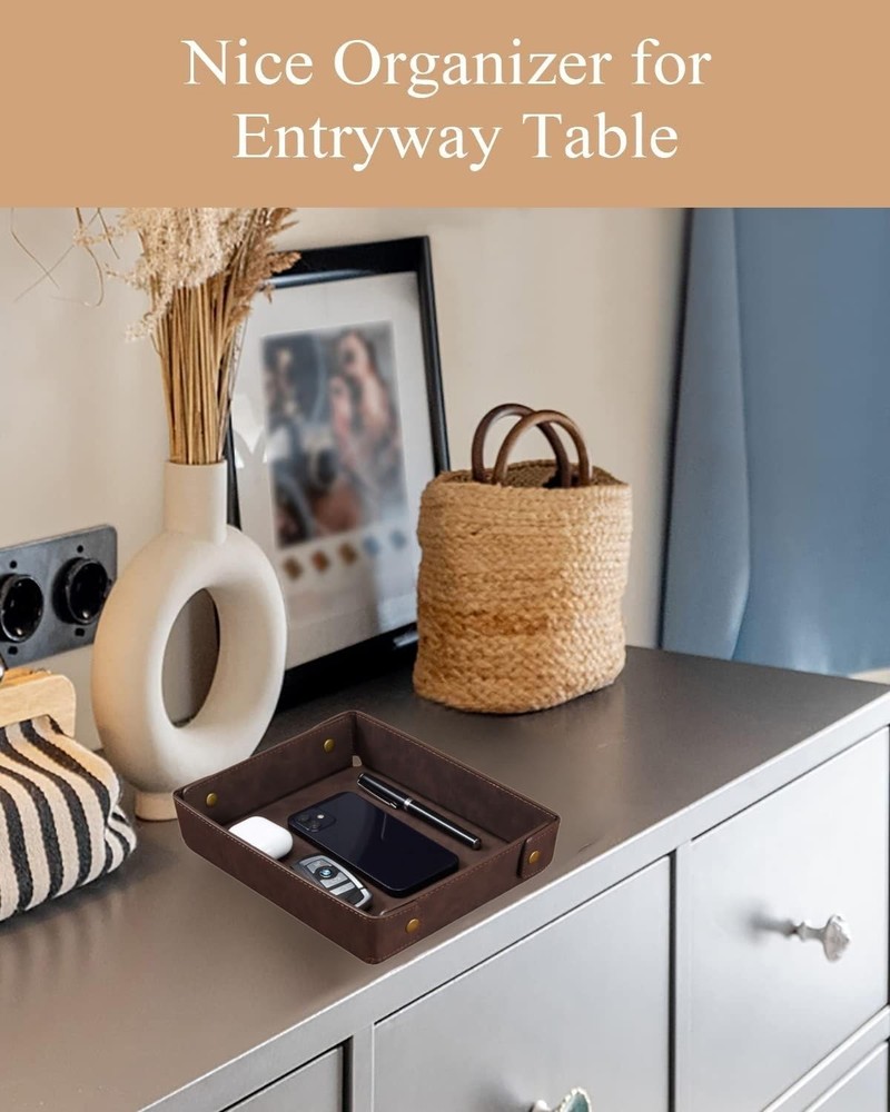 I don't know whether you have such an experience that I do not know where I have ever put them when I want to find my keys or eyeglass and other small items. Especially the morning when I need to go to work or school. So why not find a valet tray organizer, when you go home, put all the little but important stuff in it, no matter when you can find them, keep a neater life so that you will be more efficient in the future. valet tray EDC dump tray is designed for daily use and it helps you to reach out your belongings easily whether you are in your home or office, This tray prevents those unnecessary morning searches for misplaced items Features Made of soft and good PU leather this valet tray will not hurt your expensive items, it is also very durable Premium Workmanship sturdy enough to hold it together. They will not pop apart against the sides of the valet Easy to Assemble and good snap clasp Buttons-assemble construct design, catchall tray is easy to assemble and more sturdy Multi-Occasion Applicable you can use it as a dice tray for board games, EDC dump tray, caddy holder for key, Coin, Wallet, Watch, Eyeglasses, spare change, organizer for TV stick, remote control, men's bedside organizer Ideal Gift A Valet tray can be a nice gift to your friend, family, colleague Specification Weigh: 6 oz Size: 9.84 × 7.87 × 1.97 inches when snapped, 13 × 11.42 × 0.2 inches when unsnapped Material: 100% PU leather Closure Type: Snap Color: Dark green/Royal blue/Brown coffee/Vintage yellow You Will Get 1× Valet Tray-EDC dump tray Please Note: Colors shown in pictures may slightly differ from the actual product due to lighting and color settings 【Compact Valet Tray Organizer】9.84 × 7.87 × 1.97 inches when snapped, 13 × 11.42 × 0.2 inches when unsnapped, limited space to keep your small but essential item in place, not only for home and office use but for travel 【Premium Material for Valet Tray】Feature soft and premium PU leather, our valet tray is no scratch to your watches, eyeglasses, sunglasses, and other expensive jewelry. What's more, it is also easy to clean 【Easy to Assemble Our Valet Tray】Features buttons-assemble construct design and exquisite workmanship, Our valet tray organizer is easy to assemble and more sturdy to keep snap stay together 【Valet Tray for Multi-Occasion】You can place our valet tray on your home TV room, office desk, bedroom nightstand, living room, dresser top desk, the entryway of your house, and more to organize and store your TV remote control, keys, coins, wallet, phone, dice, EDC, and other small items 【Nice Gifts for Your Love】A nice gift to your friend, family, classmate, and students when graduating ceremony, Mother's day, father's day, anniversary, birthday, thanksgiving day, Christmas, Valentine’s day, and more. Most importantly, our valet tray organizer supports laser engraving, you can turn it into a unique commemorative gift (After it’s been received), it is also a good gift to yourself that keeps your life and work neater