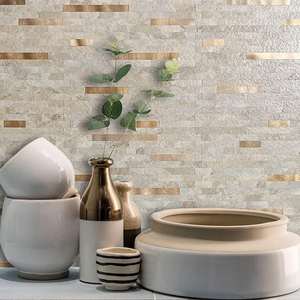2 sheets solid PVC mixed metal tiles, 11.7"x5.9"x0.12" each, covering about 0.96 square feet. Made of PVC composite laminate, realistic textured surface, anti-scratch, high impact, color fadeless, easy to cut with the utility knife. Strong foam backing tape without extra glue, just peel and stick. No deform, no peeling. Easy DIY, quick to install and save contractor costs. Waterproof & Heat resistant. Most people used in kitchen backsplash, steamy bathroom walls, laundry rooms, RV, fireplaces, etc. Easily wipe to remove stains, protect the walls from splashes and oil. It is recommended to purchase a minimum of 10% extra tiles to account for design cuts and patterns. Please capture all tiles for a project within one order, so multiple orders with long intervals may receive slightly different colors.