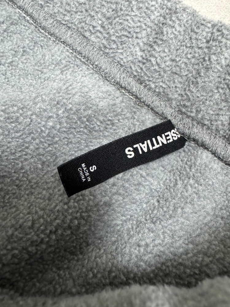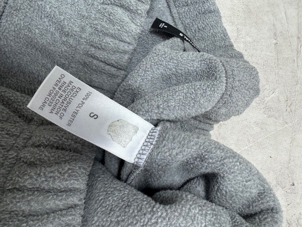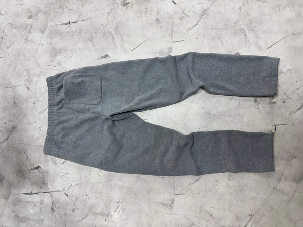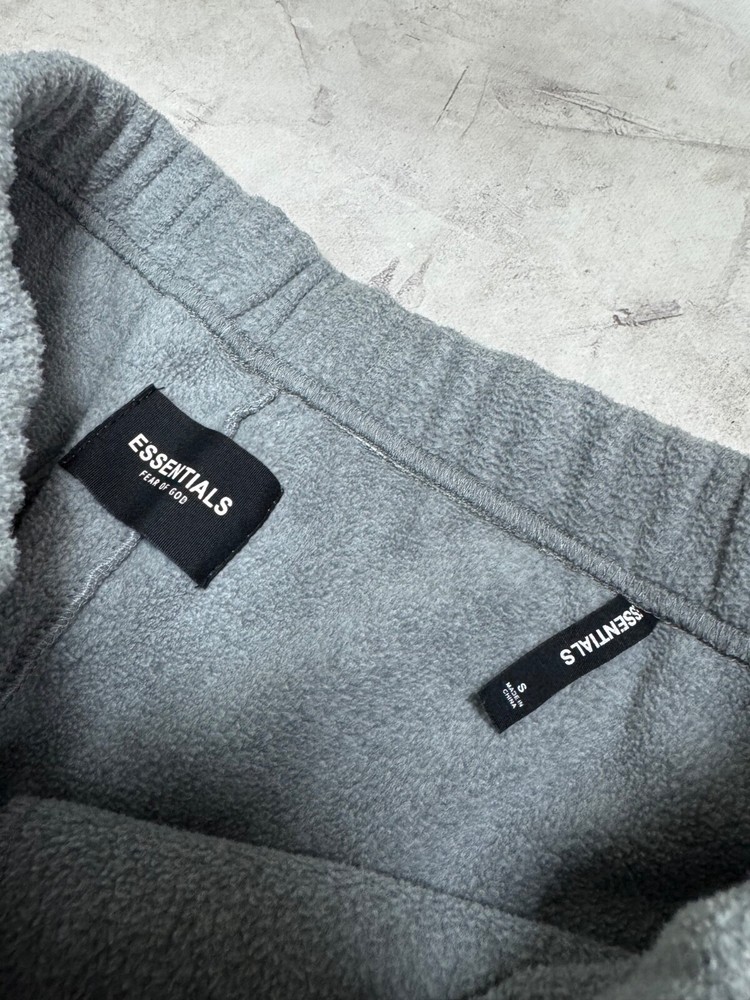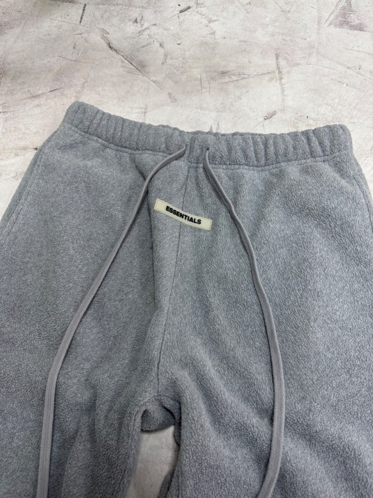The 'Fear of God's Essentials Fleece Pants' are a pair of gray sweatpants designed for men. Made of polyester fleece, these pants feature a drawstring waist and a comfortable fit in size small (30-inch waist). They also have the brand's logo as an accent and include pockets for added functionality. Suitable for all seasons, these sweatpants are a stylish and cozy choice for casual wear.