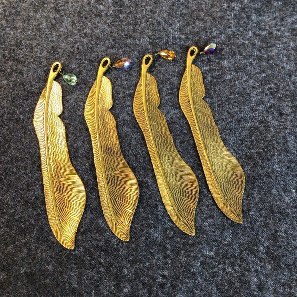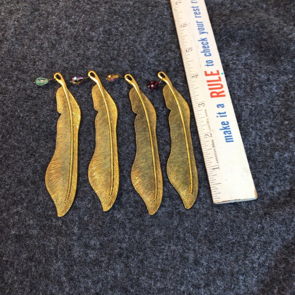 The "Feather Shaped Bookmarks Lot of 4" is a set of four gold metal bookmarks shaped like feathers. These bookmarks are designed to be extra durable, making them long-lasting and perfect for frequent use. Each bookmark is two-sided, providing a stylish and practical way to mark your place in a book or magazine. Ideal for book lovers who appreciate unique and decorative accessories, these feather-shaped bookmarks add a touch of elegance to your reading experience. Each bookmark has a colored bead on the end.
