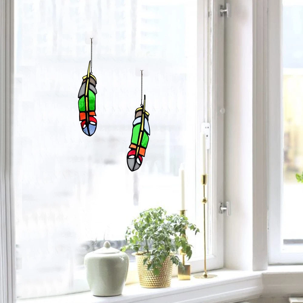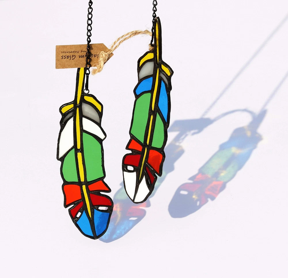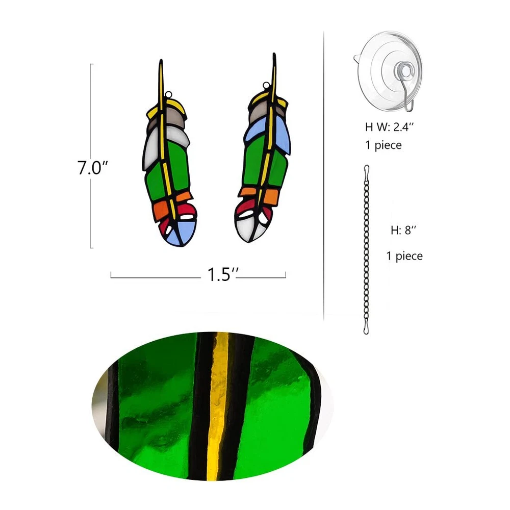 Stained Glass Window Hangings Set of 2 Stained Glass Feather Colored Glass Hanging Ornament for Wall, Window,Car and Party Decoration and Gift IdeaMade of Real Glass: Made from many pieces of red stained glass, real stained glass, not plastic or acrylic, create a unique design, 1 rope is included.What Makes Them Special: Well welded by 3mm stained glass material, color will never change and fade. Amazing Stained Glass Window Hangings: More than a maple hanging ornament, made with sun-through and opaque glass pieces that allows glass shape and textures shadow to shine through onto other surfaces, so you will get colorful sunshine on your window or wall.Perfect Gift And Decoration: This handmade stained glass panel would be a great decoration on window, car, wall, patio, garden events and parties. Also, it can be used for party favors, gifts for any occasions and everyday use.Package Contains: Stained Glass Window Hangings Set of 2 【 Mothers Day Gifts】These stained glass feather window hangings are made of real glass.Well welded by 3mm stained glass material, color will never change and fade.Beautiful feather suncatcher for window. 【Amazing Stained Glass Window Hanging】 More than a feather hanging ornament, made with sun-through and opaque glass pieces that allows glass shape and textures shadow to shine through onto other surfaces.Beautiful colored feathers stained glass suncatcher for window. 【Craft Feathers Gifts for Women】 The feathers decor truly one of the best gifts that you can give to a friend or family.Created for an amazing moment that will continue to bring happiness and comfort.christmas,mother's day,thandsgiving,new year's day gift for mom Grandmother... 【Easy to hang】Each stained glass feather will be presented with strong metal chains and sticker hooks for easy. Size: 7×1.5 INCH. 【Stained glass suncatchers】suncatcher for window,plumas para decoraciones,Christmas Home Decoration