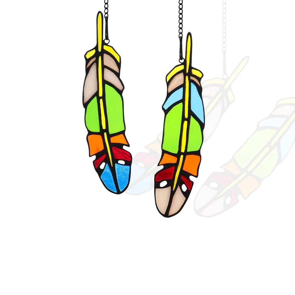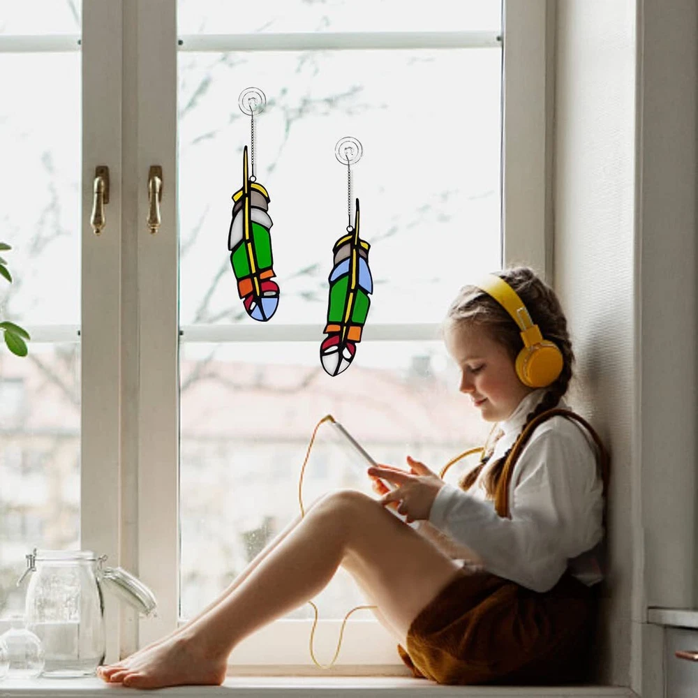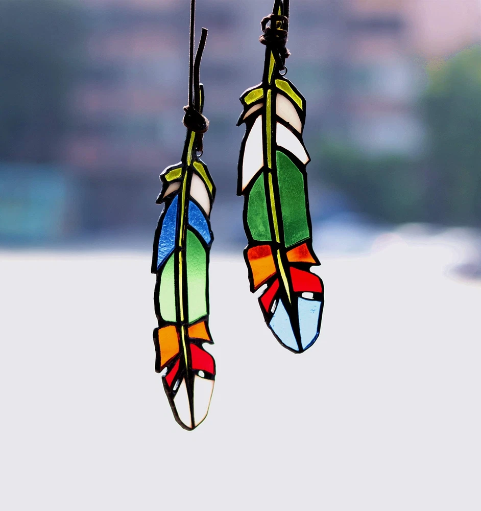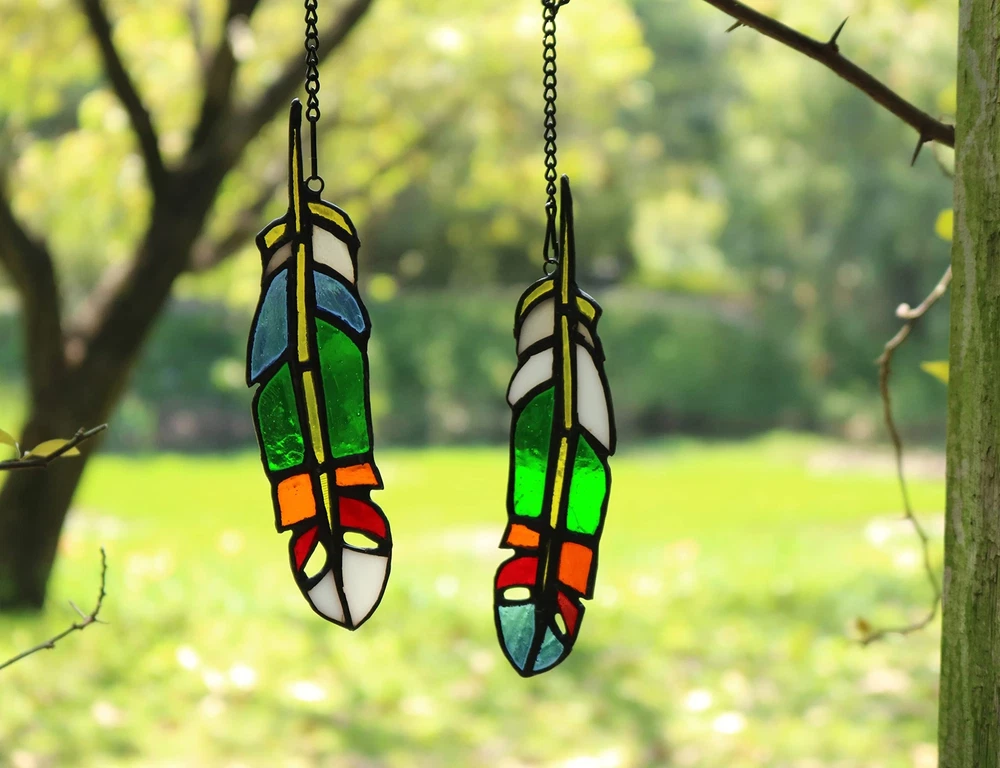 Stained Glass Window Hangings Set of 2 Stained Glass Feather Colored Glass Hanging Ornament for Wall, Window,Car and Party Decoration and Gift IdeaMade of Real Glass: Made from many pieces of red stained glass, real stained glass, not plastic or acrylic, create a unique design, 1 rope is included.What Makes Them Special: Well welded by 3mm stained glass material, color will never change and fade. Amazing Stained Glass Window Hangings: More than a maple hanging ornament, made with sun-through and opaque glass pieces that allows glass shape and textures shadow to shine through onto other surfaces, so you will get colorful sunshine on your window or wall.Perfect Gift And Decoration: This handmade stained glass panel would be a great decoration on window, car, wall, patio, garden events and parties. Also, it can be used for party favors, gifts for any occasions and everyday use.Package Contains: Stained Glass Window Hangings Set of 2 【 Mothers Day Gifts】These stained glass feather window hangings are made of real glass.Well welded by 3mm stained glass material, color will never change and fade.Beautiful feather suncatcher for window. 【Amazing Stained Glass Window Hanging】 More than a feather hanging ornament, made with sun-through and opaque glass pieces that allows glass shape and textures shadow to shine through onto other surfaces.Beautiful colored feathers stained glass suncatcher for window. 【Craft Feathers Gifts for Women】 The feathers decor truly one of the best gifts that you can give to a friend or family.Created for an amazing moment that will continue to bring happiness and comfort.christmas,mother's day,thandsgiving,new year's day gift for mom Grandmother... 【Easy to hang】Each stained glass feather will be presented with strong metal chains and sticker hooks for easy. Size: 7×1.5 INCH. 【Stained glass suncatchers】suncatcher for window,plumas para decoraciones,Christmas Home Decoration