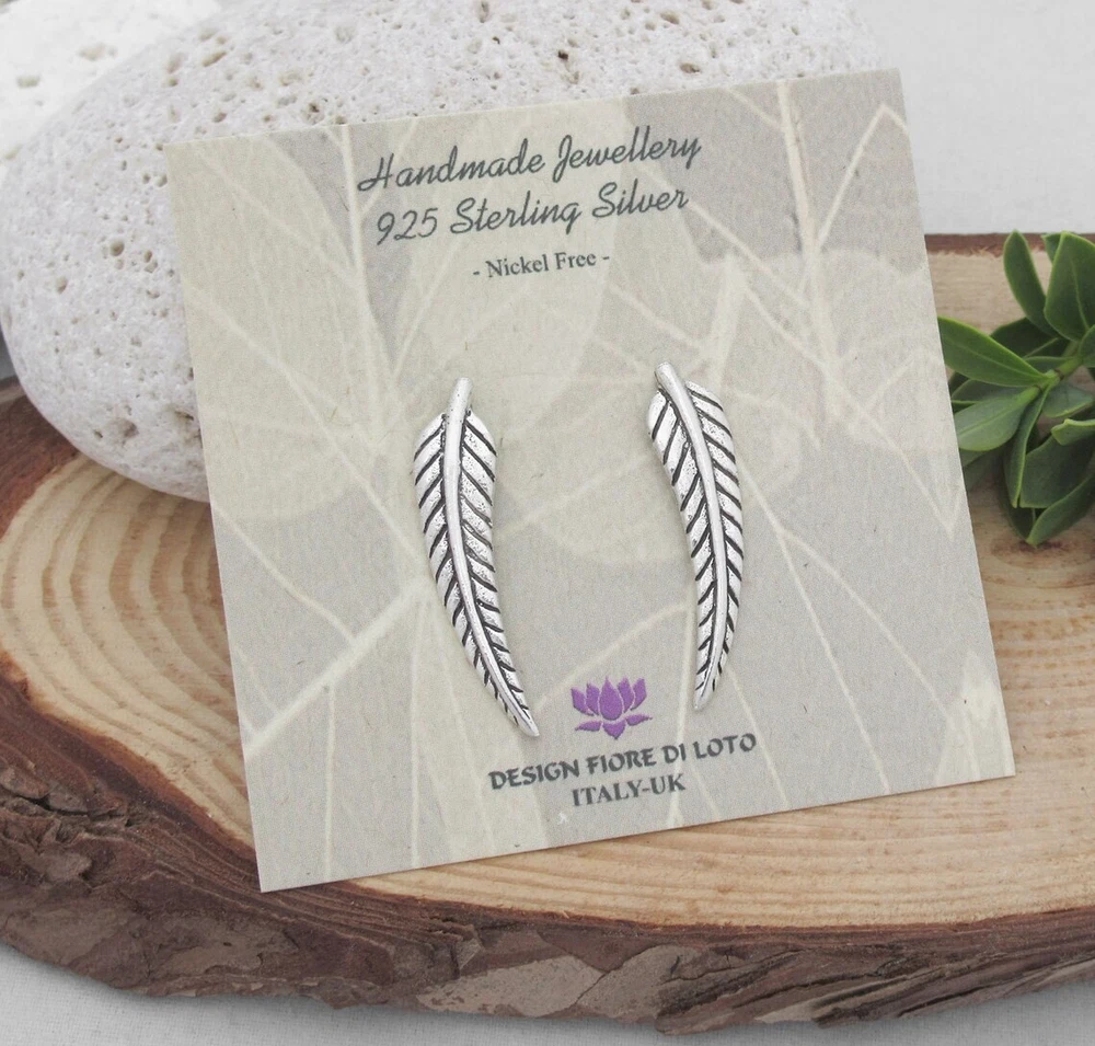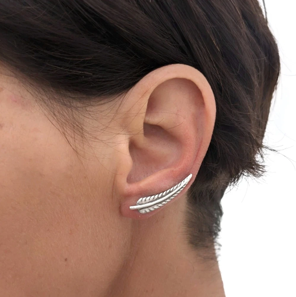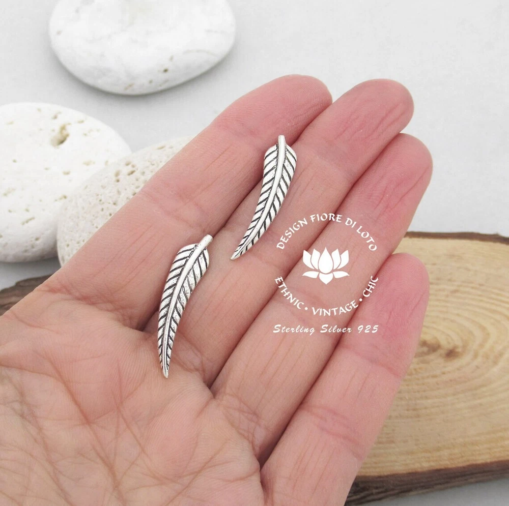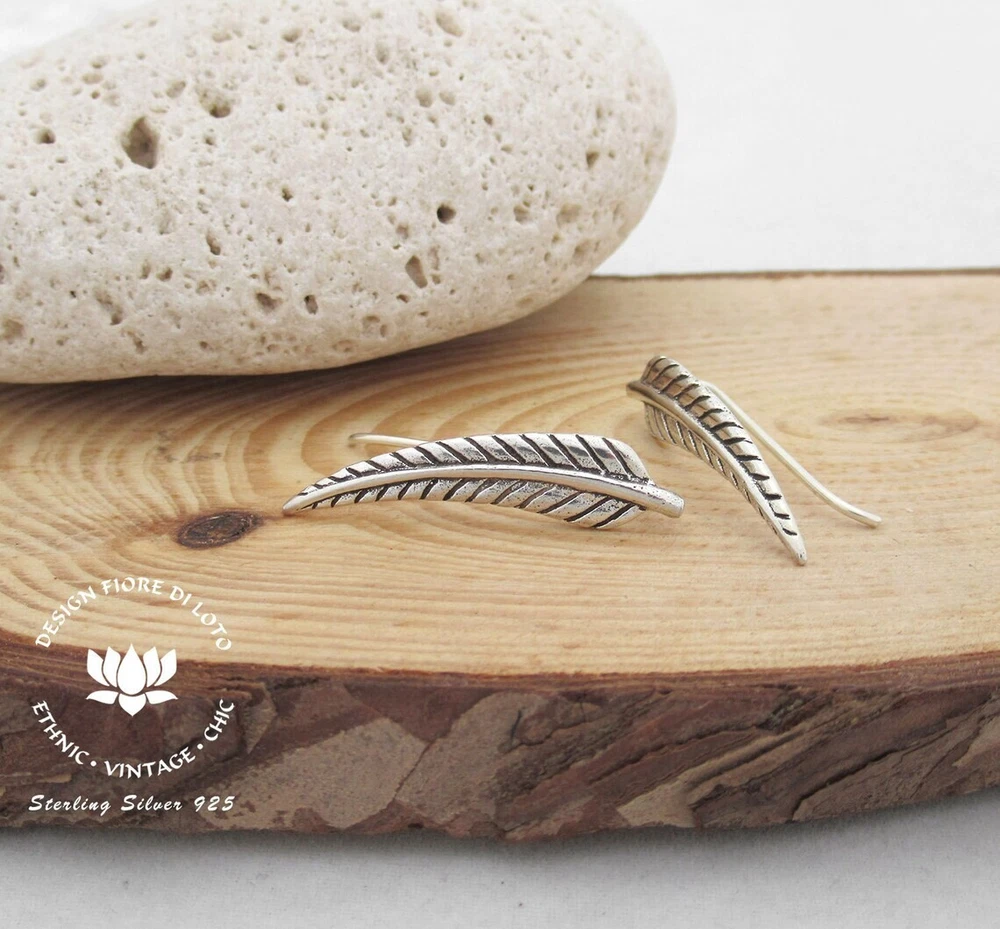 Long Feather climber earrings in sterling silver. Nickel Free. These Feather ear climbers have been carefully carved in oxidised sterling silver inspired by natural tree leaves. If you love Boho alternative style these unusual feather creepers are just for you! Lightweight, long tapered silver ear sweeps with flexible ear wire threader behind the lobe that follow the natural curved shape of the ear. Don't miss them out, Buy Now! ★ The ear climbers have a right and left side. The sweep (curve) should follow the shape of the ear. To wear, choose the correct side and thread it through a standard piercing as you would a normal dangle earrings. Then sweep the climber up along the ear and pinch it closed at the back. For best results pinch towards the end with care to avoid damaging the long pin. Dimensions Length: 3 cm Width: 0.6 cm Weight per pair: 1.09 grams SOLD ONLY IN PAIRS! Delivery Information All items dispatched from the UK. Item will be carefully packaged in eco-packaging to safeguard it during delivery. Standard Track48 Shipping with Royal Mail or Yodel included FREE . Tracking number details will be sent after dispatch (which is usually within 1 working day of purchase. Weekends/festivities excluded). Faster shipping options also available for the UK. Worldwide shipping available with Royal Mail Tracked & Signed. Returns accepted within 14 days of receipt. At customers’ expense.