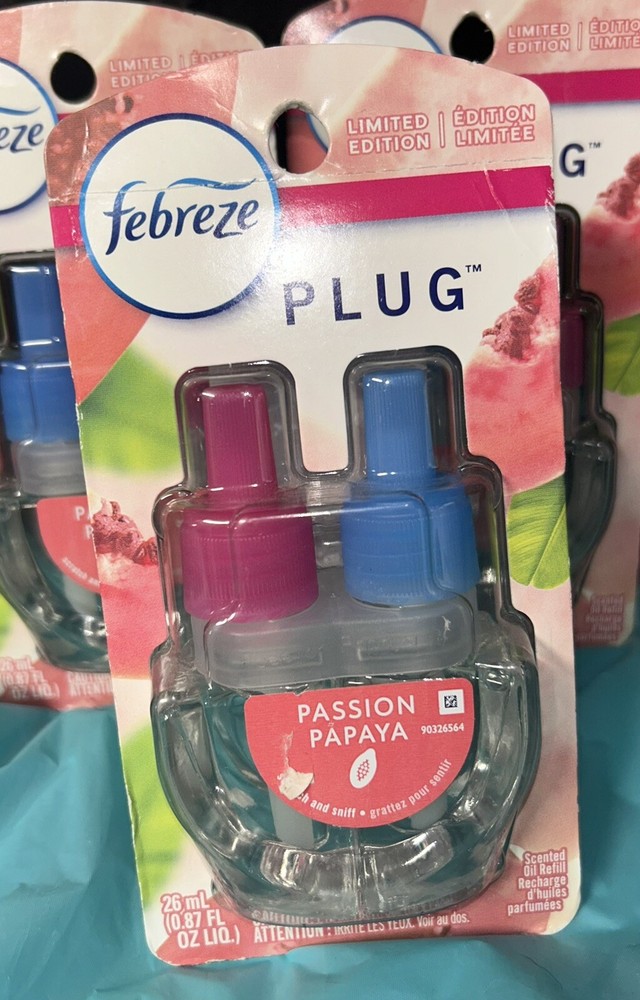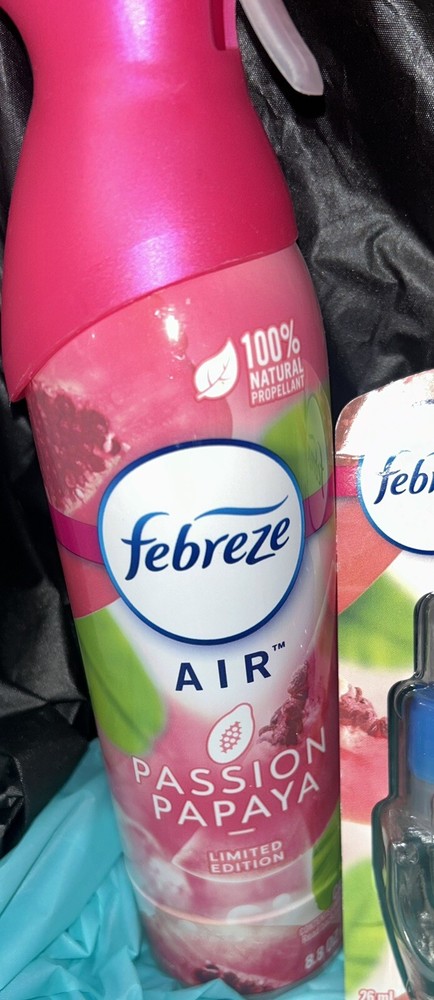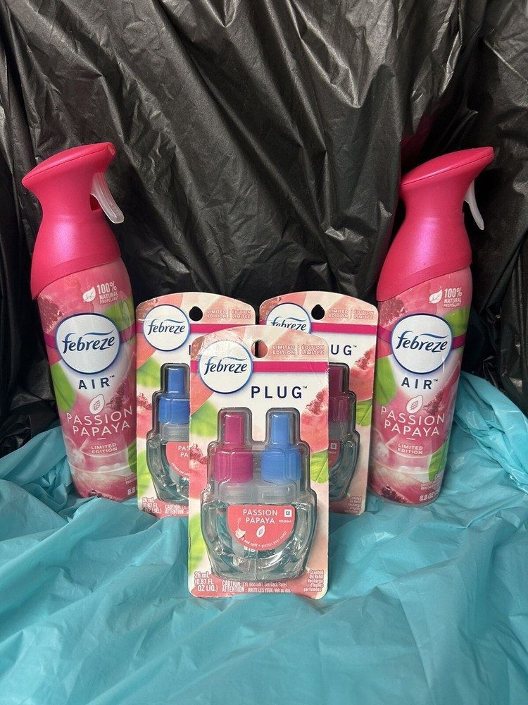 2 Febreze Air and 3 Febreze Plug-in refills are included in this assortment in limited edition Passion Papaya scent, which has been retired/discontinued by P&G. There are very few of these left around and almost are entirely gone from stores. Great summertime scent!!! I can also include a Febreze Plug-in unit for the buyer, if needed!