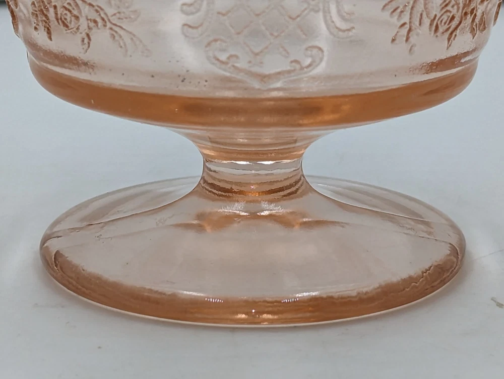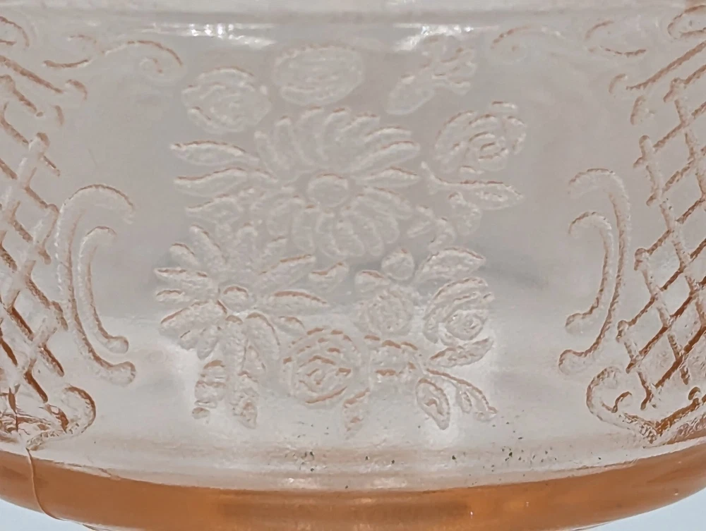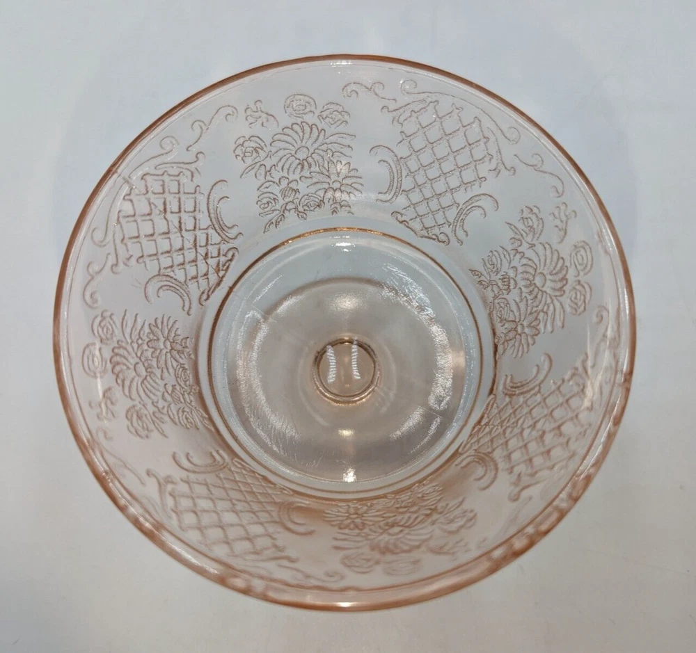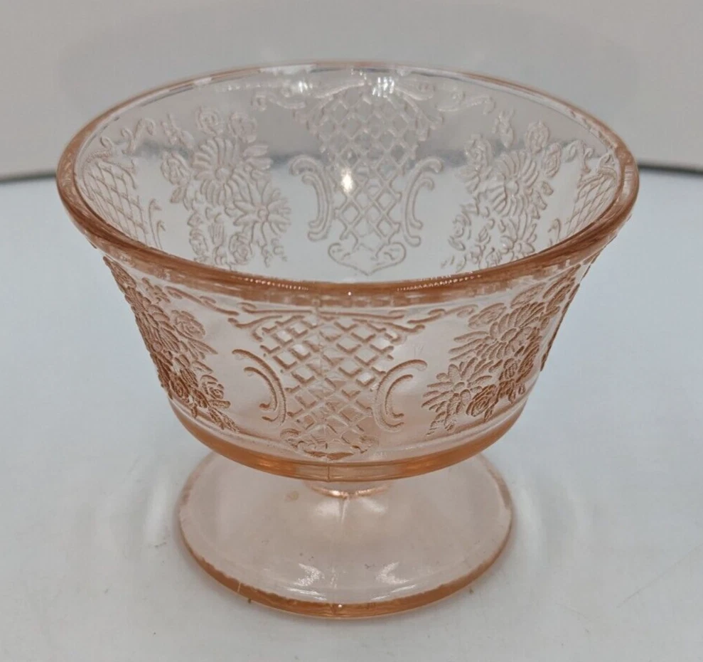 Federal Glass Normandie Pink Glass Bouquet & Lattice Footed Sherbet Dessert Cup. No cracks or breaks. There are some flea bites around the top - please see the last 3 close-up photos for reference. All of my items are carefully packed for shipping, no matter their value - $5 items are wrapped with the same care as a $200 item. My goal is to have your purchase arrive safely. I use recycled packaging when possible but mostly use new, high quality products so your item will arrive intact without damage. Large, heavy and fragile items are harder to use combined shipping with but just ask if you would like to purchase more than one item and I am more than happy to do so if feasible. If not, maybe we can work out a shipping discount. Thank you and hopefully you will visit my store again!