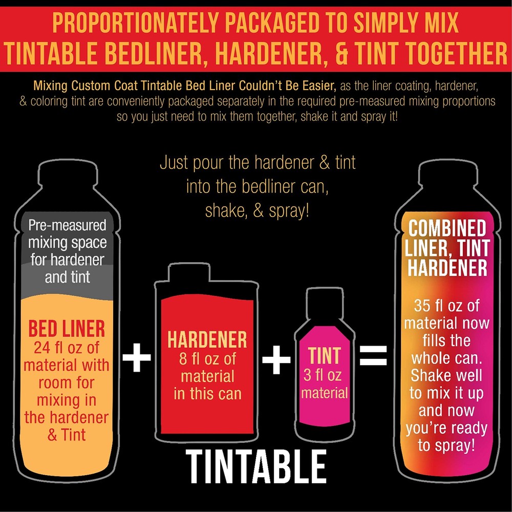 Professional Custom Coat Roll-On, Brush-On or Spray-On Truck Bed Liner 1 Quart Kit. Custom Tintable Color Kit Includes: 1 - 21 fl. oz. Cans of Tintable Truck Bed Liner Base, 1 - 8 fl. oz. Cans Custom Coat Standard Hardener and 1 - 3 fl. oz. Bottles of Basecoat Color Tint, and 1 Custom Coat 7 Piece Paint Roller Applicator Kit with 2 Rollers, Frame, 2 Brushes and Coating Tray with Liner. Estimated coverage is 110 to 130 square feet @ 10 mils wet film thickness. Custom Coat Truck Bed Liner is a premium durable long lasting textured protective coating that can tolerate extreme climatic temperature conditions. It is heat, UV resistant and waterproof, so it protects coated surfaces from rust. Use it to help dampen sounds and vibrations. Custom Coat was developed to provide a great looking durable yet flexible textured surface and is a heavy duty 2 part urethane coating that is easy to apply. It provides the ultimate surface protection for almost any application. Unlike other protective and bed liner coatings Custom Coat is a flexible material that will resist chipping, while providing impact protection and abrasion resistance. These features and benefits make it perfect for its most popular application as a truck bed liner. Custom Coat is a very versatile product that can be used for endless amount of applications. Use it on truck beds, entire vehicle exteriors, chassis, bumpers, commercial vehicles, equipment and trailers. It's also great for home uses as non-skid coating for floors including garage floors, concrete, wood, steps, walkways, wood decks, docks, bath tubs, basement floors, walls, tool boxes and engine compartments. Easily achieve professional results with our DIY Custom Coat Kit Packages. Kits are available in various sizes from 1 quart to 2 gallon. Kits are also available with either a Spray Applicator Gun or a Paint Roller Application Set. Custom Coat also offers Urethane Tint Concentrate in over 50 colors, so you can choose either a single color or use different colors to create your own multi-colored custom look or use the colors that will make a great camouflage pattern.