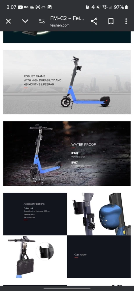 The Feishen FM-C1 Share Ride E-Scooter is a black kick electric scooter designed for adults. It has a 350 Watt motor and features such as turn signals, a headlight, brake light, and a phone holder for added convenience. This scooter is manufactured in China by Feishen and is suitable for use in outdoor sports activities. Overall, the Feishen FM-C1 provides a stylish and practical option for individuals looking for a reliable and enjoyable ride.