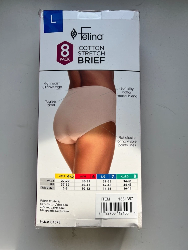 Elevate your underwear game with this 8 pack of Felina Women's Cotton Stretch Brief Underwear. Made with a comfortable blend of spandex, cotton, and modal, these briefs feature a high waist, flat elastic, and full coverage. The multicolor pack is perfect for any woman looking for a stylish and comfortable addition to her lingerie collection. Machine washable for easy care, these panties are a must-have for any woman. Whether you're running errands or dressing up for a special occasion, these briefs will provide you with the support and comfort you need. Don't miss out on this amazing opportunity to add some stylish and comfortable underwear to your wardrobe.