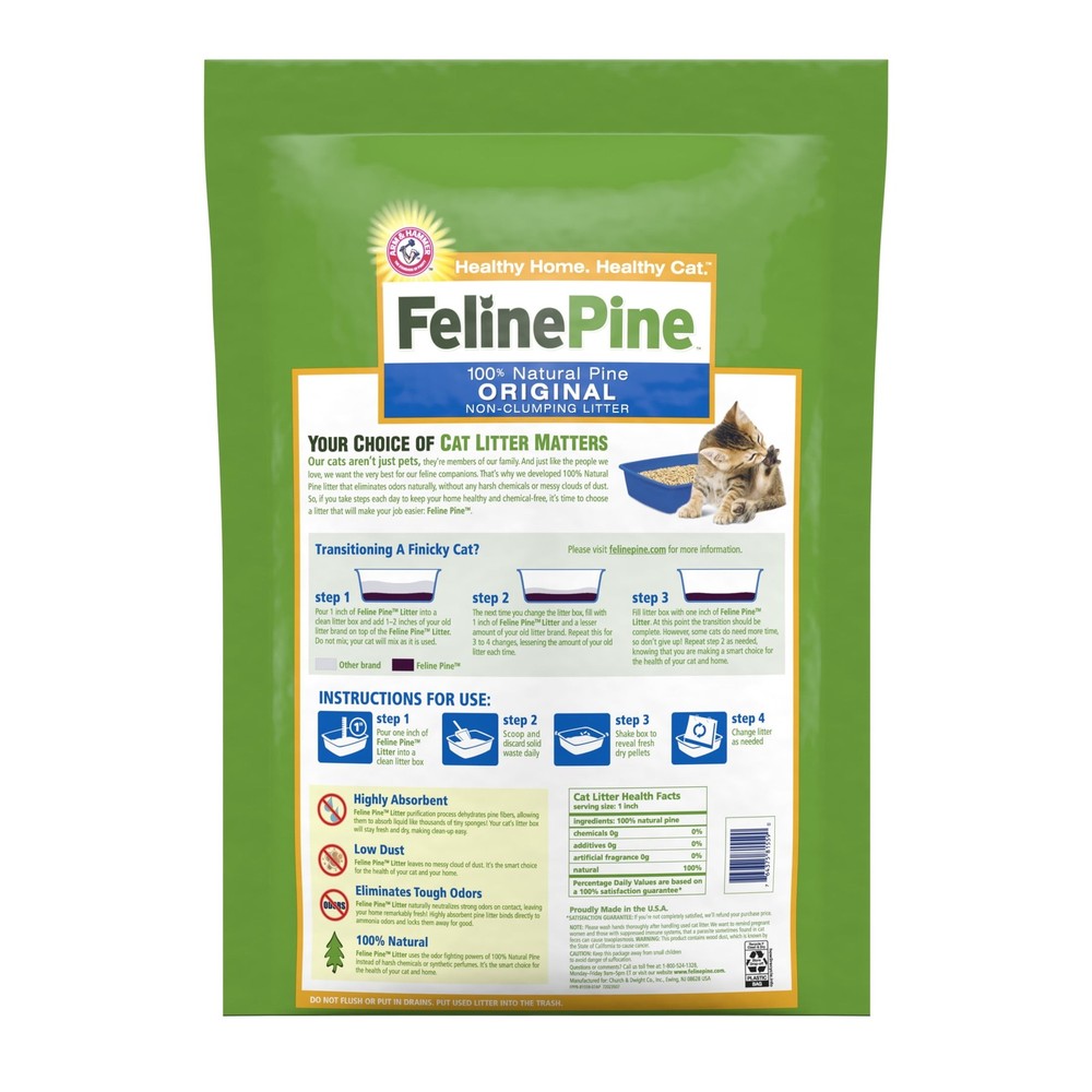 Odor control is important when it comes to your cat’s litter box, but you want a natural option for your feline companion. Feline Pine™ Non-Clumping Pine Pellet Litter delivers the best natural odor control with no added fragrances, no synthetic perfumes and no harsh chemicals. It’s responsibly made from highly absorbent, sustainably sourced natural pine shavings only from reclaimed lumber (no new trees cut down) that neutralize odor on contact. Its absorbent pine fibers work like thousands of tiny sponges to soak up liquid and lock away odors in your kitty litter box. Its natural odor-eliminating pine shavings are a litter choice that’s gentle on kitty’s paws. It’s also low dust and lightweight—less than half the weight of clay litter and leaves no messy cloud of dust. NATURAL WITH NO HARSH CHEMICALS. This natural non-clumping cat litter is an effective odor eliminator that’s made with simple plant-based ingredients like natural pine shavings. It uses the odor fighting power of Natural Pine instead of harsh chemicals or synthetic perfumes. BEST NATURAL ODOR CONTROL WITH NO ADDED FRAGRANCES. Naturally keep your kitty litter box fresh because its natural pine fibers lock away ammonia odors and neutralize them on contact. Eliminate the toughest odors with plant based ingredients instead of harsh chemicals or synthetic perfumes. HIGHLY ABSORBENT PINE LOCKS AWAY ODORS. The pine shavings in this lightweight non-clumping cat litter work like thousands of tiny sponges to soak up liquid and lock away ammonia odors to keep the litter box fresh and dry. LIGHTWEIGHT so changing and refilling the cat litter box is fast and easy. That’s because this absorbent non-clumping kitty litter is natural and less than half the weight of clay litter, and leaves no messy cloud of dust. TOUGH ON ODORS, GENTLE ON PAWS. Made from lightweight pine shavings that are sustainably sourced from reclaimed pine lumber with no new trees cut down. This natural non-clumping cat litter is also a safe litter choice that’s gentle on kitty’s paws.