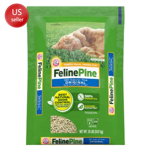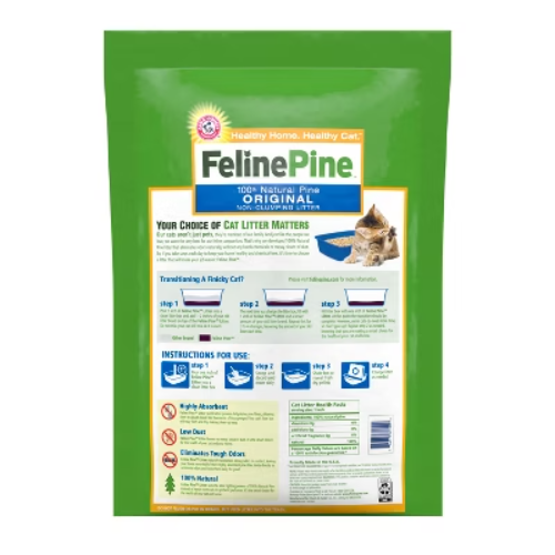 Description Odor control is important when it comes to your cat’s litter box, but you want a natural option for your feline companion. Feline Pine™ Non-Clumping Pine Pellet Litter delivers the best natural odor control with no added fragrances, no synthetic perfumes and no harsh chemicals. It’s responsibly made from highly absorbent, sustainably sourced natural pine shavings only from reclaimed lumber (no new trees cut down) that neutralize odor on contact. Its absorbent pine fibers work like thousands of tiny sponges to soak up liquid and lock away odors in your kitty litter box. Its natural odor-eliminating pine shavings are a litter choice that’s gentle on kitty’s paws. It’s also low dust and lightweight—less than half the weight of clay litter and leaves no messy cloud of dust. highlights NATURAL WITH NO HARSH CHEMICALS. This natural non-clumping cat litter is an effective odor eliminator that’s made with simple plant-based ingredients like natural pine shavings. It uses the odor fighting power of Natural Pine instead of harsh chemicals or synthetic perfumes. BEST NATURAL ODOR CONTROL WITH NO ADDED FRAGRANCES. Naturally keep your kitty litter box fresh because its natural pine fibers lock away ammonia odors and neutralize them on contact. Eliminate the toughest odors with plant based ingredients instead of harsh chemicals or synthetic perfumes. HIGHLY ABSORBENT PINE LOCKS AWAY ODORS. The pine shavings in this lightweight non-clumping cat litter work like thousands of tiny sponges to soak up liquid and lock away ammonia odors to keep the litter box fresh and dry. LIGHTWEIGHT so changing and refilling the cat litter box is fast and easy. That’s because this absorbent non-clumping kitty litter is natural and less than half the weight of clay litter, and leaves no messy cloud of dust. TOUGH ON ODORS, GENTLE ON PAWS. Made from lightweight pine shavings that are sustainably sourced from reclaimed pine lumber with no new trees cut down. This natural non-clumping cat litter is also a safe litter choice that’s gentle on kitty’s paws.