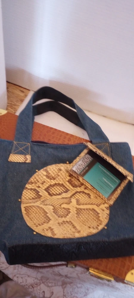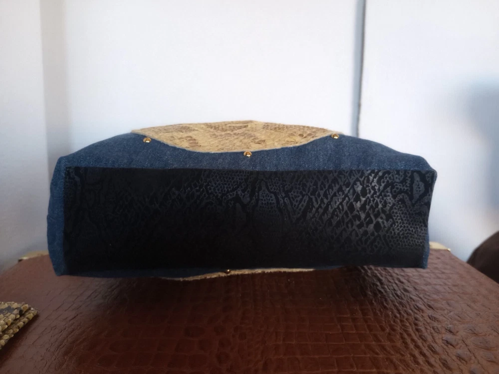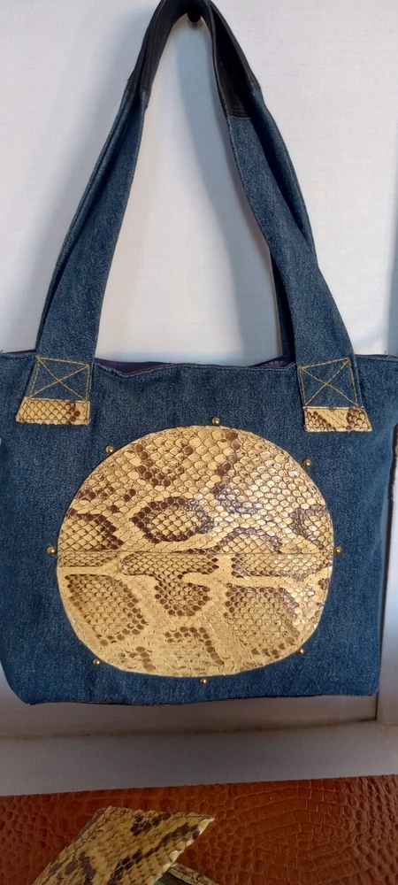 This beautiful hand/shoulder purse is a must-have for any fashion-forward woman. The exterior is made of high-quality denim, Burmese Python skin, and leather, giving it a unique and stylish look. The zip closure ensures that your belongings are secure, while the medium size and 8-inch width provide ample space for all your essentials. The lining is made of multicolor fabric, complementing the exterior colors of blue. The handle/strap material is also denim, adding to the durability and style of the purse. This Pure Snakeskin Accessories brand card is a great addition to any collection.