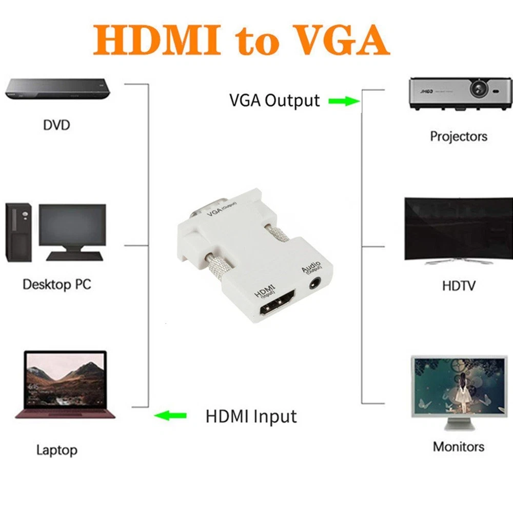 This HDMI to VGA adapter is a lifesaver for connecting modern laptops to older monitors or projectors! Super compact and easy to use—just plug it in and it works instantly with no extra drivers. The picture quality is crisp at 1080p, and the included audio cable is super handy. Perfect for presentations, movies, or gaming..