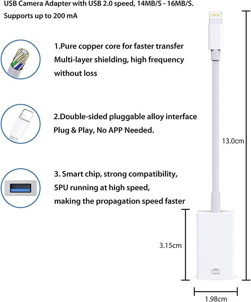 OTG USB to camera adapter for iphone supprot USB Flash Drive, MIDI Keyboard HOW TO USE: Connect the USB Camera Adapter to iPhone/iPad, open the Photos app, which let you choose photos and videos to import, then organizes them into albums. for iOS13+,You can transsfer picture,video,MP3 files,MP4 files,Excel,Word,PPT,PDF on Files App. PLUG AND PLAY: Easy to use, No need to take out the memory card from the camera, fast and stable connection. With the USB Camera Adapter, you can transfer photos & videos from your high-resolution digital camera to your Phone and Pad directly. You can also share the human scenery along the way with your family or friends anytime, anywhere, and share the unforgettable moments you encounter. Peripherals Supported: Digital camera, SLR Camera, USB Flash Drive, Card reader, USB Headphone, guitar, MIDI keyboard, etc.(The maximum current of the peripherals does not exceed 500 mAh). Do NOT support the printer, hard disk drive. Partial support with Ethernet, DAC. With USB 2.0 speed, 14MB/S - 16MB/S. Compatible Device: This adapter compatible with multiple devices, such as iPhone 11/Xs/Xs Max/X/8/8 Plus/7/7Plus/6/6 Plus/5/5S/SE and iPad Air /Mini /Pro (under folder:DCIM. The iPhone 7 and later models can read 4K video.) Support iOS 9.2- iOS16 and before - No APP Needed. Buyer Note: If you are satisfied with our service, we appreciate you leaving us a positive feedback and 5 star rating review! Your opinion is important to the success of our business. If you are not satisfied with the product or have not received the product for more than 35 days, please contact us to resolve, we will do our best to solve. We are sure to come up with a satisfactory solution. Please contact us first before leaving cold feedback or good feedback of 1-3 stars and opening the case. We'll do our best to solve your problem. Because we believe that everything can be solved through communication. Thank you very much!