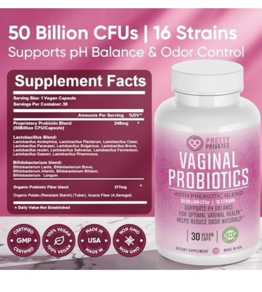 Country/Region of Manufacture:United StatesDosage:50 Billion CFUMPN:NAUPC:850052911751Brand:Pretty PrivatesNumber of Pills:30Type:SupplementFeatures:GMO-Free, Made in USA, VeganIngredients:See LabelActive Ingredients:Lactobacillus Blend, Bifidobacterium Blend, Organic Prebiotic Fiber BlendMain Purpose:Women's Health, Vaginal Health & pH BalanceFormulation:CapsuleFlavor:UnflavoredWhen to Take:With Mealgtin13:850052911751Expiration Date:05/2026Department:Women