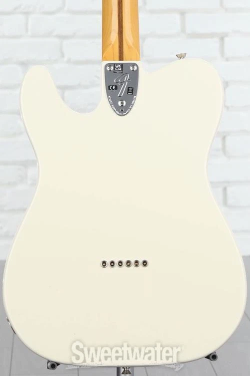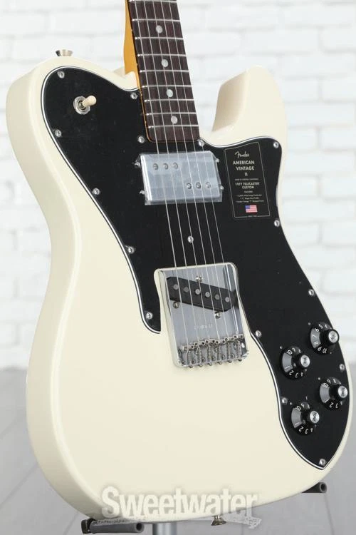 A Vintage-style, Humbucker-equipped Tele Custom The Fender American Vintage II 1977 Telecaster Custom is a meticulous reimagining of one of the company's earlier forays into humbucking pickups. The '77 Tele Custom includes a balanced-sounding solid alder body, while its year-specific Pure Vintage '77 Telecaster pickups yield everything from thick humbucker tones to jangly single-coil sounds with loads of twangy bite. You'll appreciate the effortless playability of this guitar's "C"-shaped, hard-rock maple neck and vintage-radius rosewood fingerboard. The American Vintage II 1977 Tele Custom is replete with period-correct appointments, including skirted plastic knobs, a 6-saddle bridge with steel barrel saddles, "F"-stamped tuning machines, a 3-bolt neck plate, and a head-turning gloss polyurethane finish on the body and neck. Owning an American Vintage II '77 Tele Custom is like owning a piece of Fender history. If you've yearned for a humbucker-equipped Tele, you'll find the American Vintage II 1977 Telecaster Custom eminently Sweetwater is an Authorized Fender Dealer Genuine New Item Sweetwater's 2-year warranty and 55 point inspection Fender American Vintage II 1977 Telecaster Custom Electric Guitar - Olympic Solidbody Electric Guitar with Alder Body, Maple Neck, Rosewood Fingerboard, 1 Single-coil Pickup, and 1 Humbucking Pickup - Olympic White A Vintage-style, Humbucker-equipped Tele Custom The Fender American Vintage II 1977 Telecaster Custom is a meticulous reimagining of one of the company's earlier forays into humbucking pickups. The '77 Tele Custom includes a balanced-sounding solid alder body, while its year-specific Pure Vintage '77 Telecaster pickups yield everything from thick humbucker tones to jangly single-coil sounds with loads of twangy bite. You'll appreciate the effortless playability of this guitar's "C"-shaped, hard-rock maple neck and vintage-radius rosewood fingerboard. The American Vintage II 1977 Tele Custom is replete with period-correct appointments, including skirted plastic knobs, a 6-saddle bridge with steel barrel saddles, "F"-stamped tuning machines, a 3-bolt neck plate, and a head-turning gloss polyurethane finish on the body and neck. Owning an American Vintage II '77 Tele Custom is like owning a piece of Fender history. If you've yearned for a humbucker-equipped Tele, you'll find the American Vintage II 1977 Telecaster Custom eminently satisfying. Loaded with period-accurate appointments The American Vintage II 1977 Telecaster Custom is a spot-on re-creation of a Fender classic. This electric guitar features a solid alder body. This lightweight wood offers an incredibly balanced acoustic tone, yielding uniform quantities of lows, mids, and highs, and boasts a gorgeous gloss polyurethane finish. The 1977 Tele Custom's nickel/chrome hardware includes a 6-saddle bridge with slotted steel barrel saddles, "F"-stamped tuning machines, and a 3-bolt neck plate with Micro-Tilt. You also get skirted plastic control knobs with numbered indicators. Year-specific '77 Pure Vintage pickups, a period-correct neck shape, and vintage-radius fingerboard round out the American Vintage II 1977 Telecaster Custom's classic appointments. Year-specific Pure Vintage pickups When you plug the Fender American Vintage II 1977 Telecaster Custom into your favorite amplifier, you'll be transported straight back to '77. This solidbody electric guitar's Pure Vintage '77 Telecaster single-coil bridge pickup churns out the tight lows, balanced mids, and legendary twang you'd expect from an old-school Tele. In the neck position, you'll find a Seth Lover-designed Wide-Range humbucking pickup with large bobbins and threaded CuNiFe-rod magnets, which have been out of production since 1981. CuNiFe magnets are vital to achieving a period-accurate sound, one that can be best described as an amalgam of humbucker girth and signature Fender chime with distinctive hi-fi character. The Wide-Range humbucker also includes a chrome cover with a "3 3" exposed pole-piece design and an attention-grabbing Fender logo. The American Vintage II 1977 Tele Custom comes complete with independent volume and tone knobs for each pickup, plus a 3-position pickup toggle switch. Effortlessly playable neck When we first picked up the American Vintage II 1977 Telecaster Custom here at Sweetwater, we were blown away by its effortless playability. The '77 Tele Custom's "C"-shaped hard-rock maple neck vaunts Goldilocks dimensions — not too big, not too small — for an eminently comfortable playing experience. You also get a rosewood fingerboard with a vintage 7.25-inch radius and 21 vintage-tall frets, plus a bullet-style truss rod. The neck features a vintage tint, and it's finished with eye-catching gloss polyurethane. Fender American Vintage II 1977 Telecaster Custom Electric Guitar Features: A spot-on re-creation of a 1977 Telecaster Custom Solid alder body offers an incredibly balanced acoustic tone Pure Vintage '77 Telecaster single-coil bridge pickup churns out tight lows, balanced mids, and legendary twang Wide-Range humbucking neck pickup with authentic CuNiFe magnets Skirted plastic control knobs with numbered indicators; 3-position pickup toggle switch "C"-shaped hard-rock maple neck offers an eminently comfortable playing experience Rosewood fingerboard with a vintage, 7.25-inch radius and 21 vintage-tall frets; bullet-style truss rod 6-saddle bridge with slotted steel barrel saddles; "F"-stamped tuning machines; 3-bolt neck plate with Micro-Tilt Eye-catching gloss polyurethane finish on the body and neck Specification Detail Number of Strings 6 Left-/Right-handed Right-handed Body Type Solidbody Body Shape Telecaster Body Material Alder Color Olympic White Body Finish Gloss Polyurethane Neck Material Maple Neck Shape 1977 C Neck Joint 3-way Bolt-on Radius 7.25" Fingerboard Material Rosewood Fingerboard Inlay White Dots Number of Frets 21, Vintage Tall Scale Length 25.5" Nut Width 1.650" Nut Material Bone B